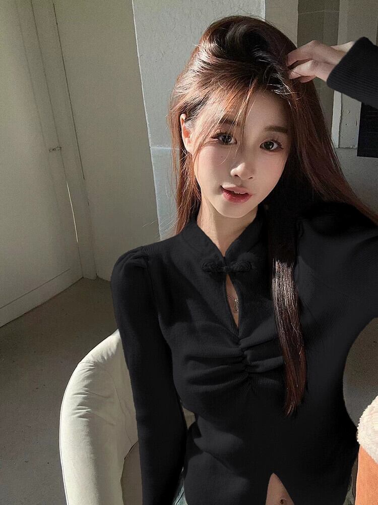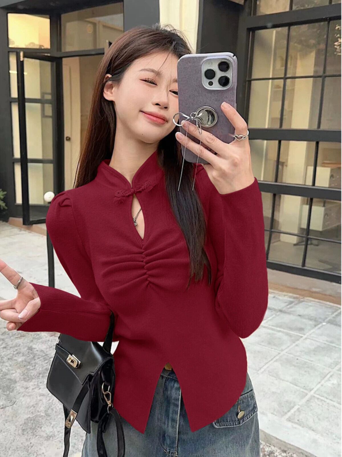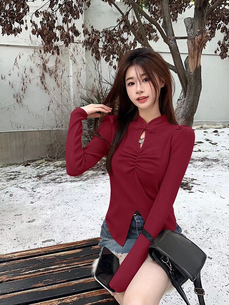 中国風のディスクボタンスタンドカラーセーター女性春と秋 2024 新デザインスリムプリーツ長袖底トップ ロング スプリング 春物 オータム 秋物 missk91260495963