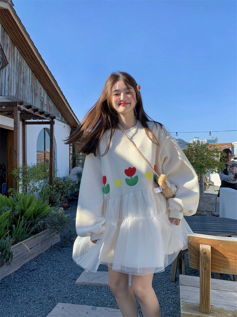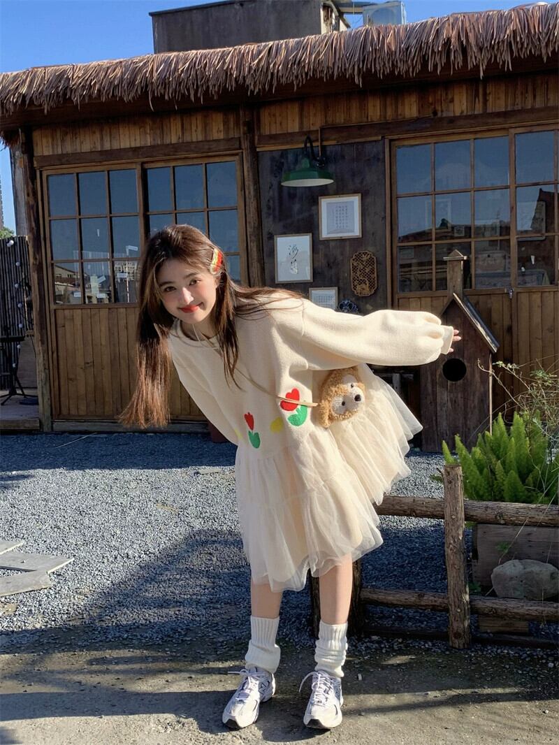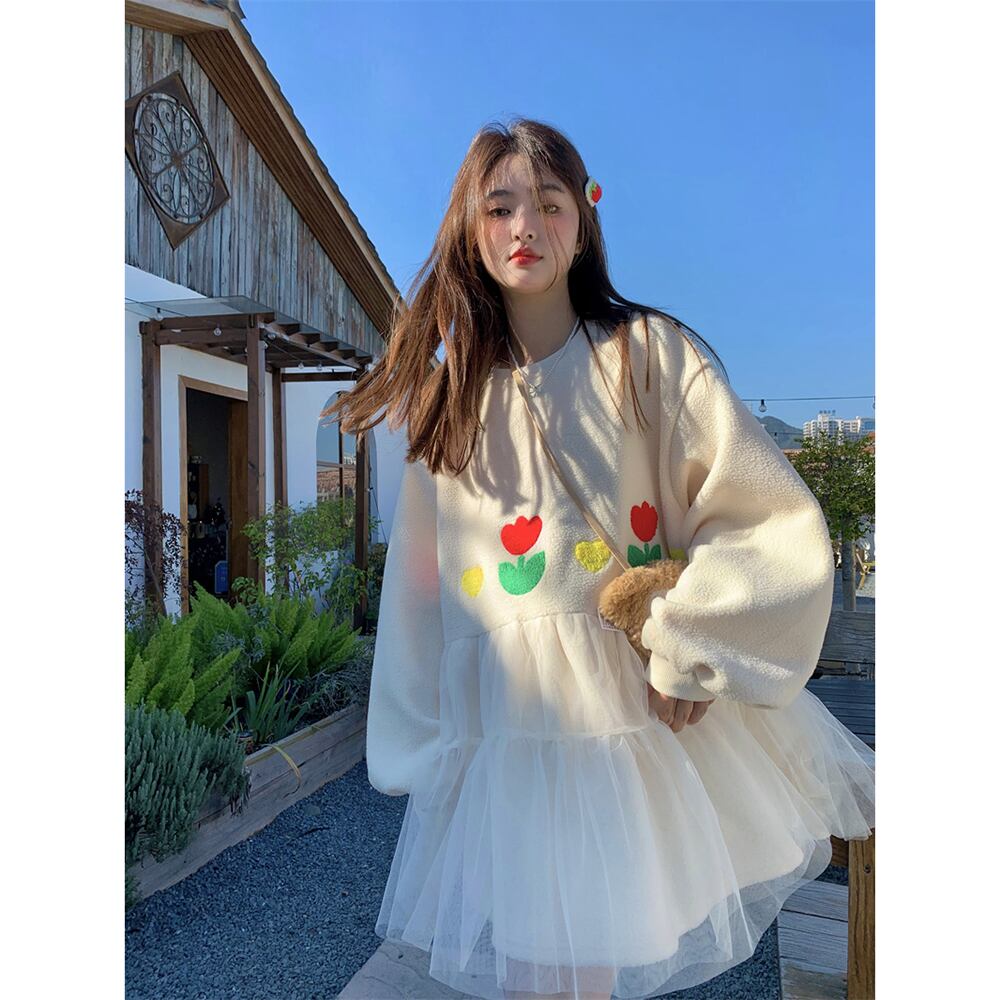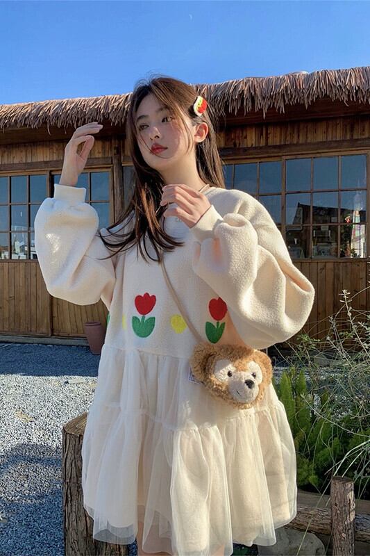 ラムウール肥厚長袖ドレス女性春 2024 新しい甘いスタイル刺繍ステッチデザインスカート ロング 大人ガーリー スウィート キュート カジュアル スプリング 春物 missk36378305095