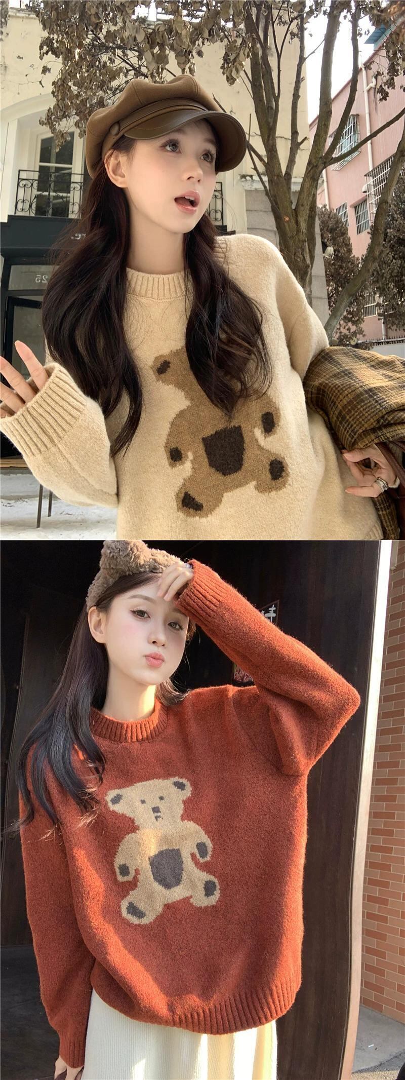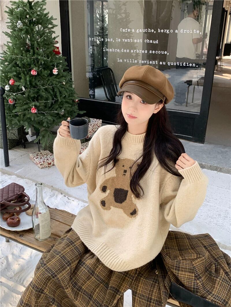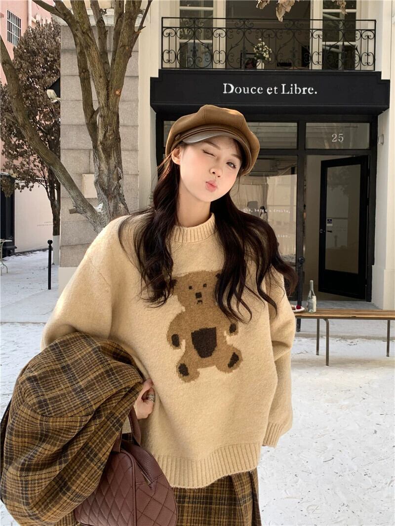 怠惰なスタイルのクマのセーターの女性の 2024 年春の新作メイラードソフトワックス状ラウンドネックルーズ長袖ニットトップ ロング スプリング 春物 Oネック missk85593073412