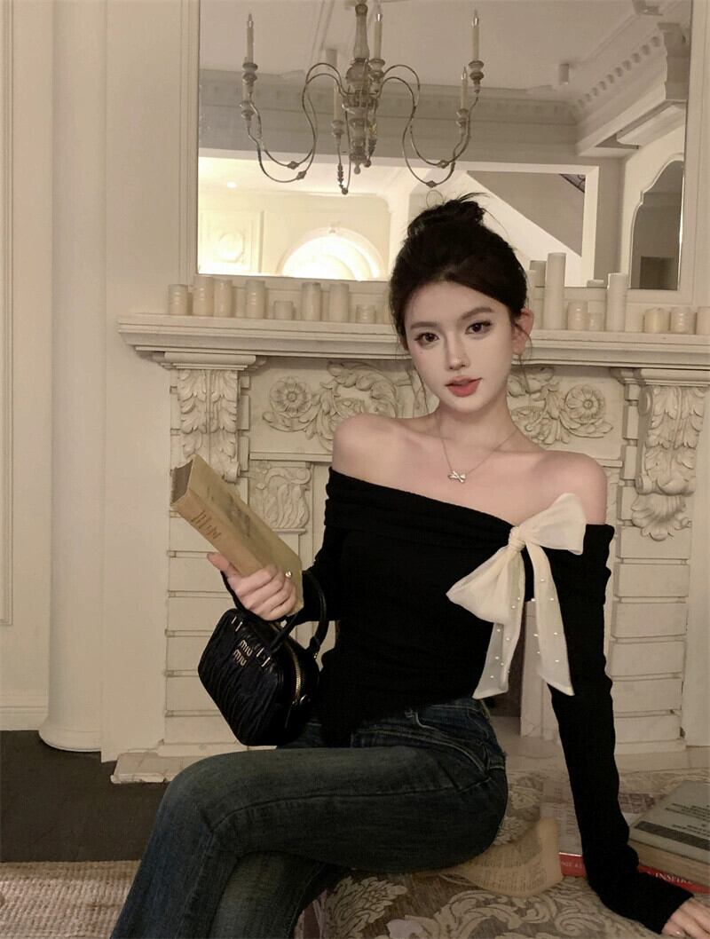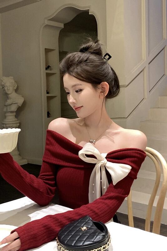 ホットレッドワンショルダーセーター女性の春と秋2024新しいスタイルのリボンデザイン不規則なショートトップ スプリング 春物 オータム 秋物 missk63779521944