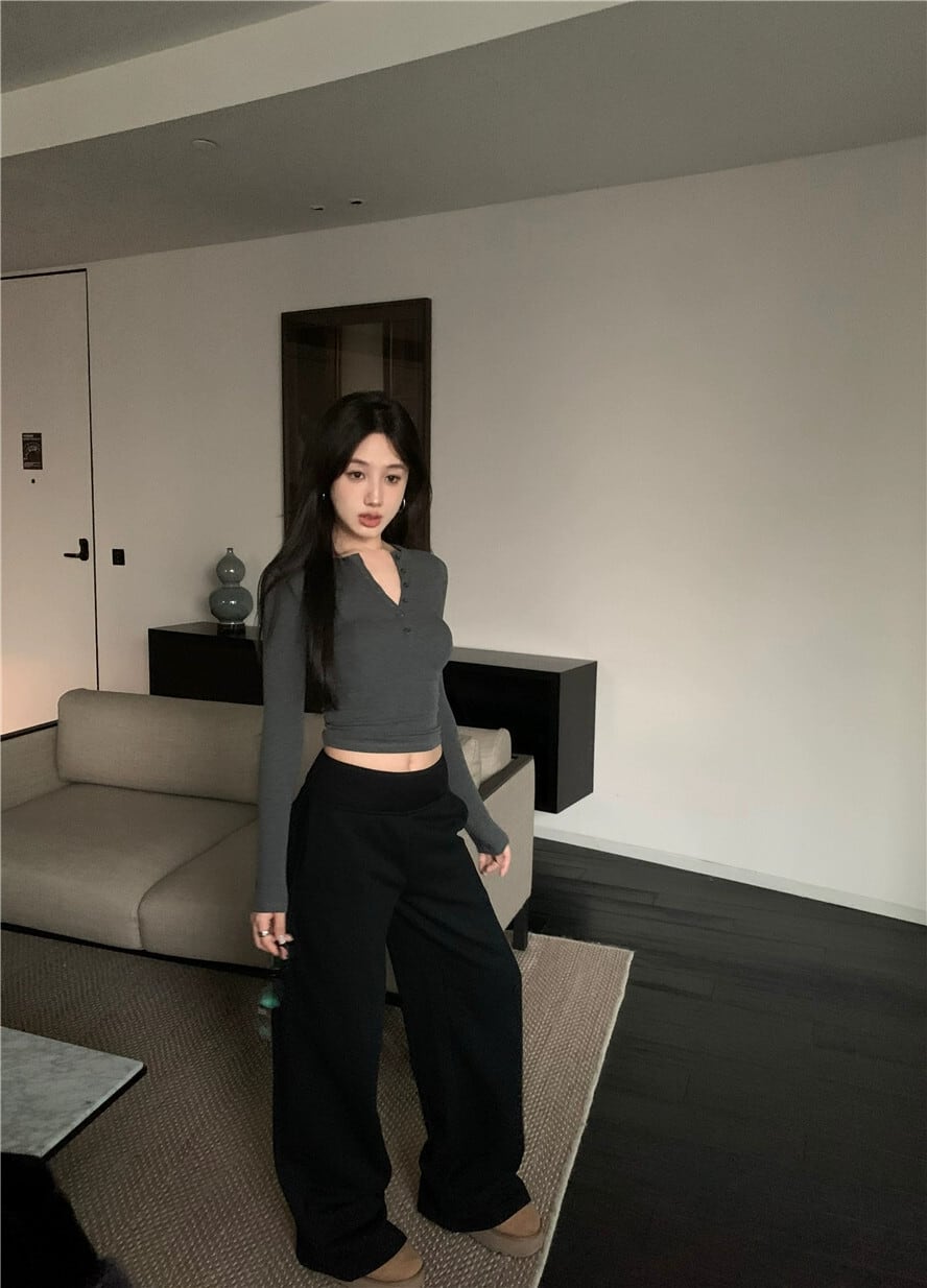 色:ダークブルーのシャツ,コーヒートップ,ライトグレーのトップ,ダークグレートップ,黒いズボン,グレーのズボン