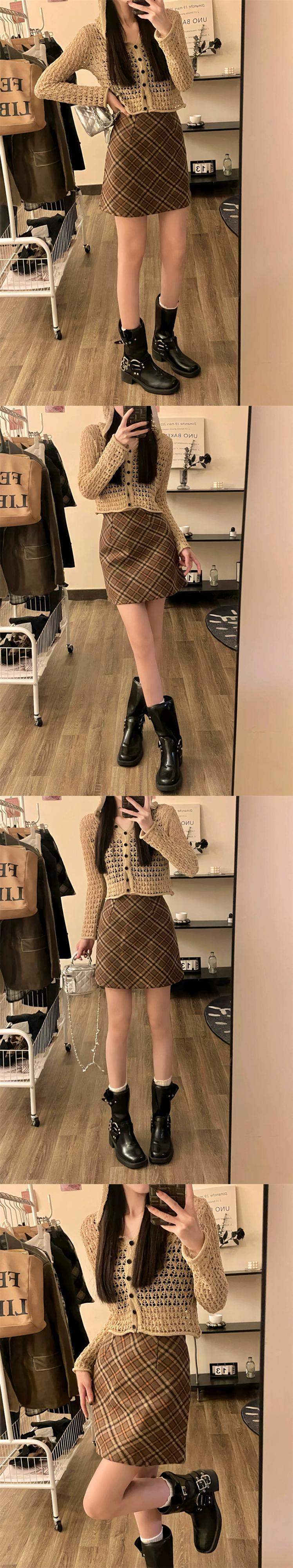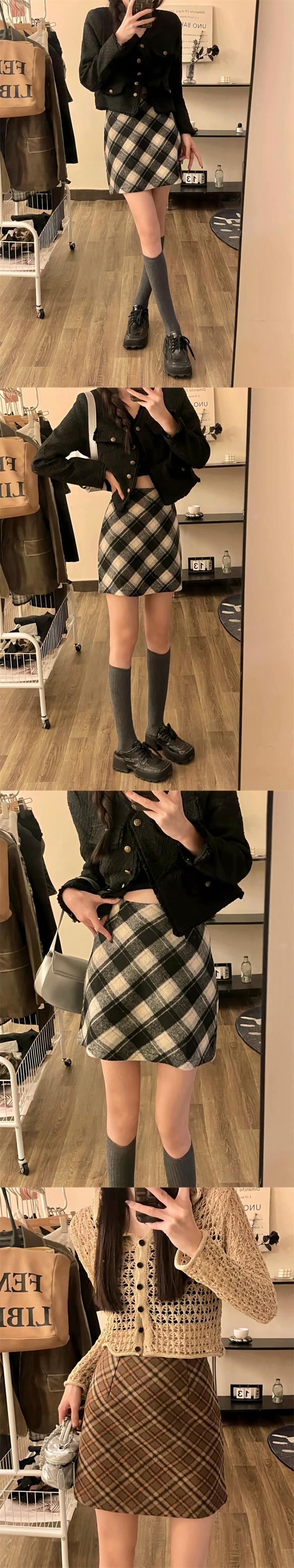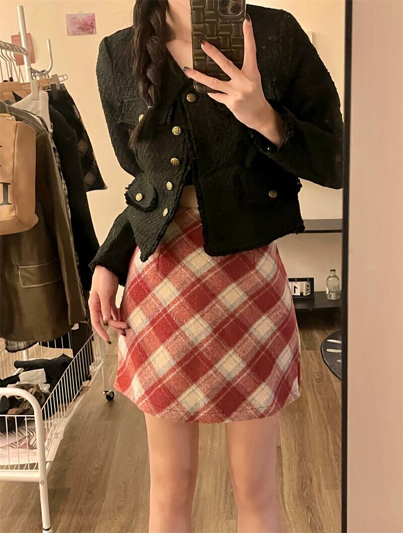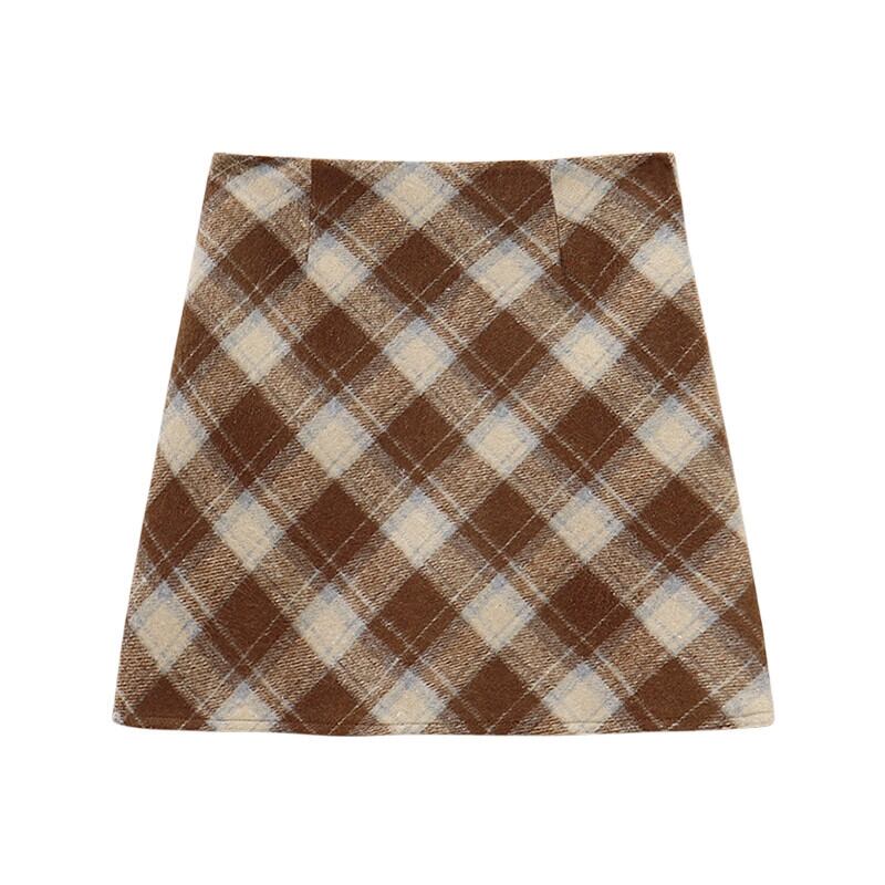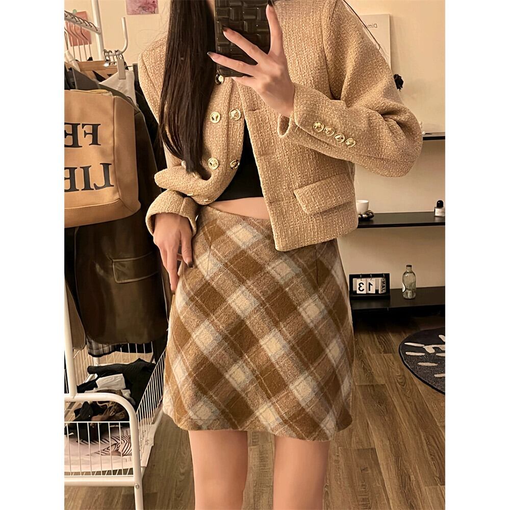 レトロウールチェック柄スカート女性春と秋 2024 新しいスタイルの小さなハイウエストスリム A ラインヒップハグショートスカート スプリング 春物 オータム 秋物 Aライン missk88293530352