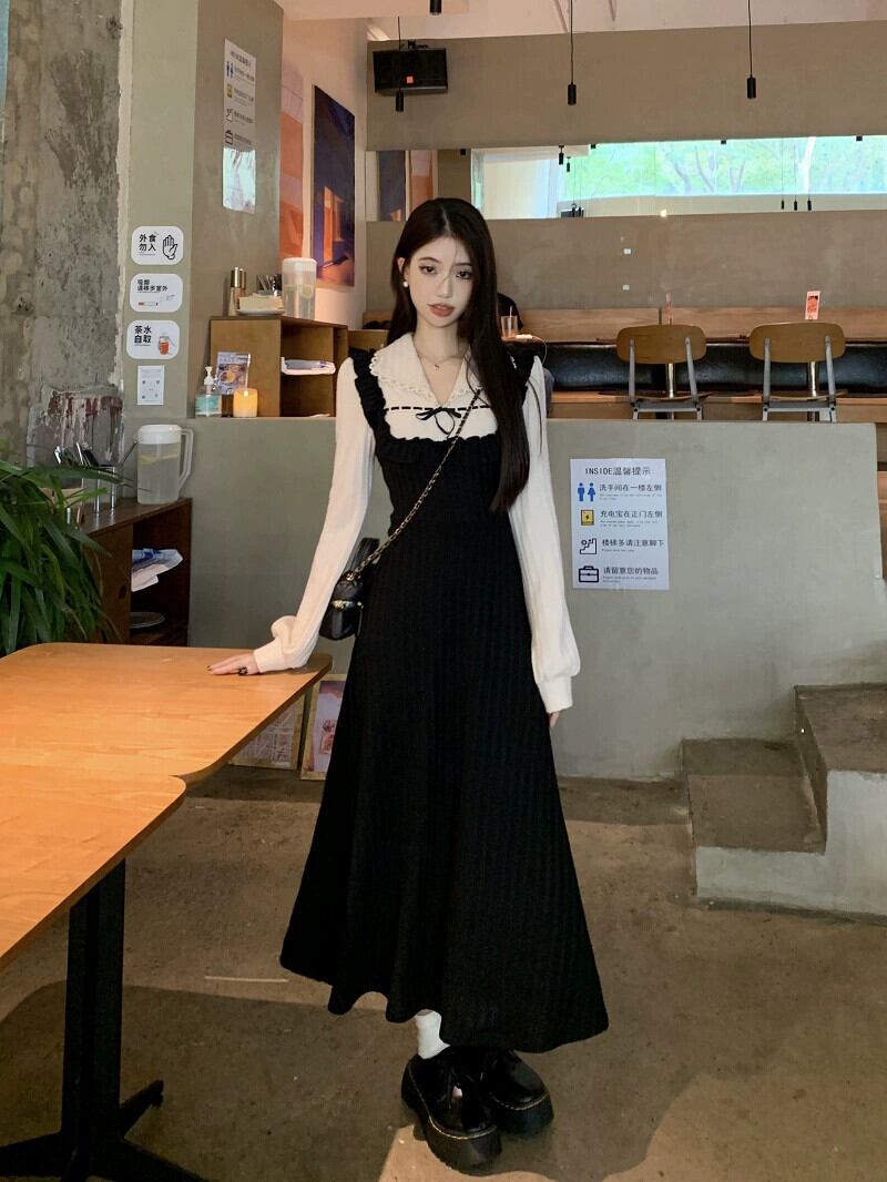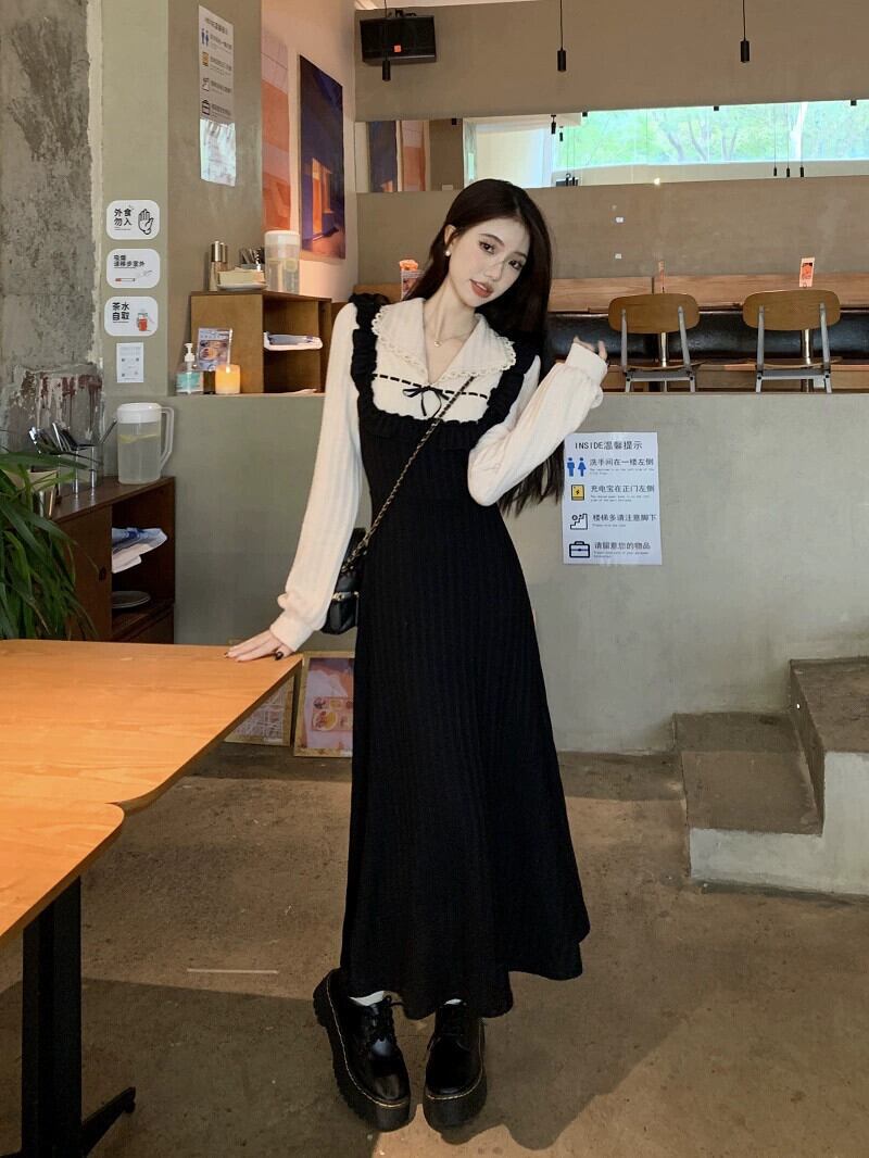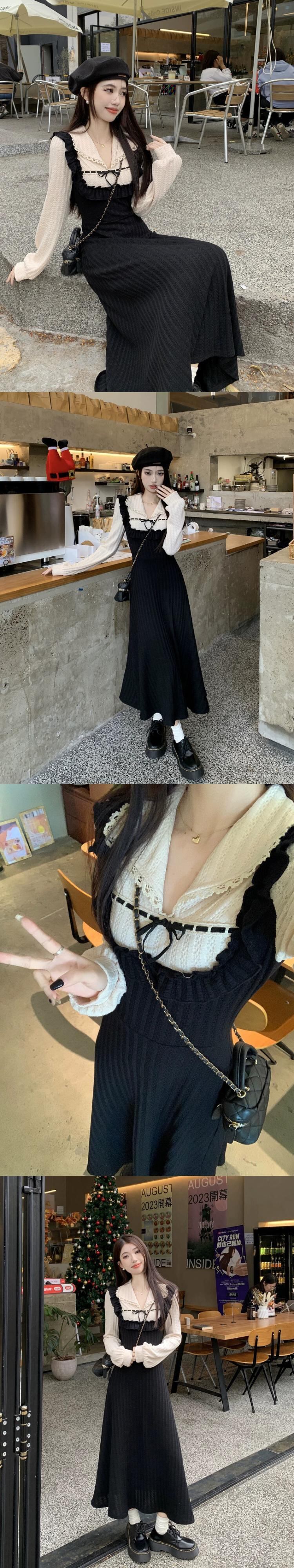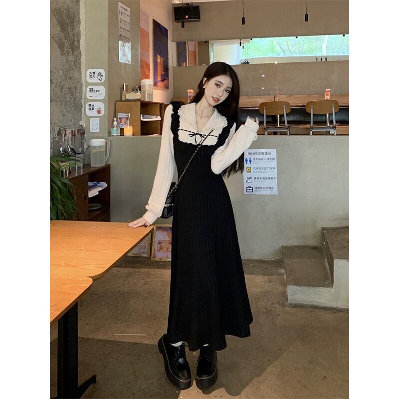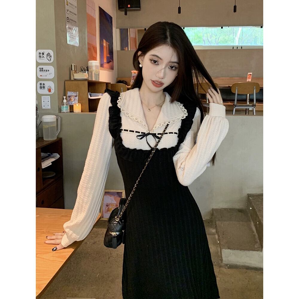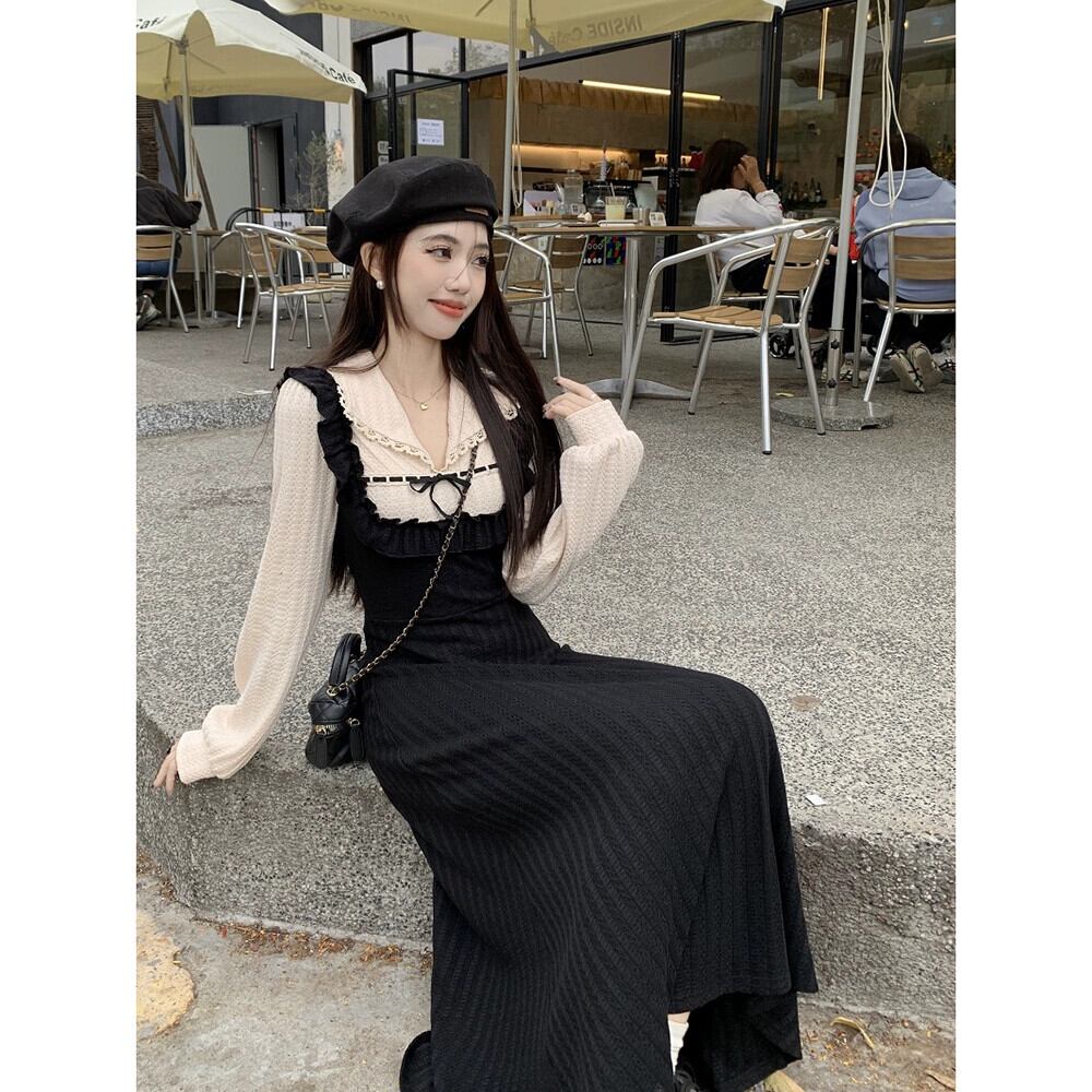 偽ツーピースドレス女性春 2024 新しい甘いフレンチレースパッチワークウエスト痩身長袖スカート ロング 大人ガーリー スウィート キュート カジュアル スプリング 春物 missk54570201223