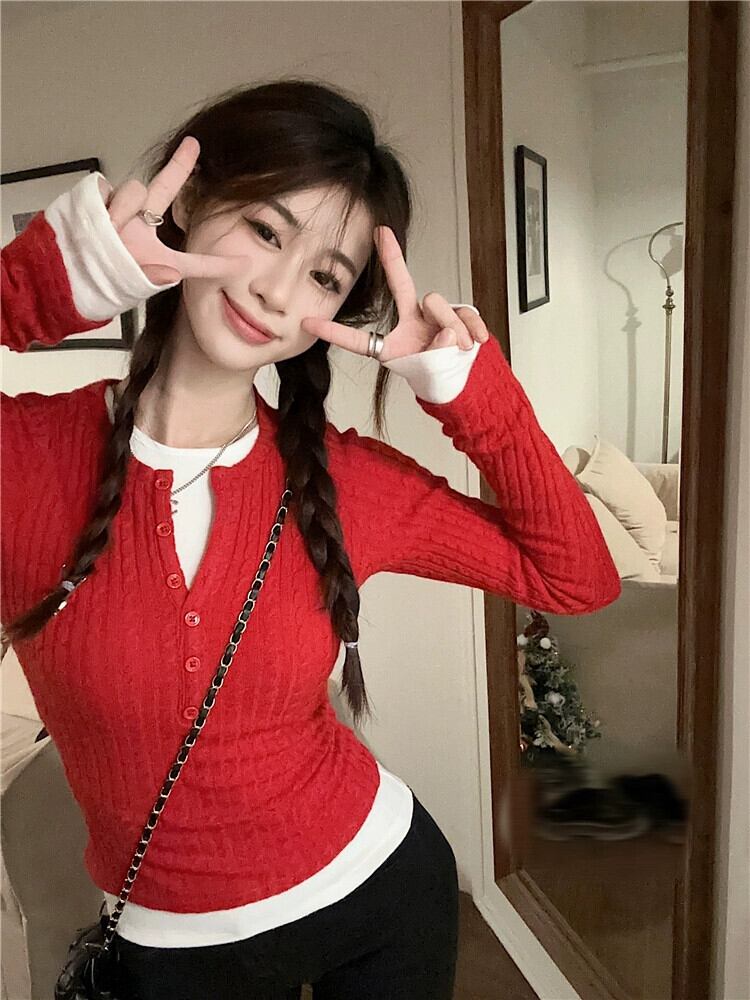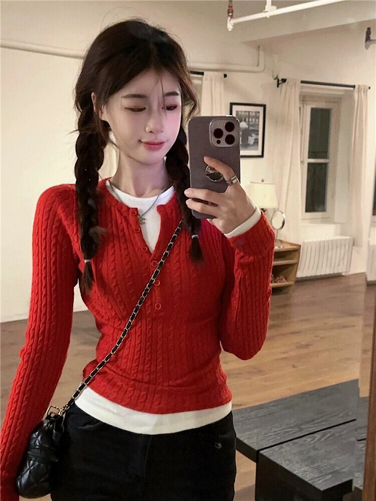 赤いショートニットセーター女性春バージョン 2024 新しいスリムフィットインナーデザイン長袖ボトリングシャツ ロング レッド スプリング 春物 missk75497750966