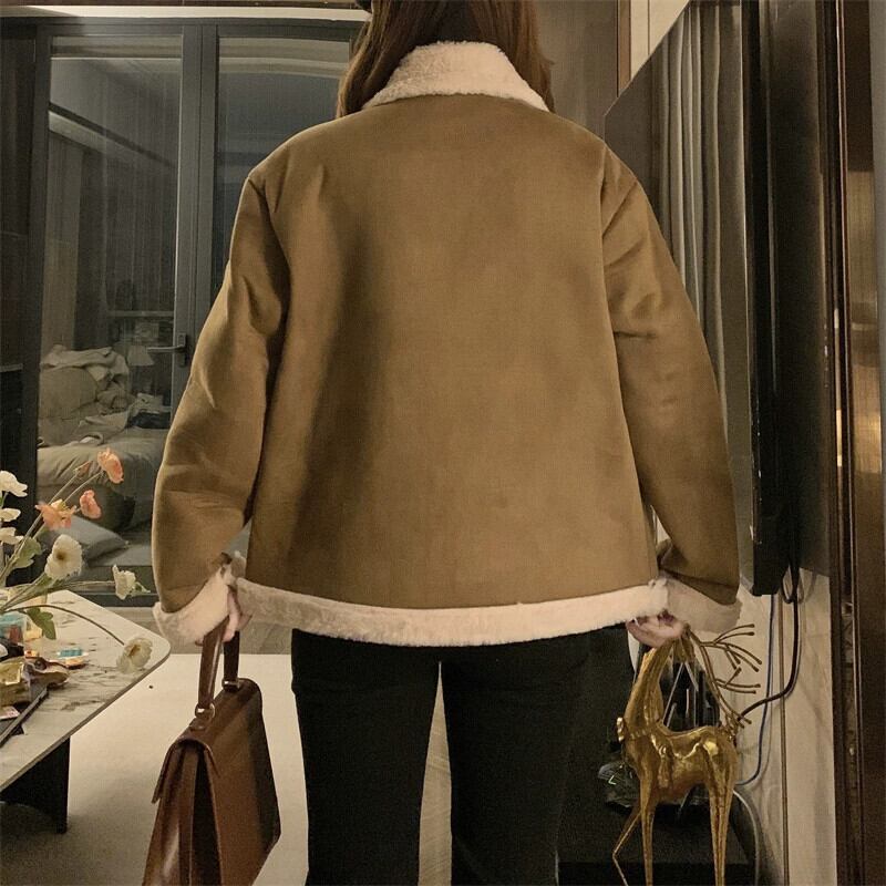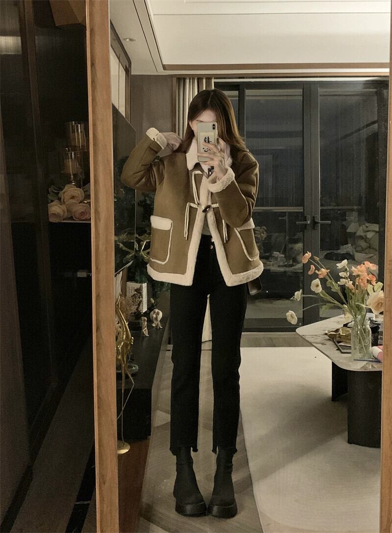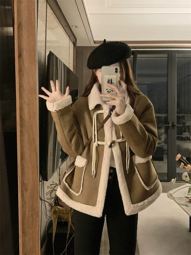 鹿革の毛皮のワンピースジャケットの女性の春 2024 新スタイルフレンチレトロホーンバックル年齢を軽減長袖オートバイジャケット ロング スプリング 春物 missk96582337303