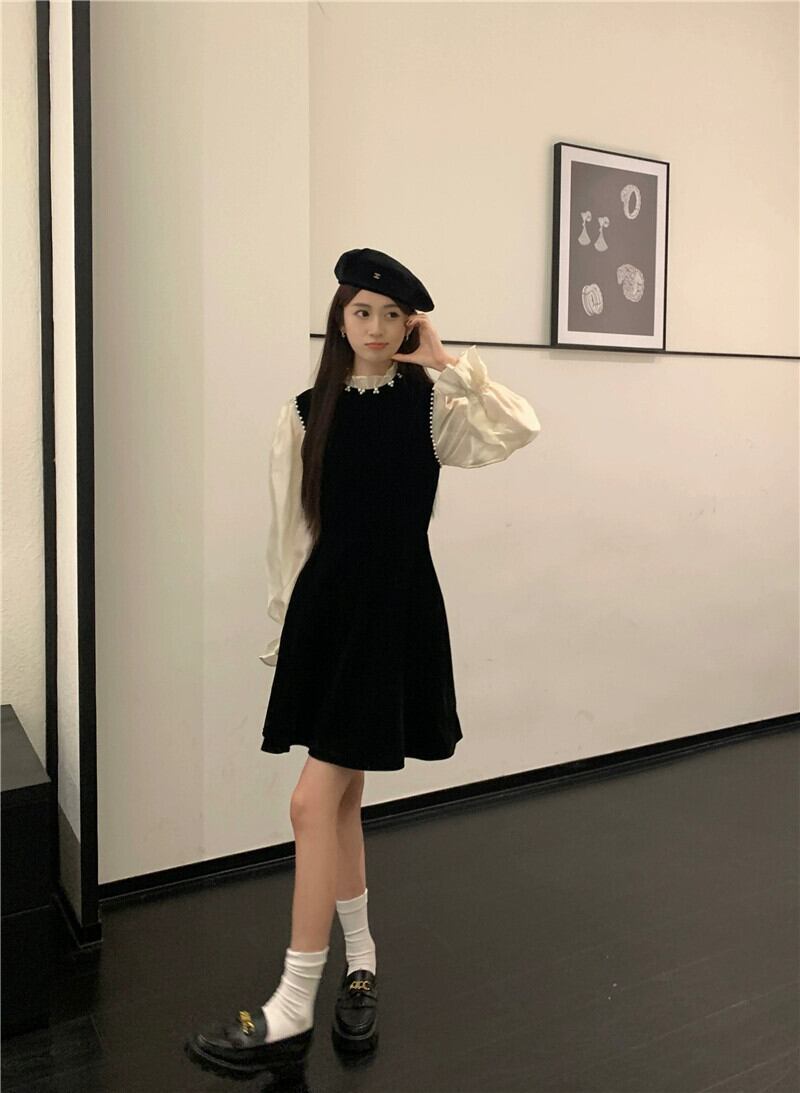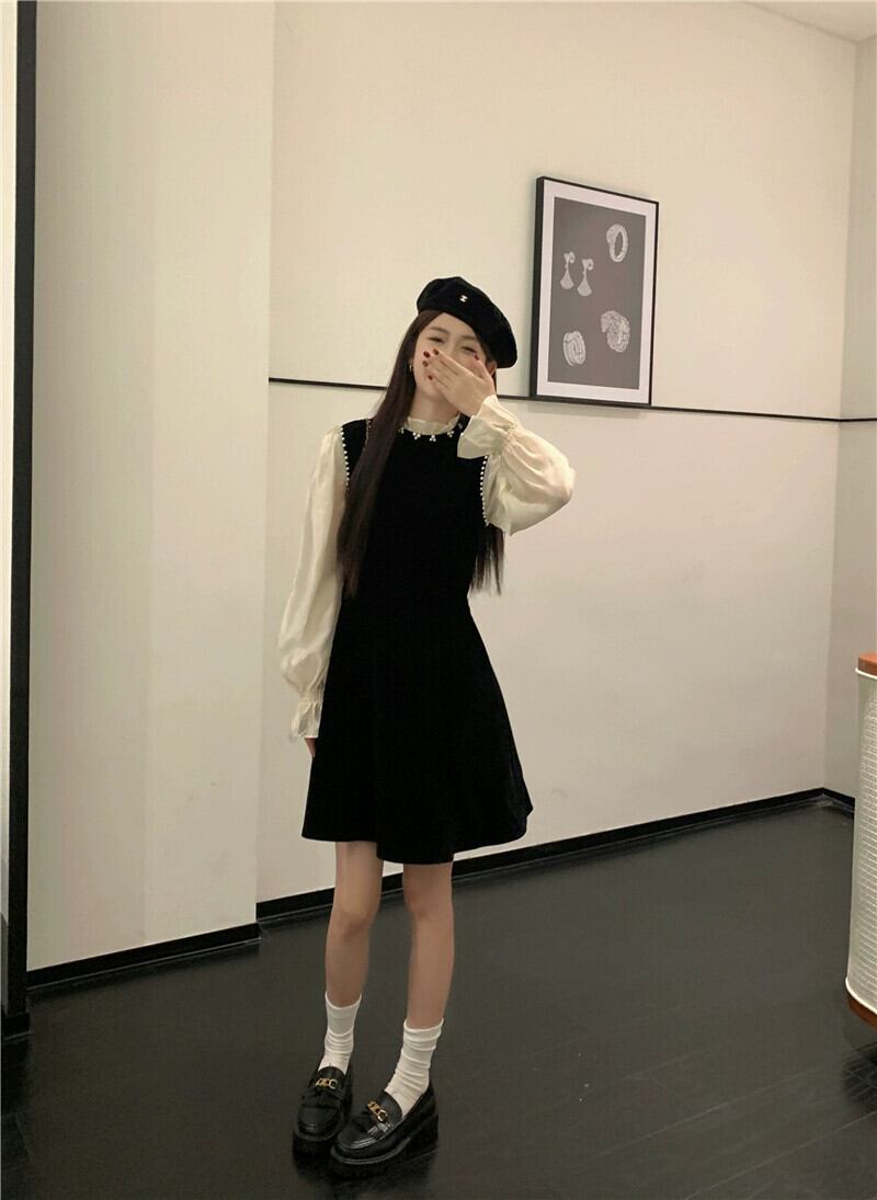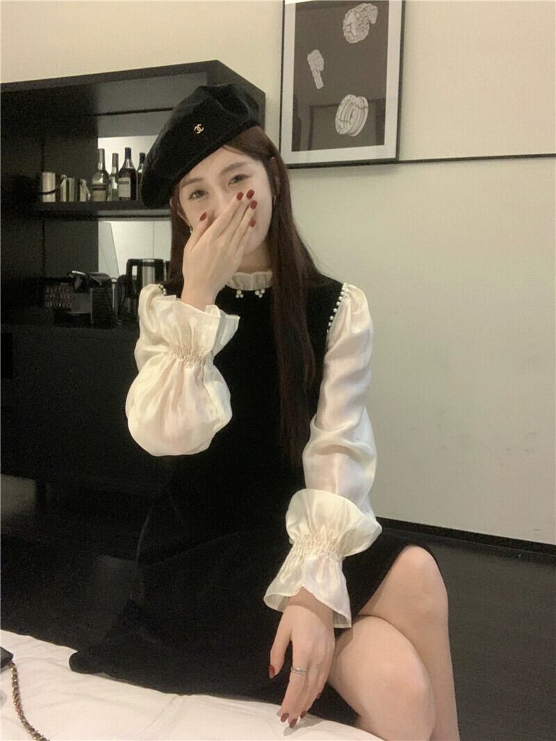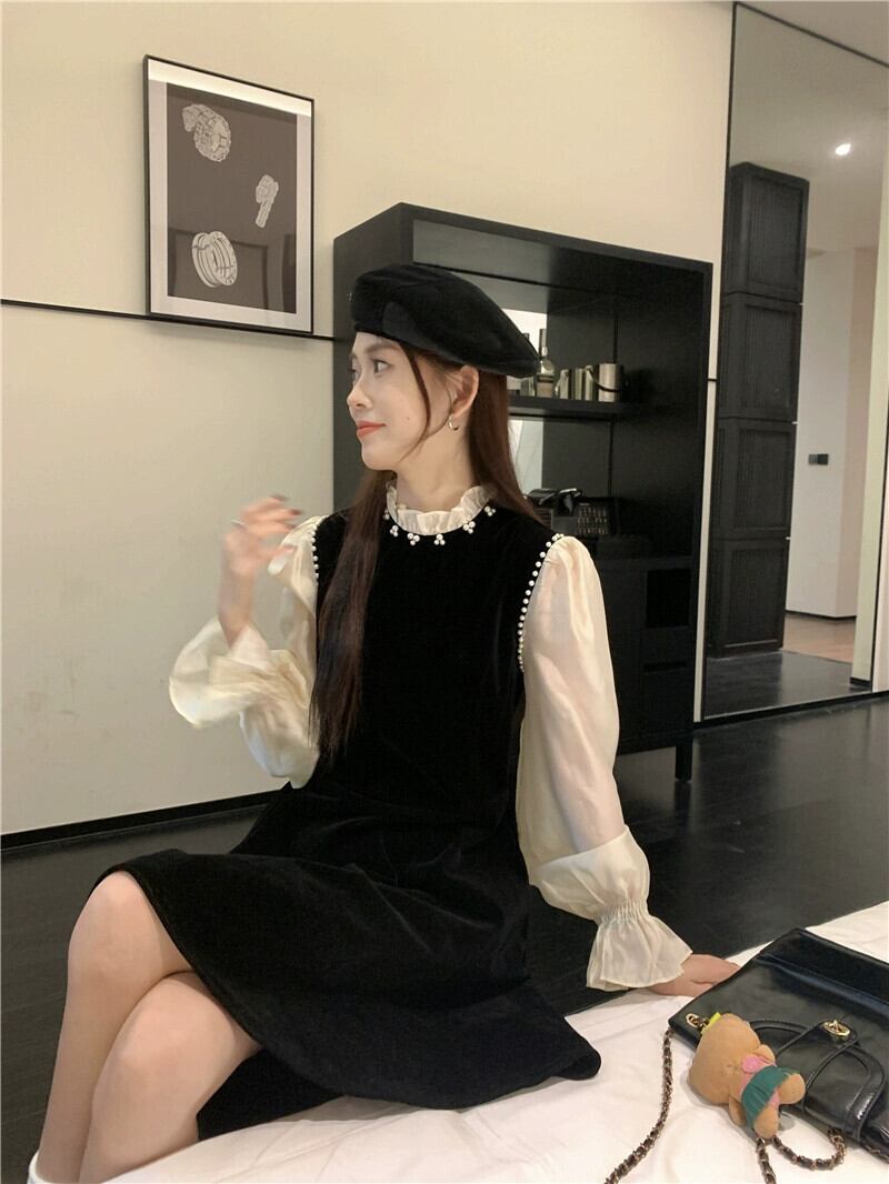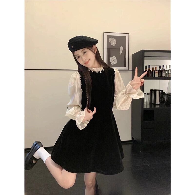 フレンチスタイルのベルベットのドレスの女性、春と秋のレトロな気質、高級リトルブラックドレス、ウエストを細くするショートスカート スプリング 春物 オータム 秋物 missk13606710370