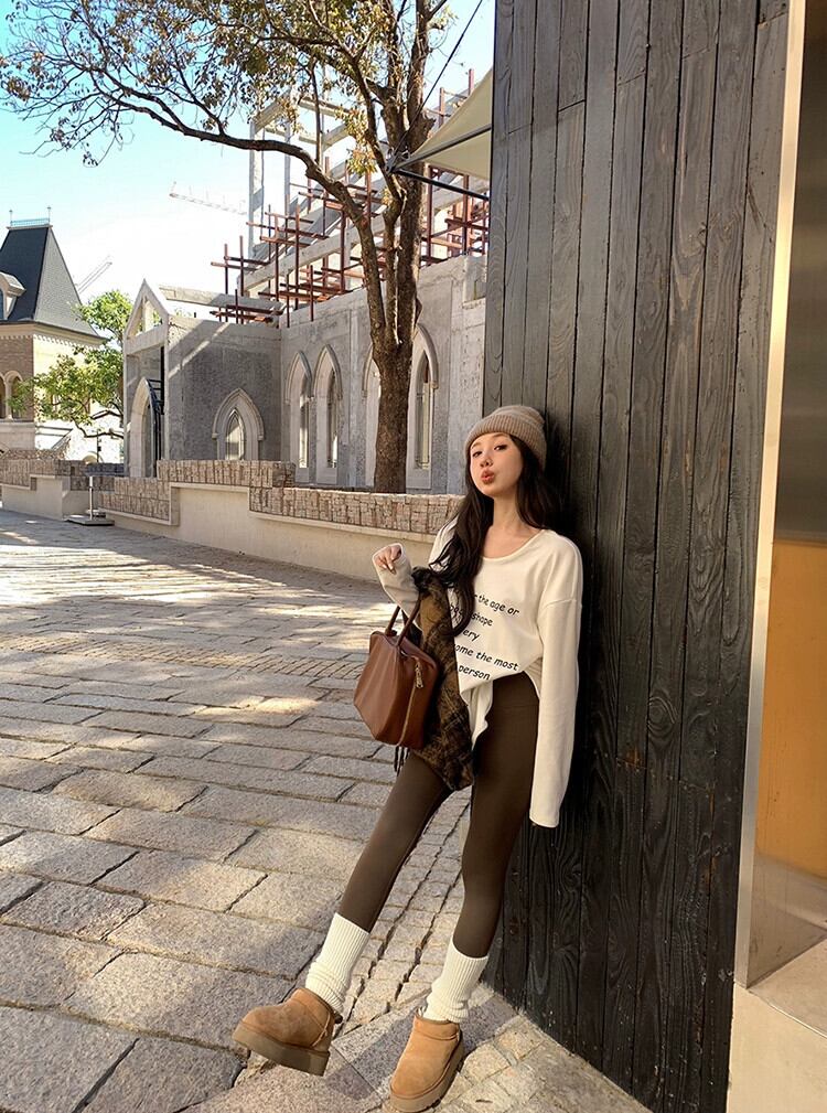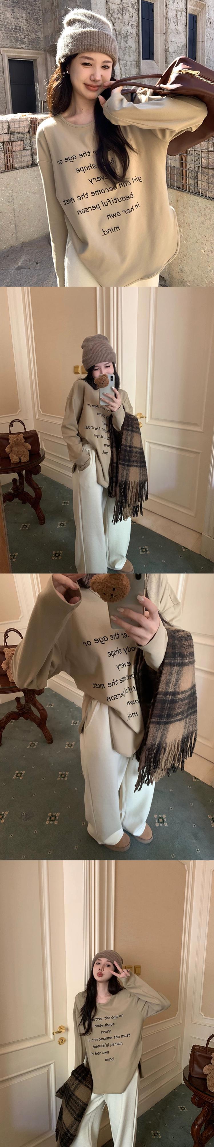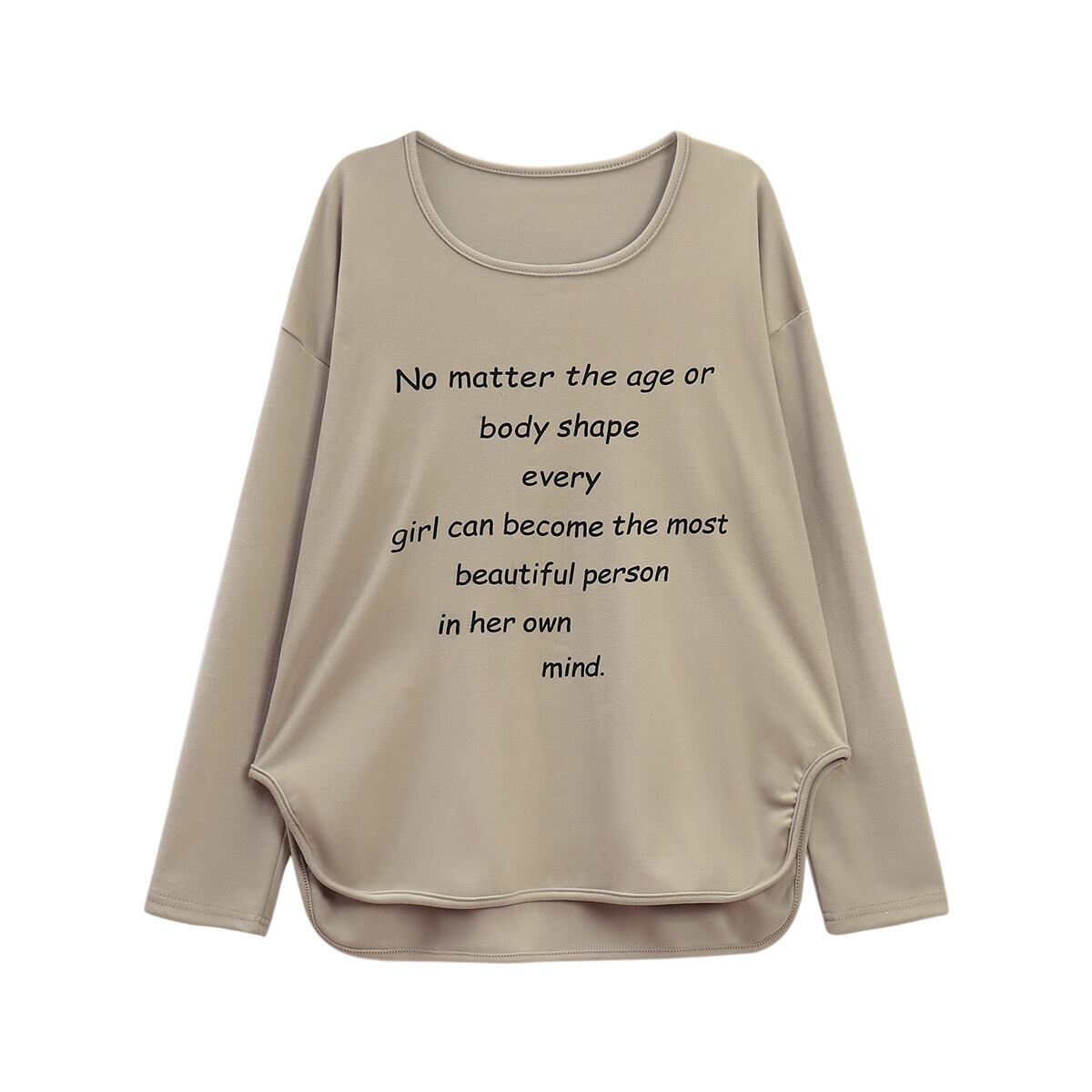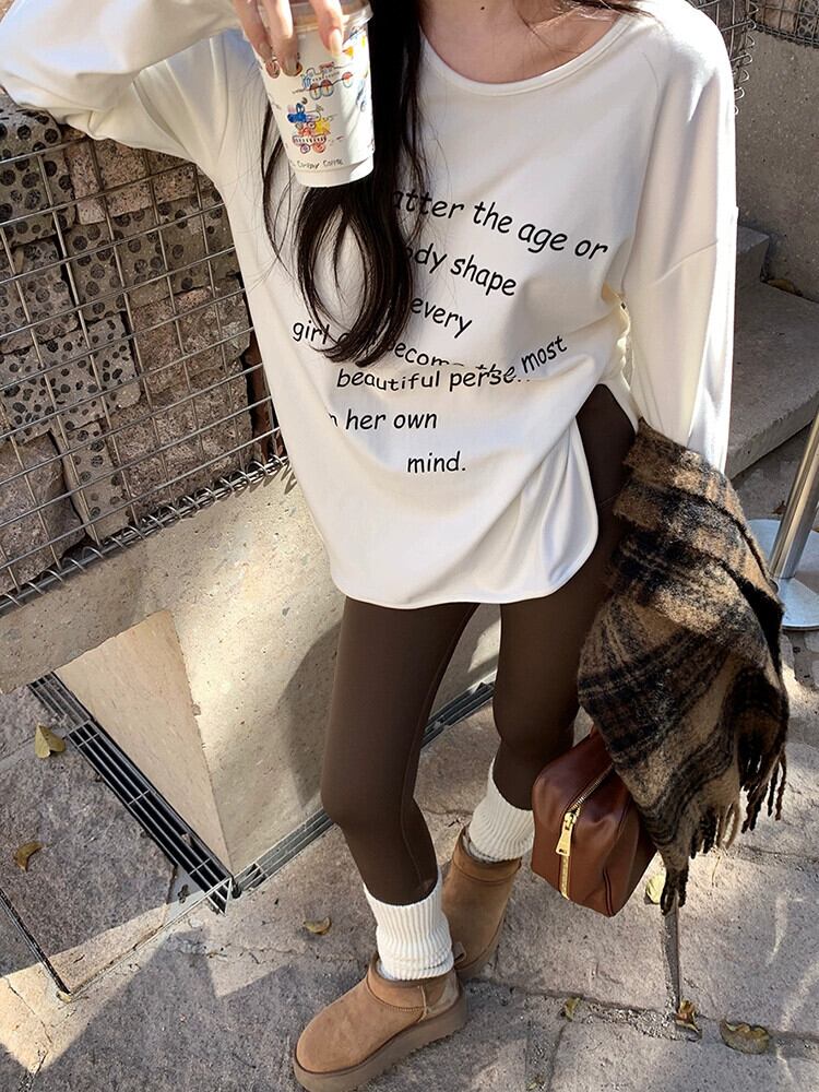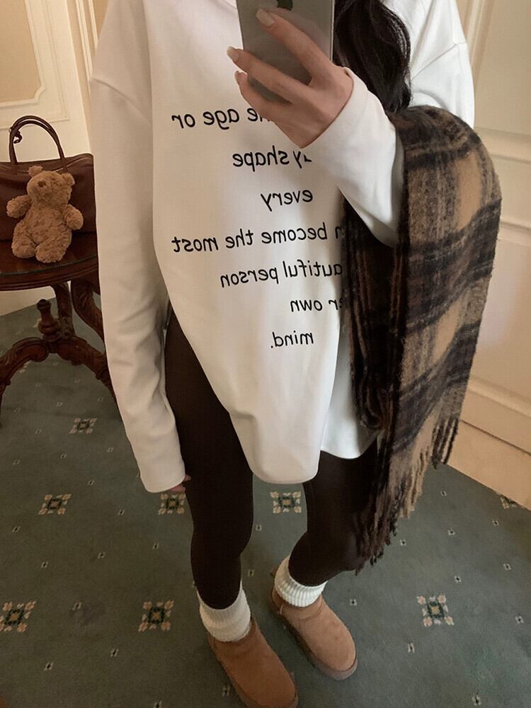 2024 春と秋の白いドイツベルベット底 T シャツの女性の新しいレタープリントルーズミッドレングス長袖トップ ロング ホワイト スプリング 春物 オータム 秋物 Tシャツ missk98477463657