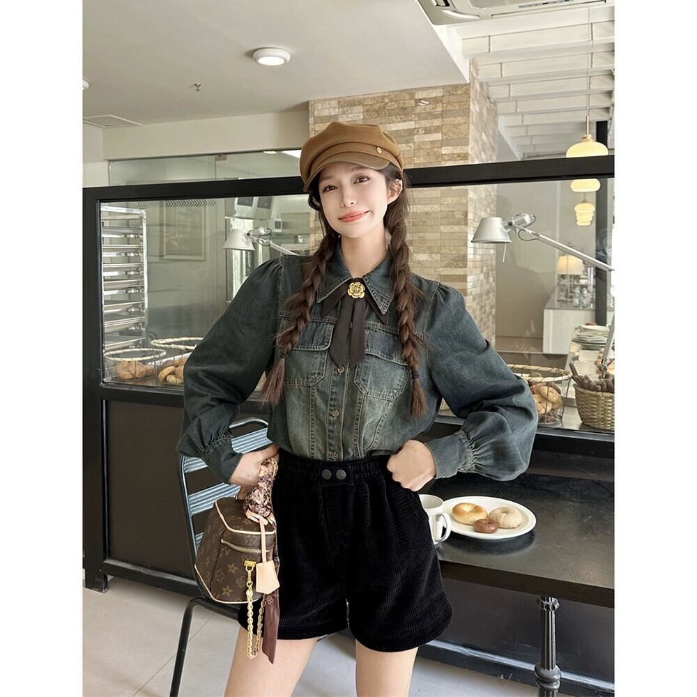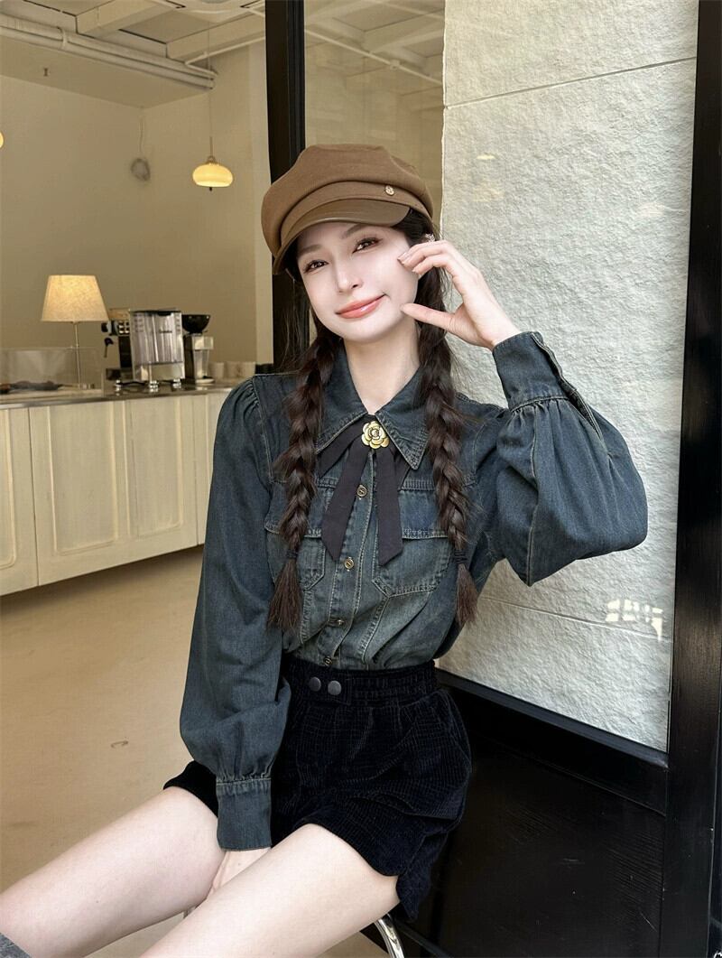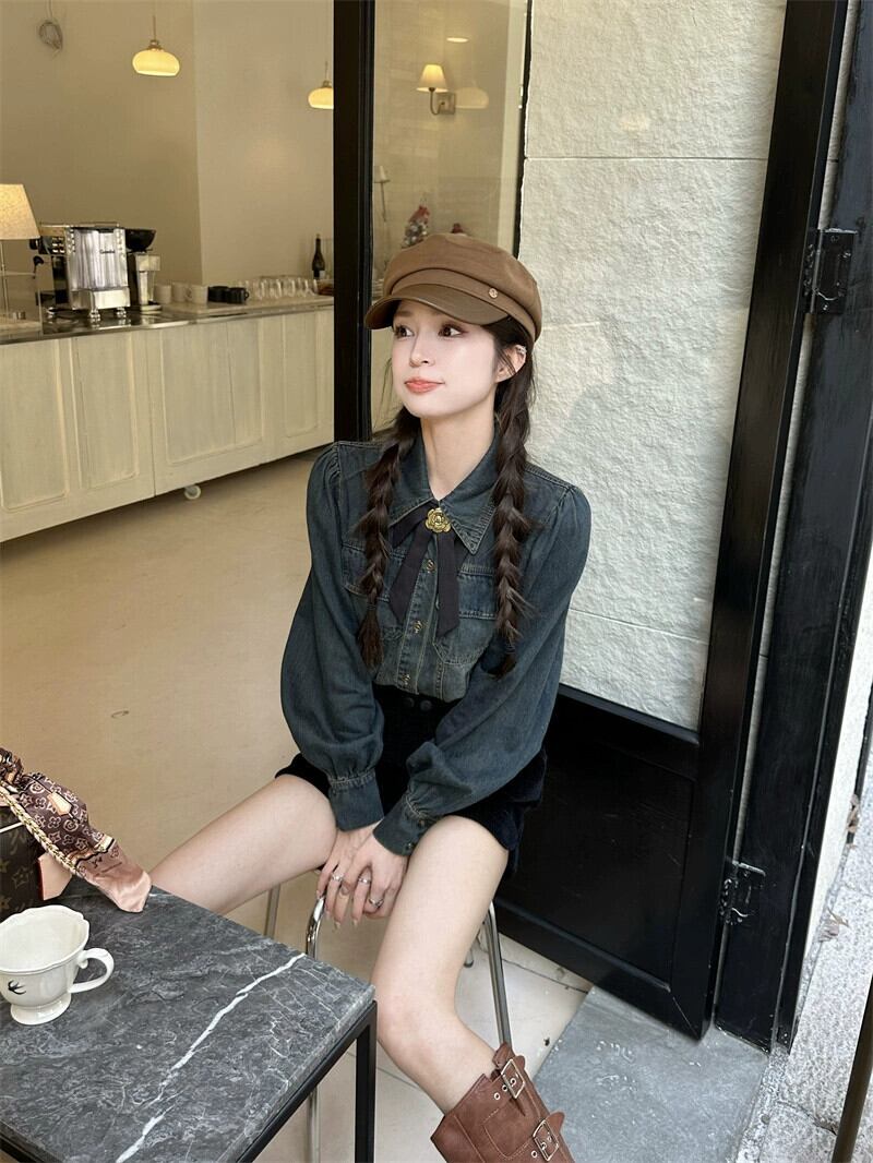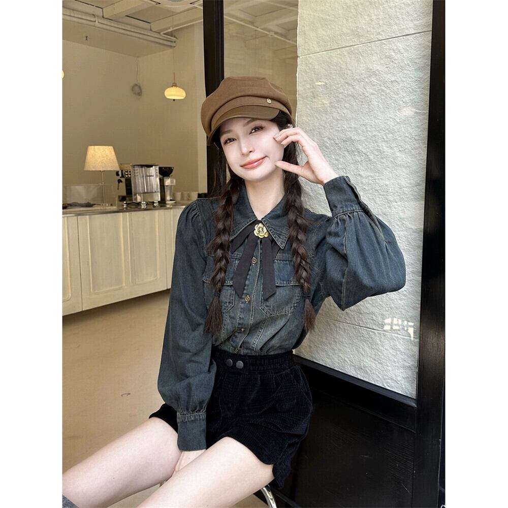 ボウデニムシャツジャケット女性の2024年春と秋の新しいレトロな香港スタイルのユニークなデザインの長袖トップ ロング スプリング 春物 オータム 秋物 missk27183444026