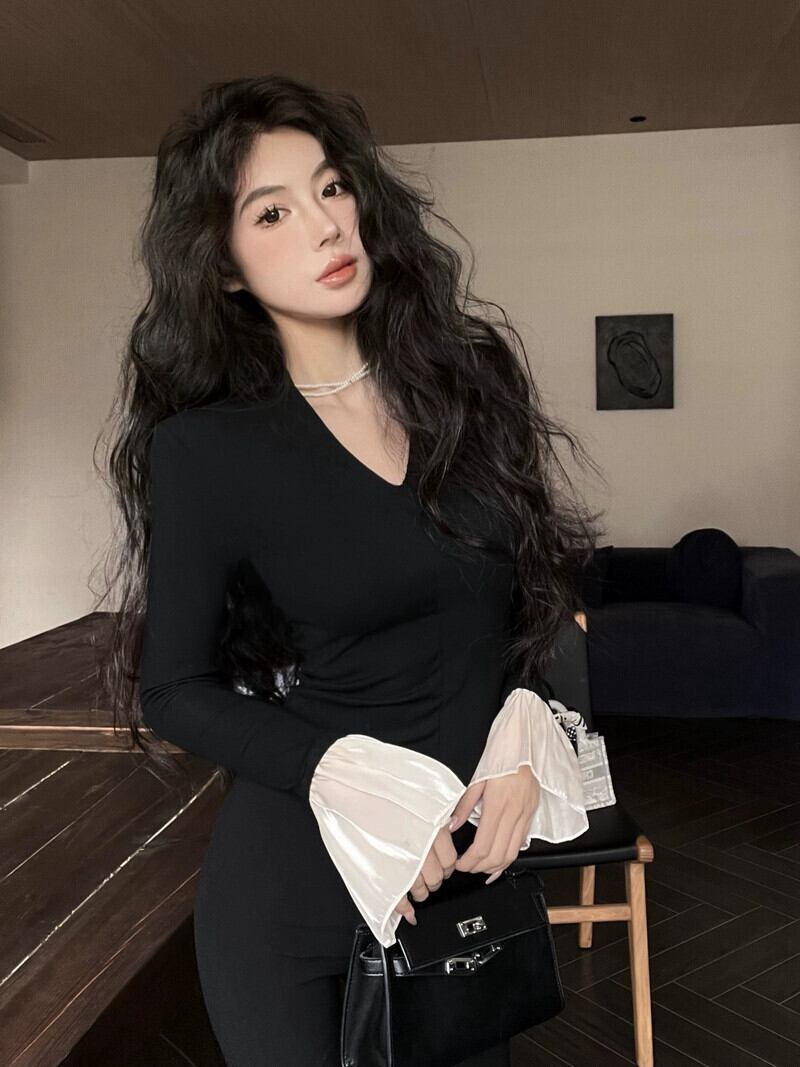 ベルベット肥厚トランペットスリーブ Tシャツ女性の 2024 春と秋の新しいフレンチニッチデザイン V ネック長袖ボトリングトップ ロング スプリング 春物 オータム 秋物 Vネック missk2822693799