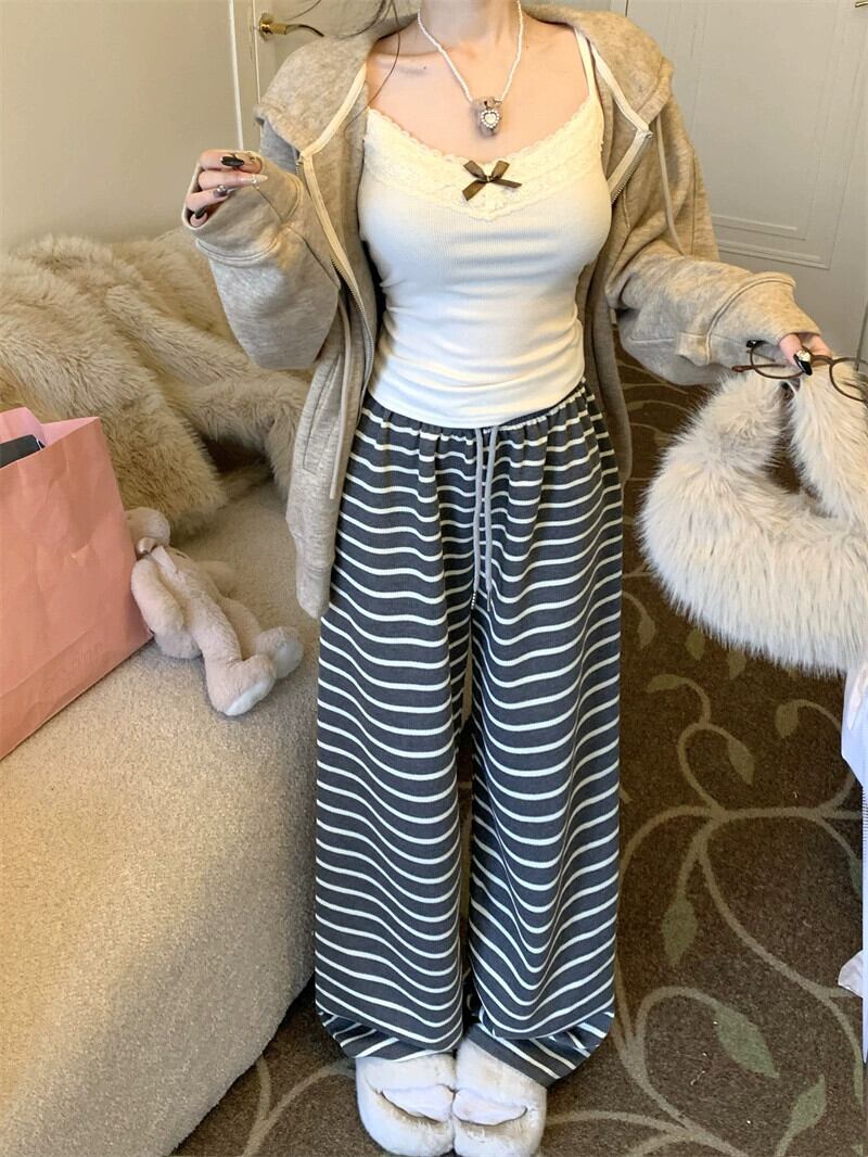 色:裏地にはベルベットのサスペンダーが付いています,オートミールキャメルフリーススウェットシャツ,ストライプパンツ