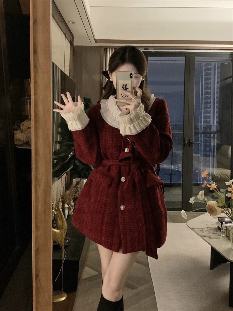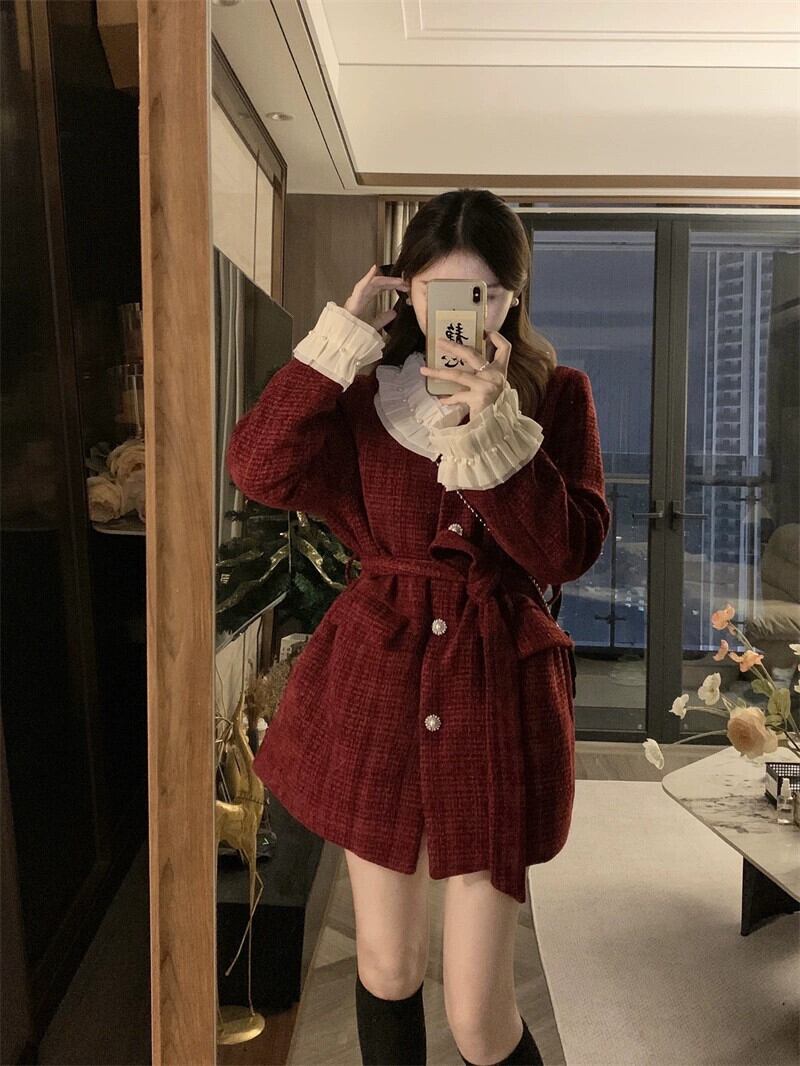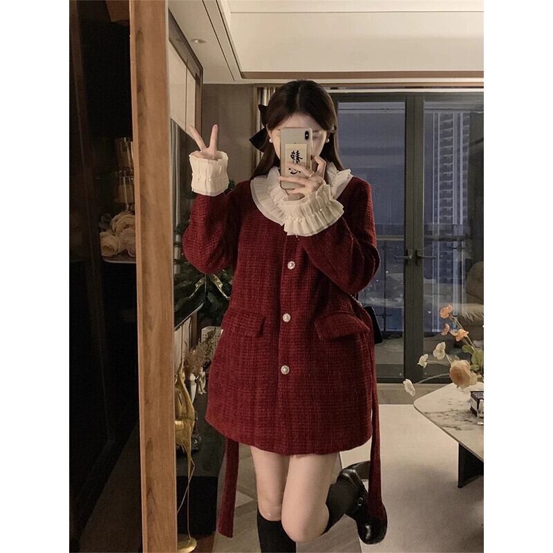 Xiaoxiangfeng キルティング肥厚ウールコート女性春 2024 新スタイルのハイエンドのレースの襟赤ウールのコート レッド スプリング 春物 missk53001989213