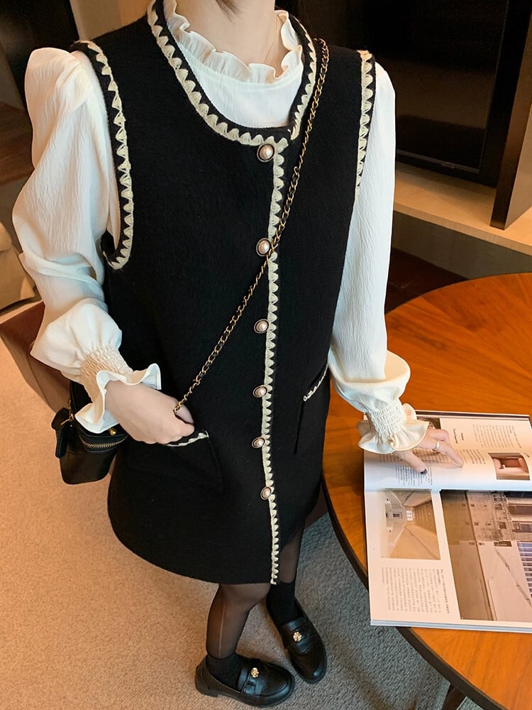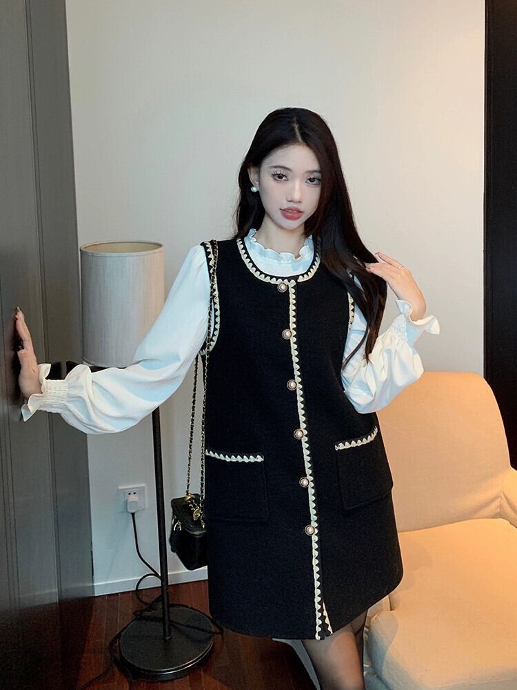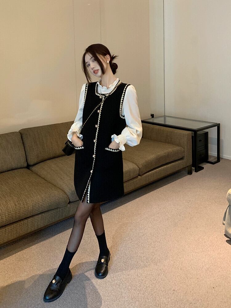Qianjin Xiaoxiang スタイルのベストドレスの女性、春と秋のフランスのハイエンドブラックレーススクエアカラースリムウールスカート スプリング 春物 オータム 秋物 スクウェア missk20840400897