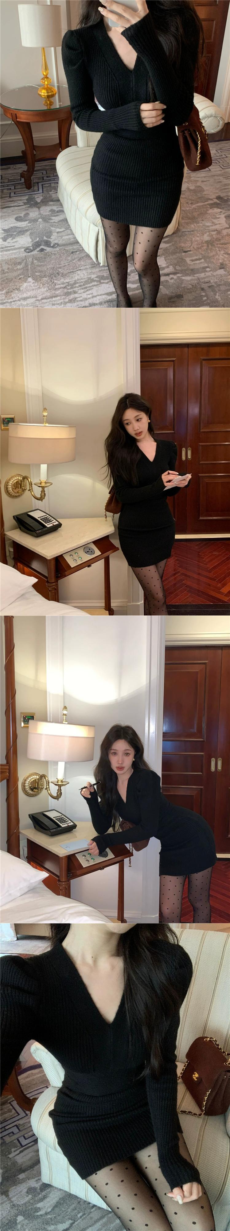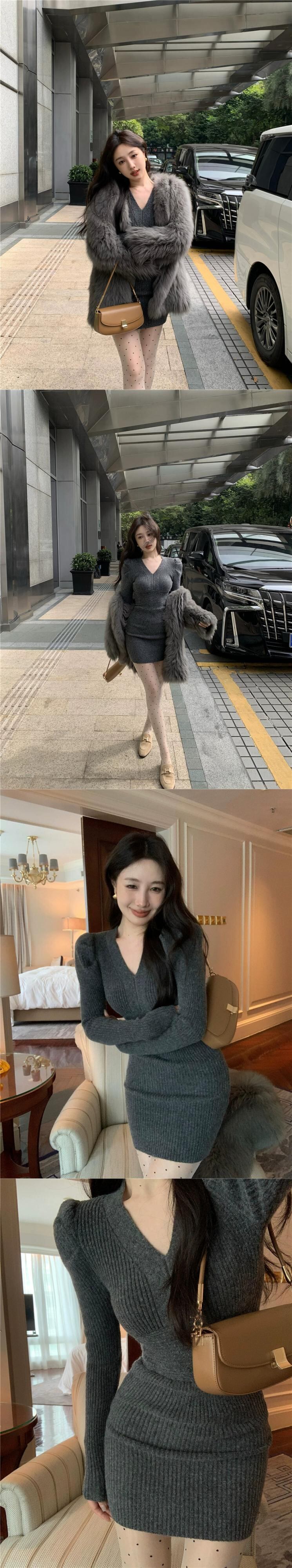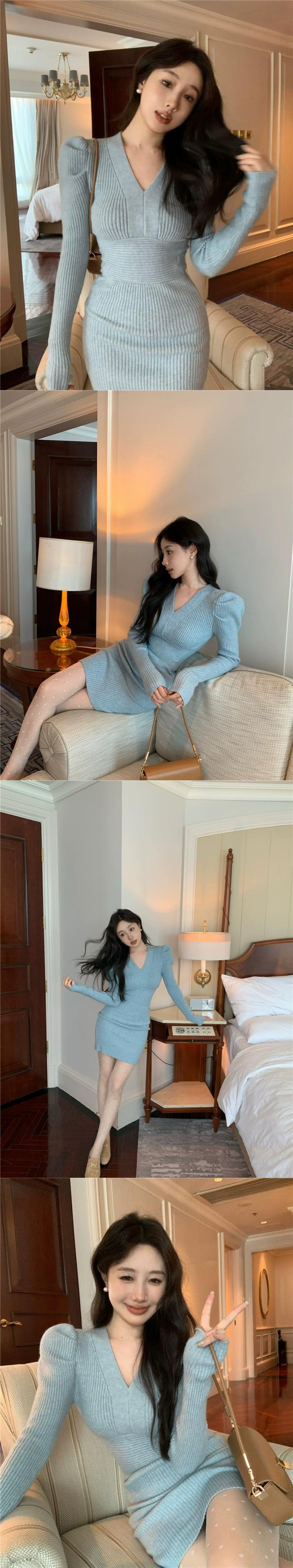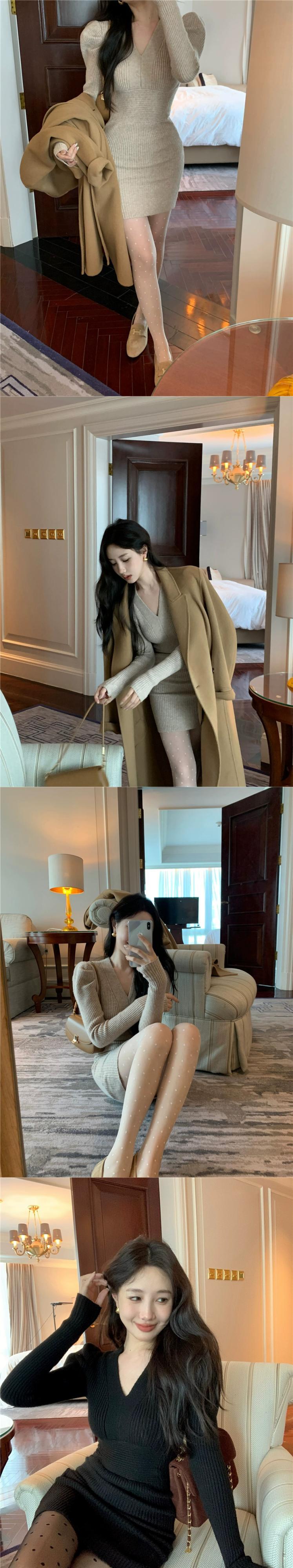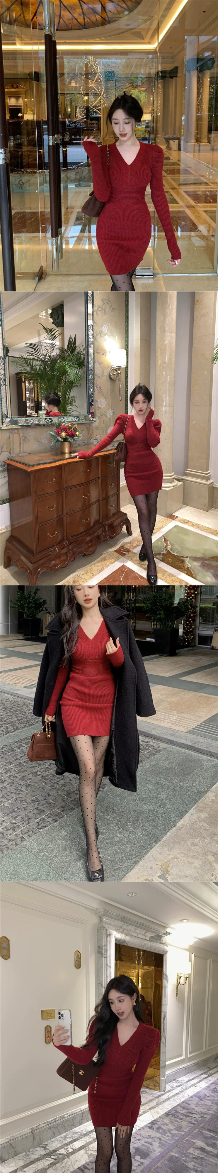 ホットセクシーな赤いニットドレスの女性の春と秋のスカート気質 V ネックウエスト痩身底スカートヒップスカート レッド スプリング 春物 オータム 秋物 Vネック missk57517826374
