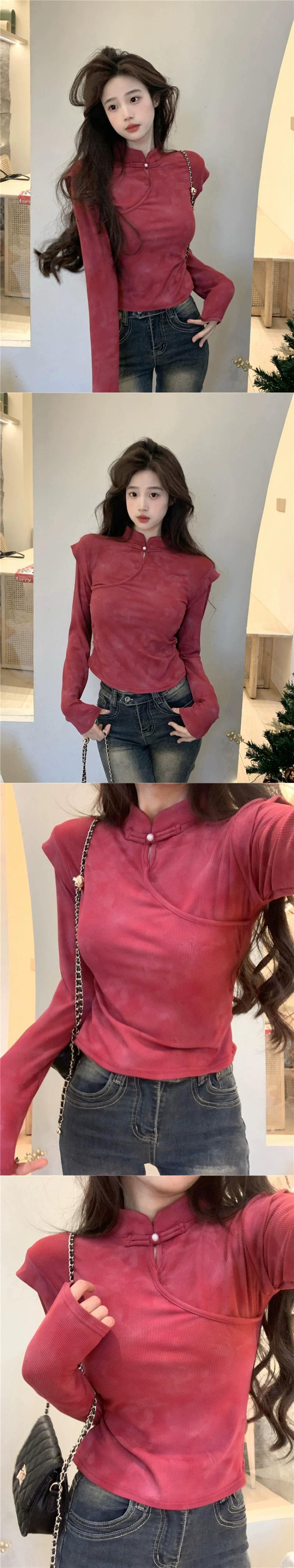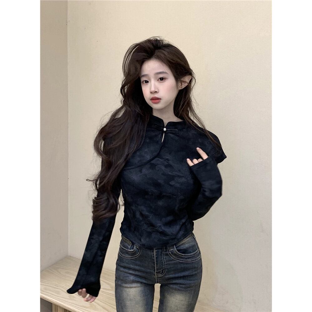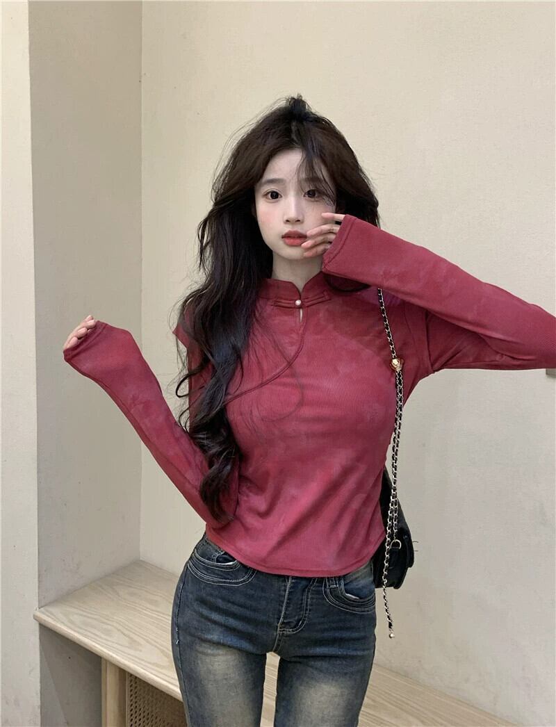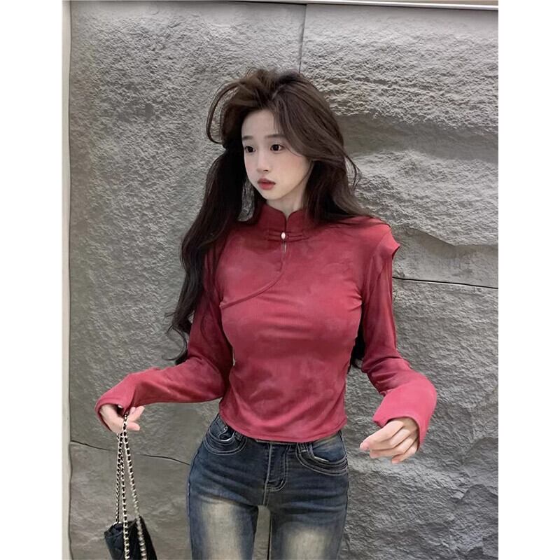 中国風のディスクボタンスタンドカラー長袖Tシャツレディース、春と秋のレトロなデザイン、スリムフィットインナーレイヤリングシャツトップ ロング スプリング 春物 オータム 秋物 missk54804742973
