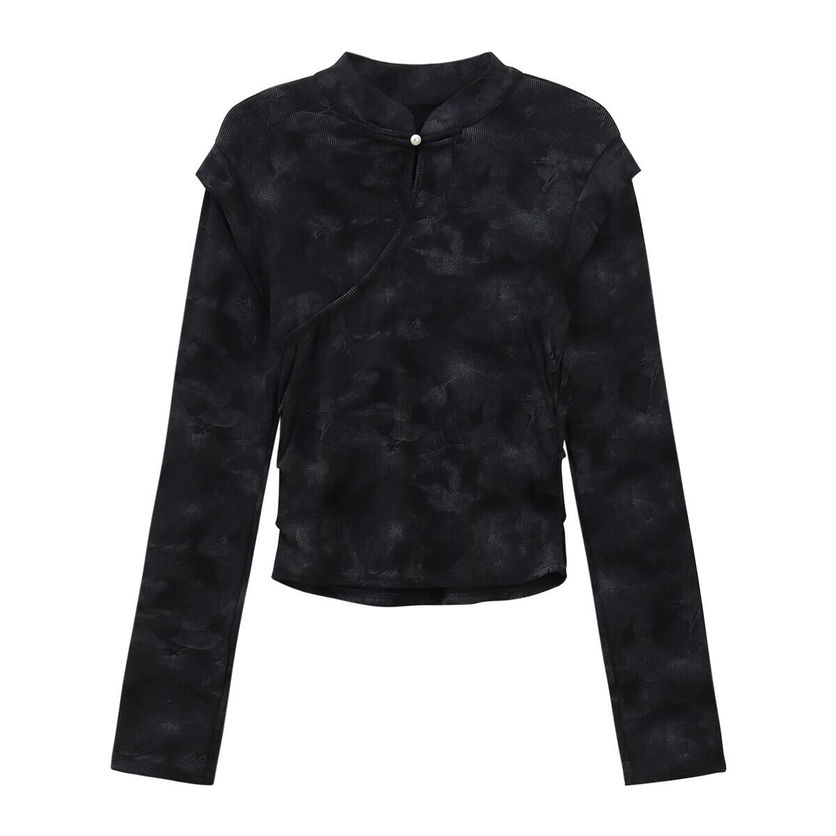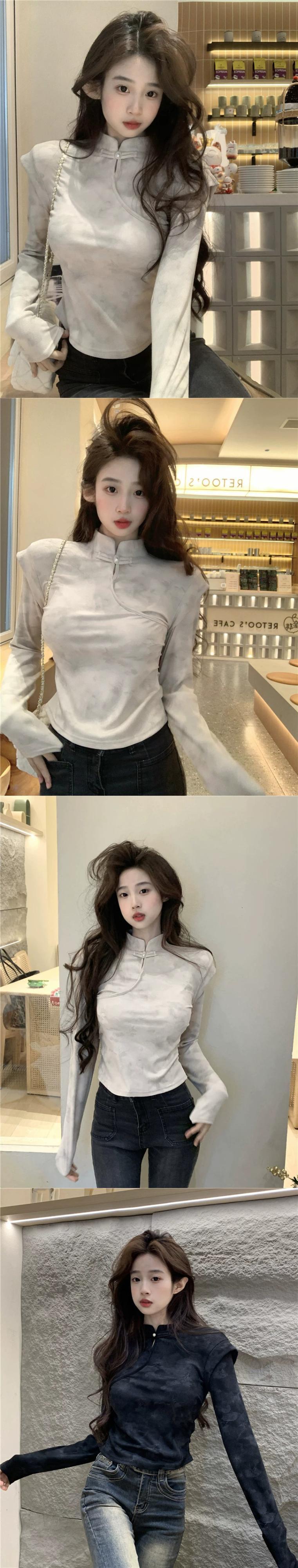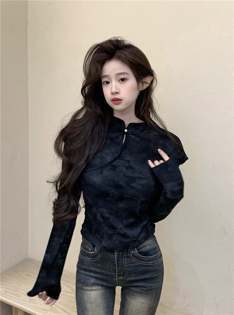 中国風のディスクボタンスタンドカラー長袖Tシャツレディース、春と秋のレトロなデザイン、スリムフィットインナーレイヤリングシャツトップ ロング スプリング 春物 オータム 秋物 missk54804742973