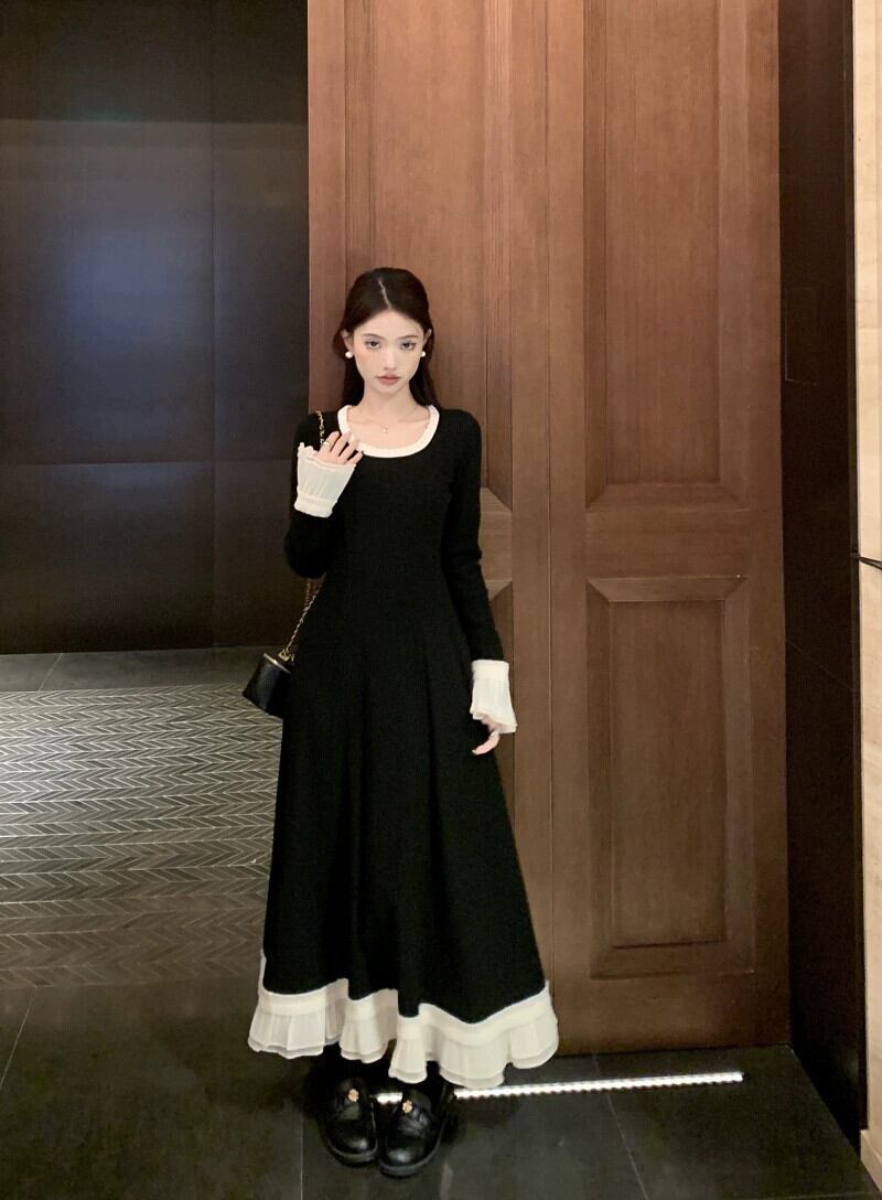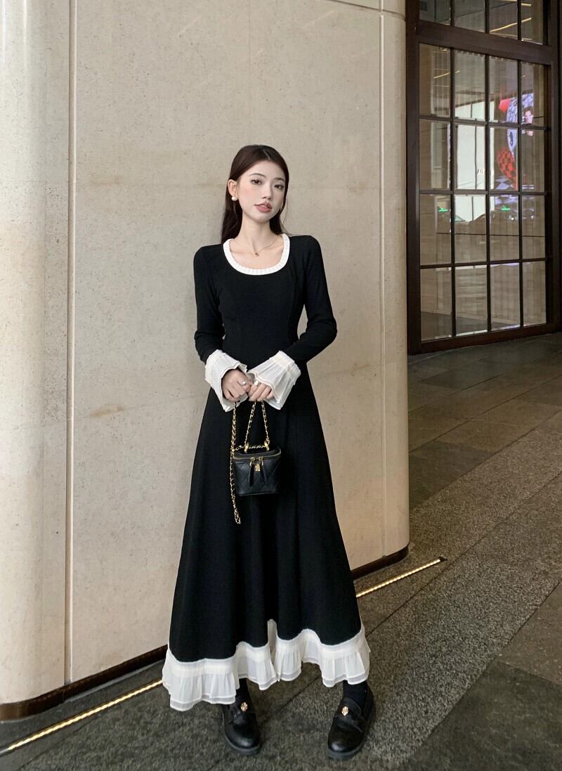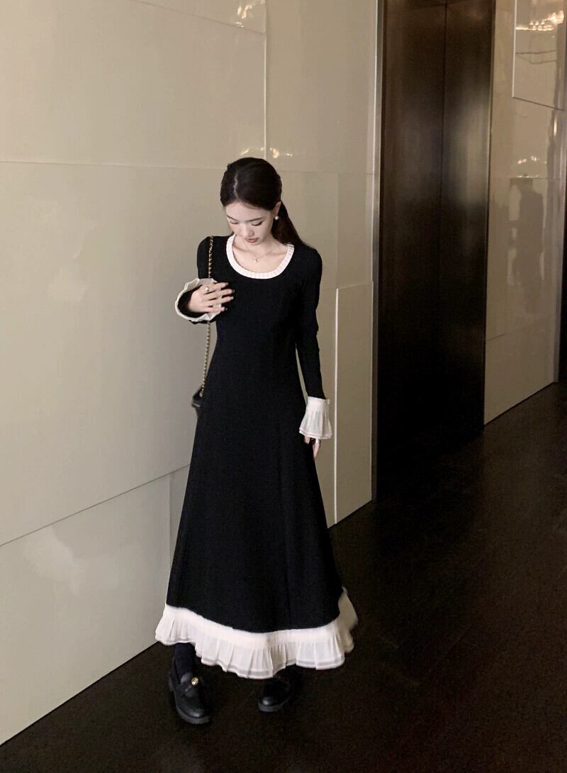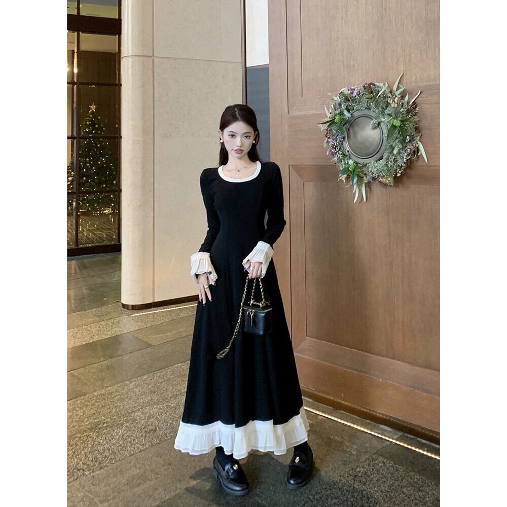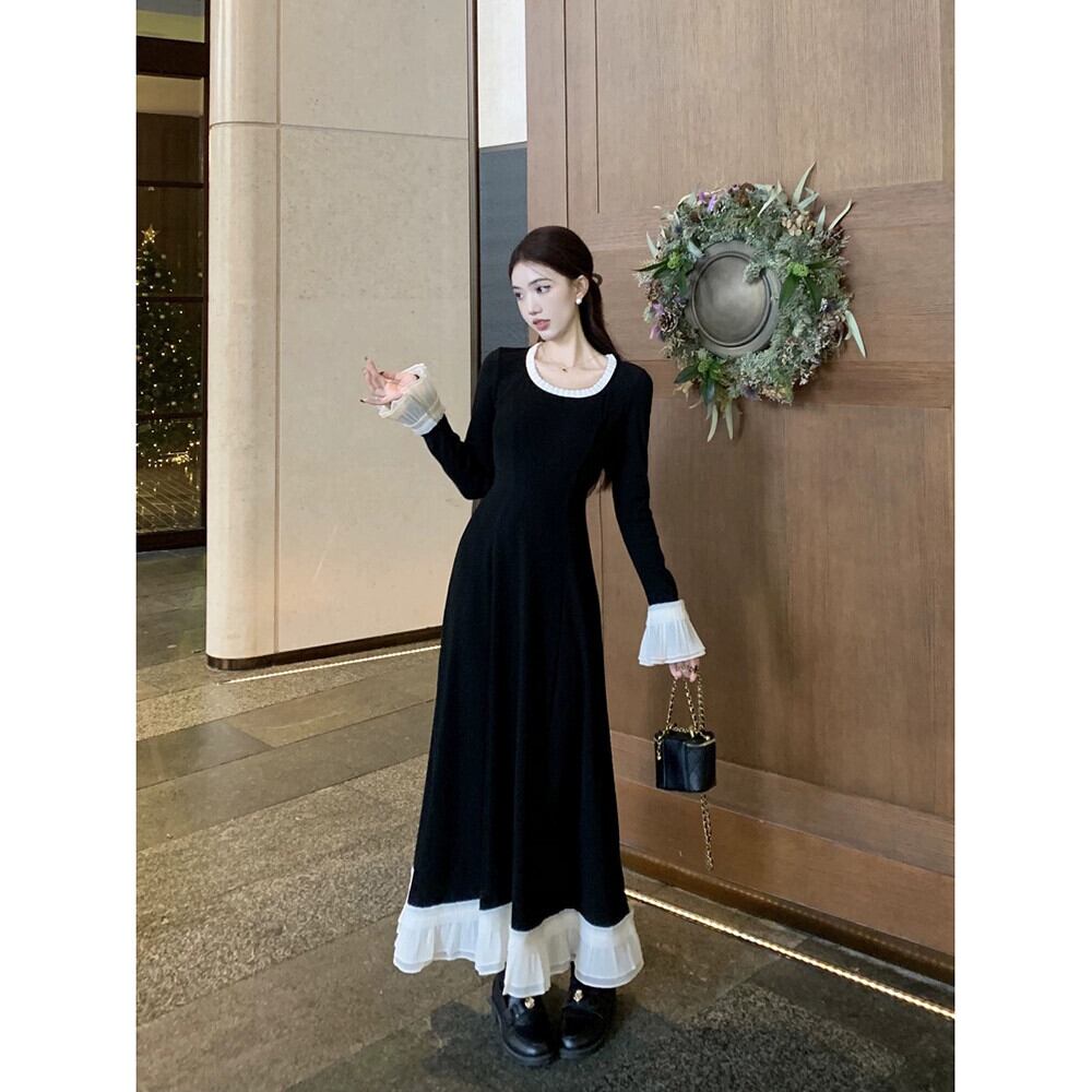フレンチブラックトランペットスリーブドレス女性春と秋2024新しいスタイル気質ウエスト痩身レースAラインロングスカート スプリング 春物 オータム 秋物 missk15693892817