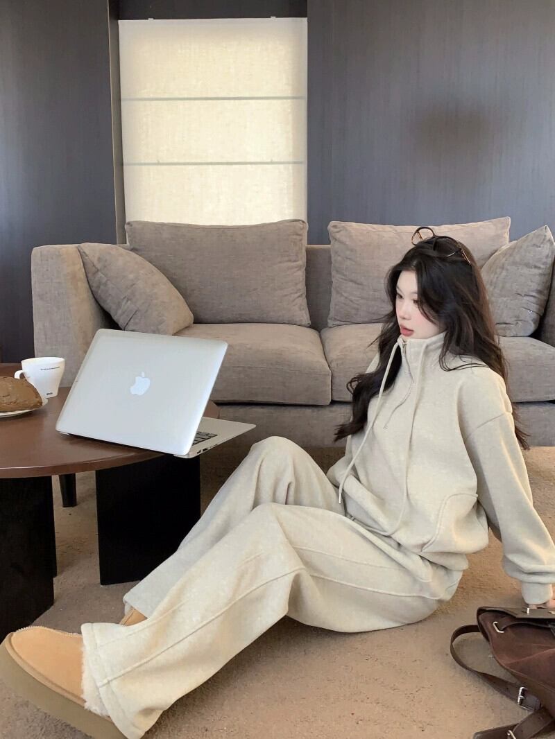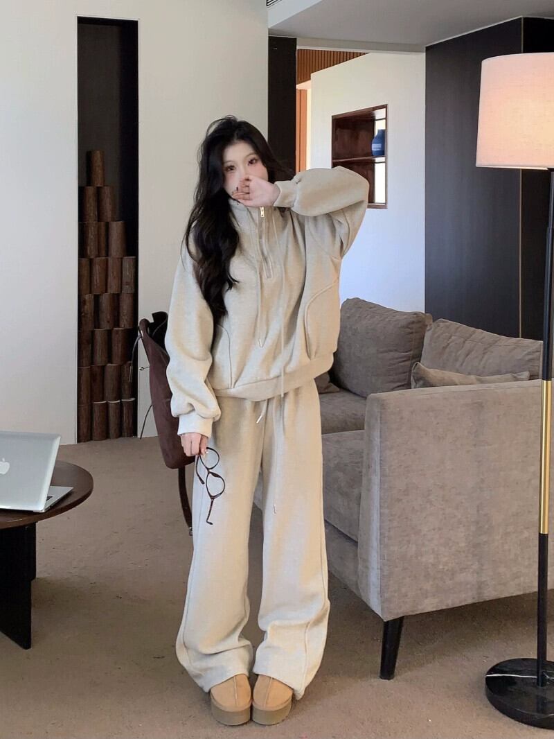 ファッションスーツの女性の春と秋のベルベット肥厚フード付きスポーツスタイルスウェットシャツジャケットハイウエストワイドレッグパンツツーピースセット ハイウェスト スプリング 春物 オータム 秋物 ワイドパンツ missk16495325082