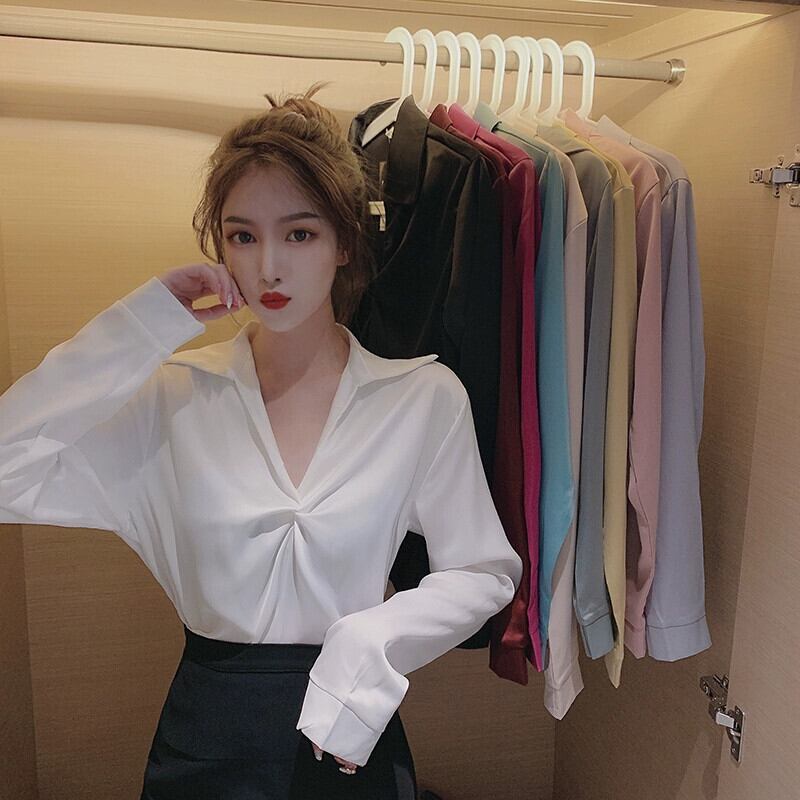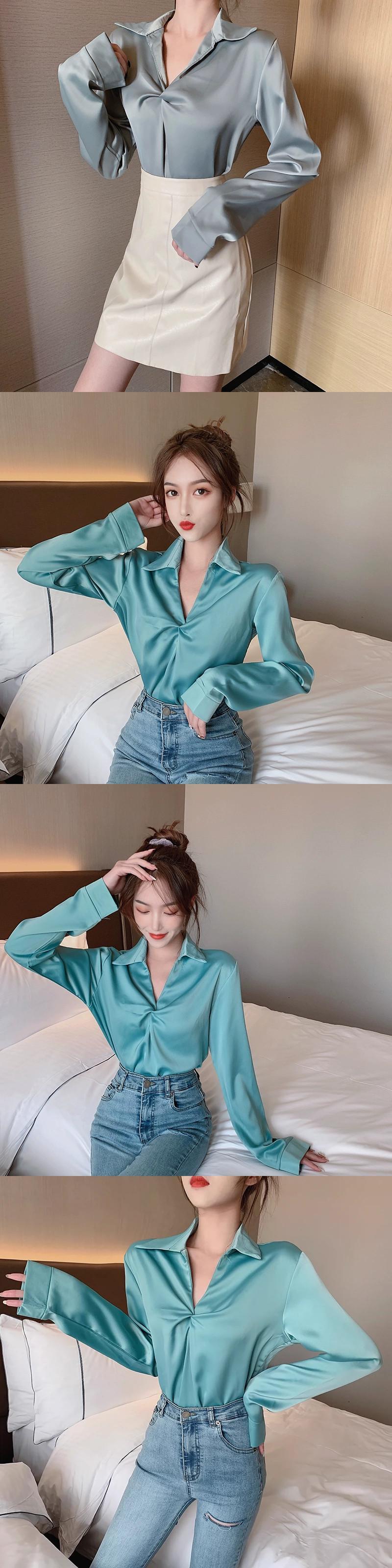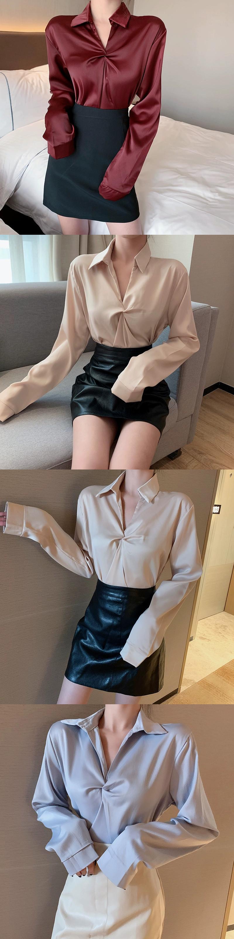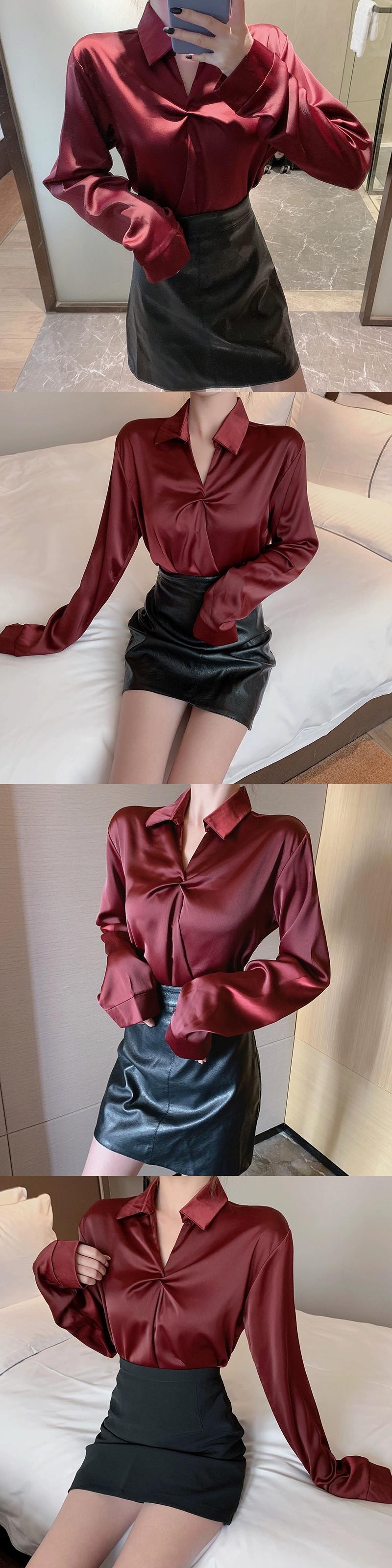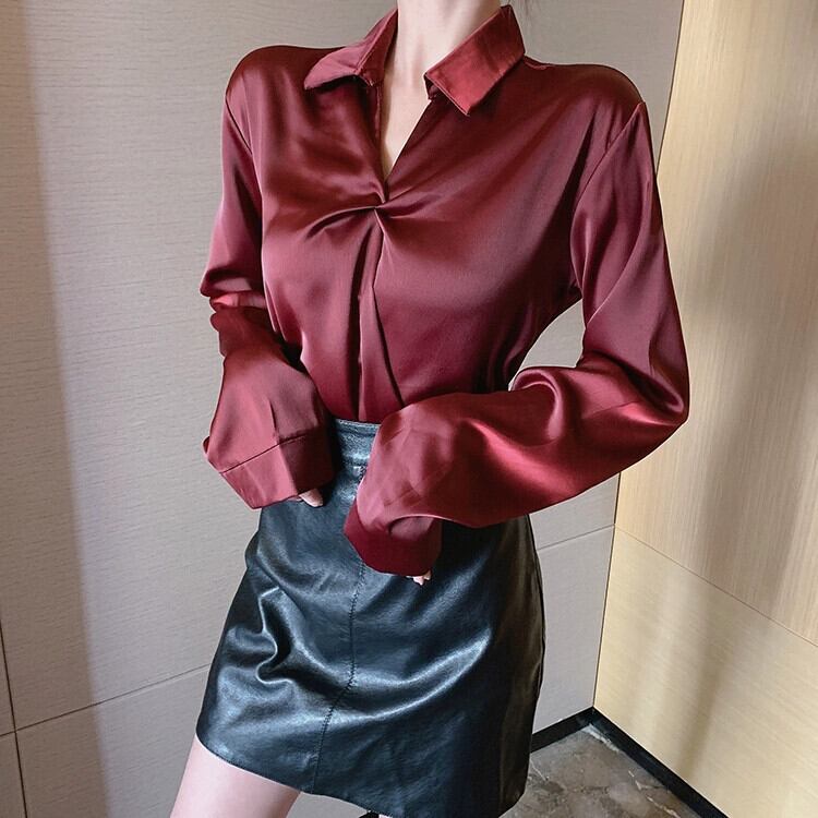2024 春の新レトロ香港スタイル模造 ged デザインプリーツポロ襟ルーズ長袖シャツトップ女性 ロング スプリング 春物 missk92583845182