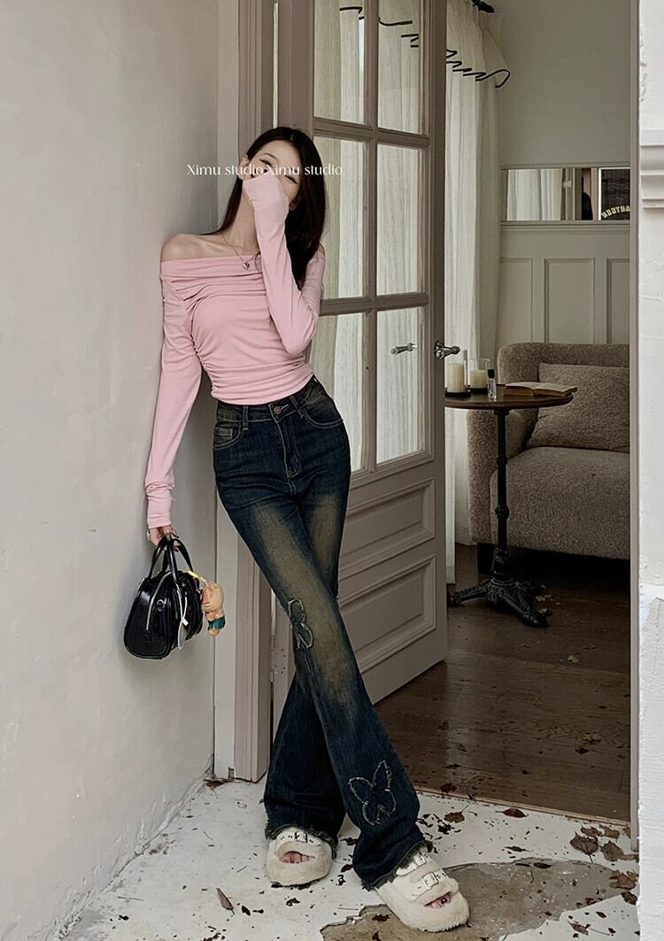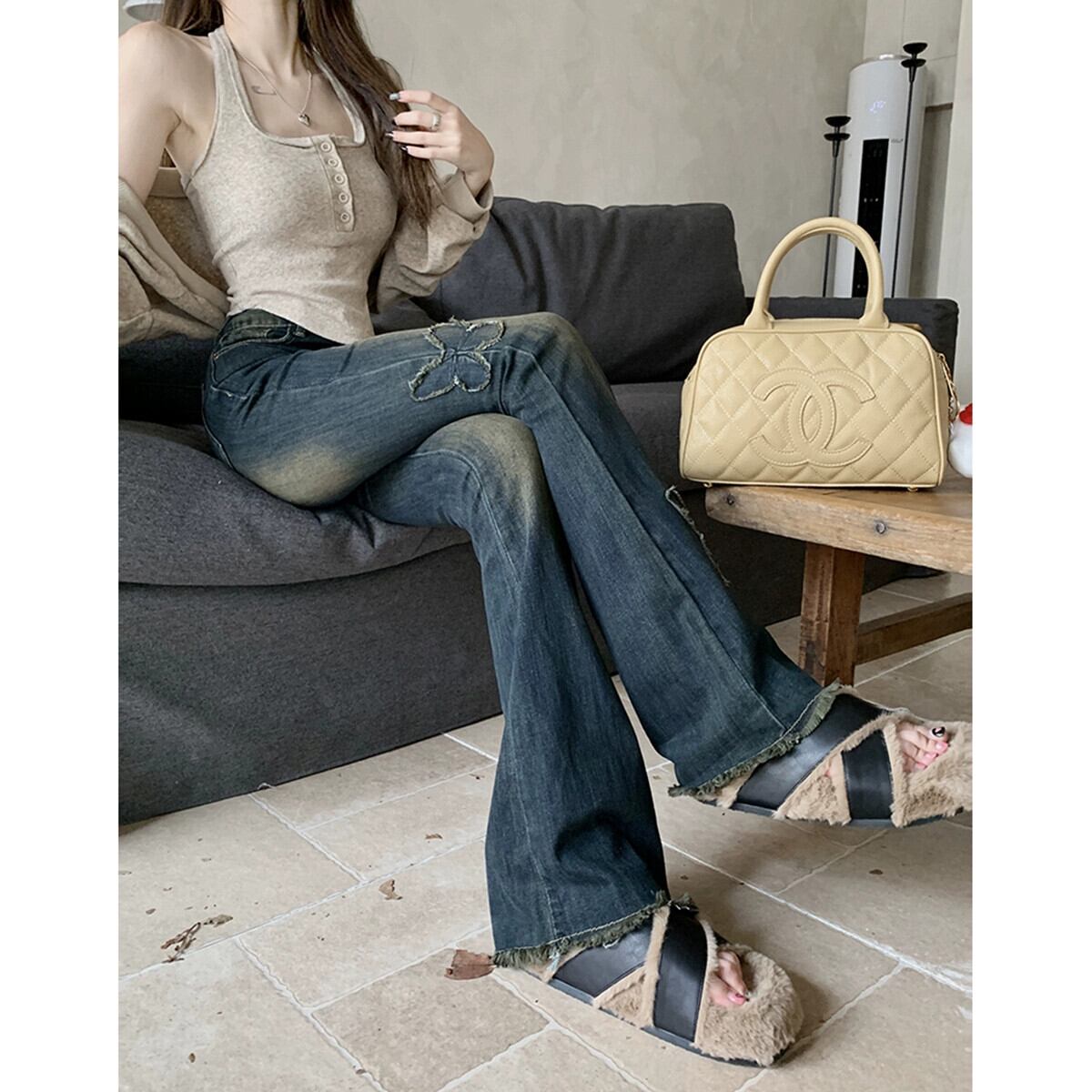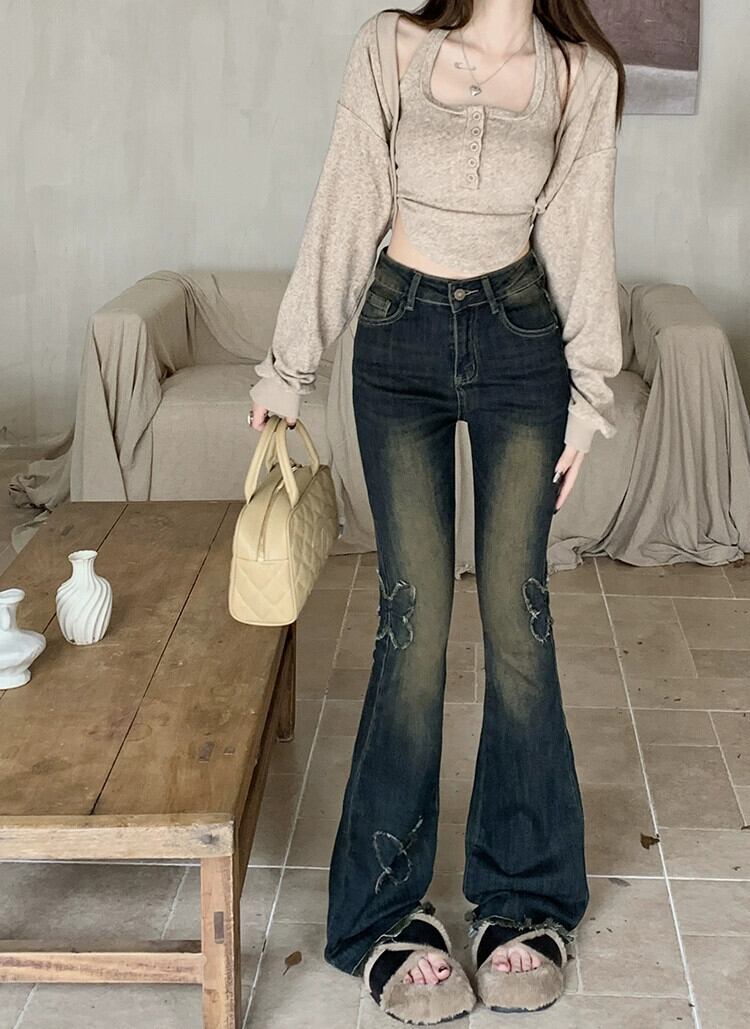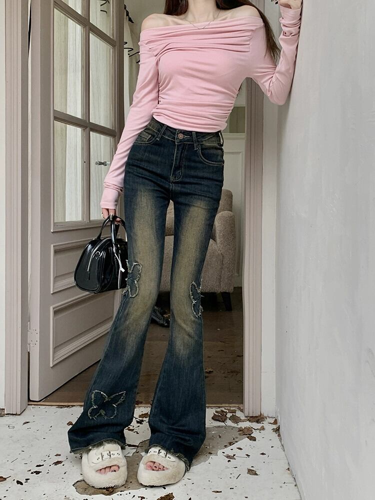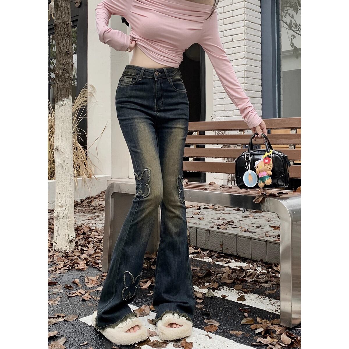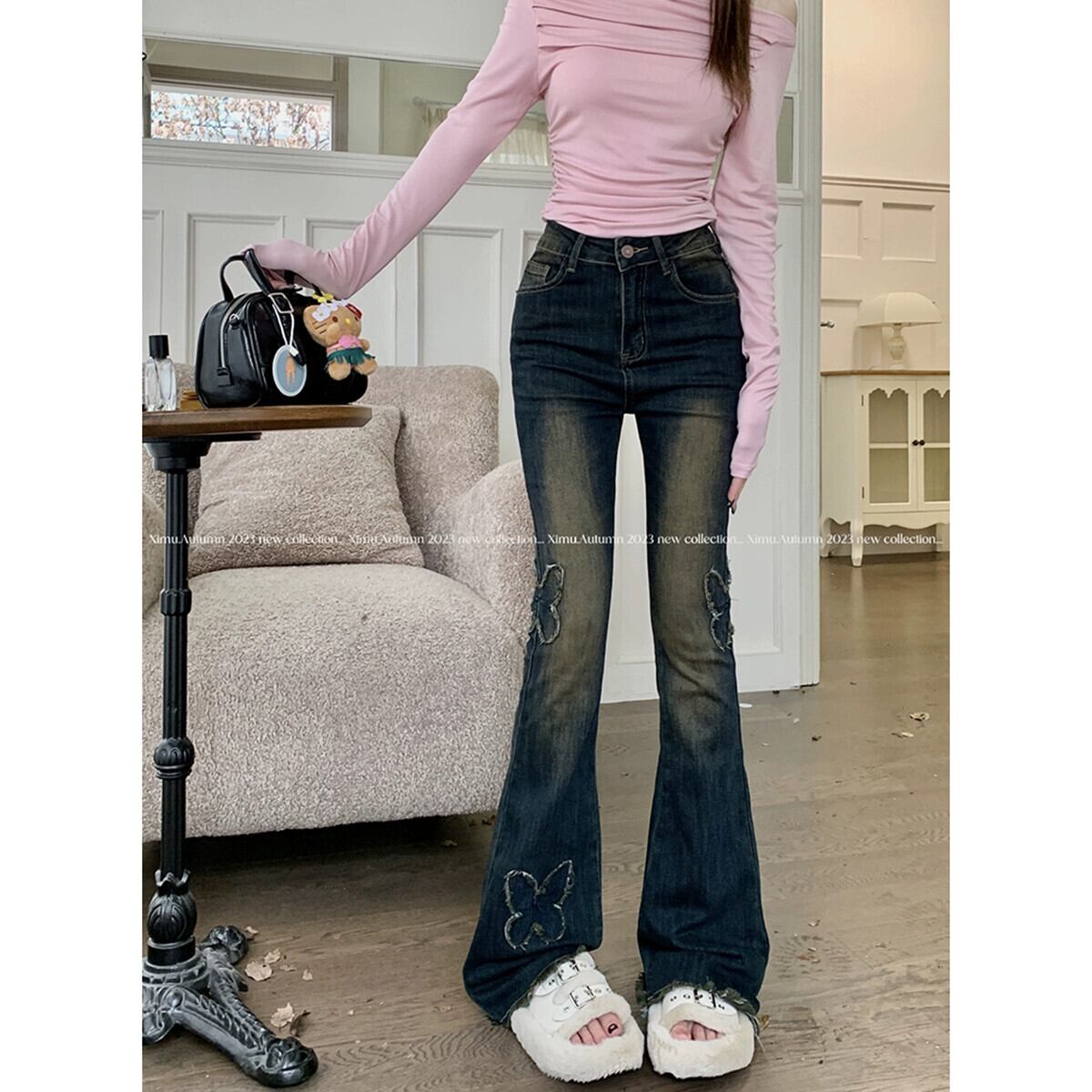 ホット伸縮性ブーツカットジーンズ女性春バージョン 2024 新デザイン蝶刺繍ハイウエストロングパンツ ハイウェスト レッド スプリング 春物 missk42634359264