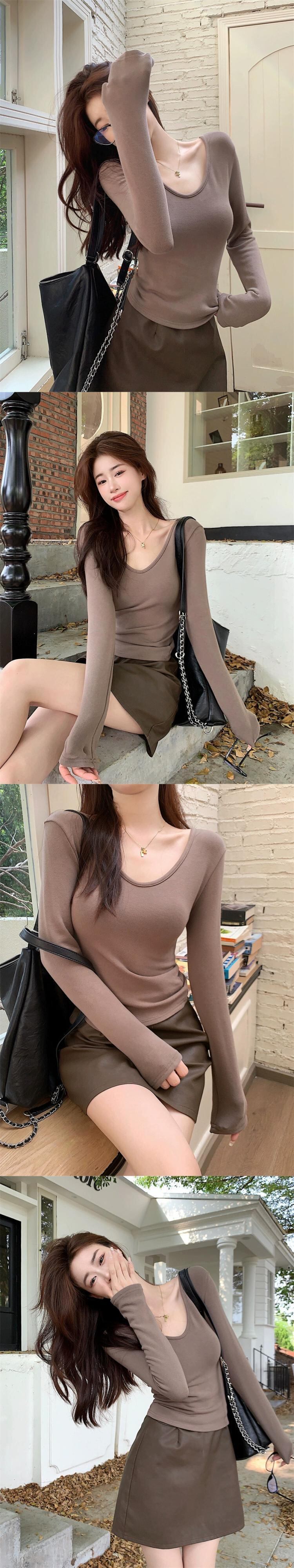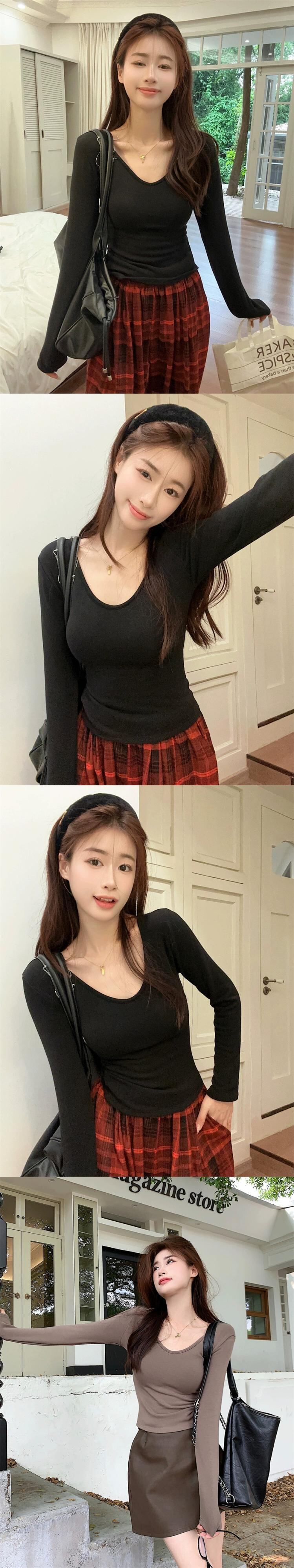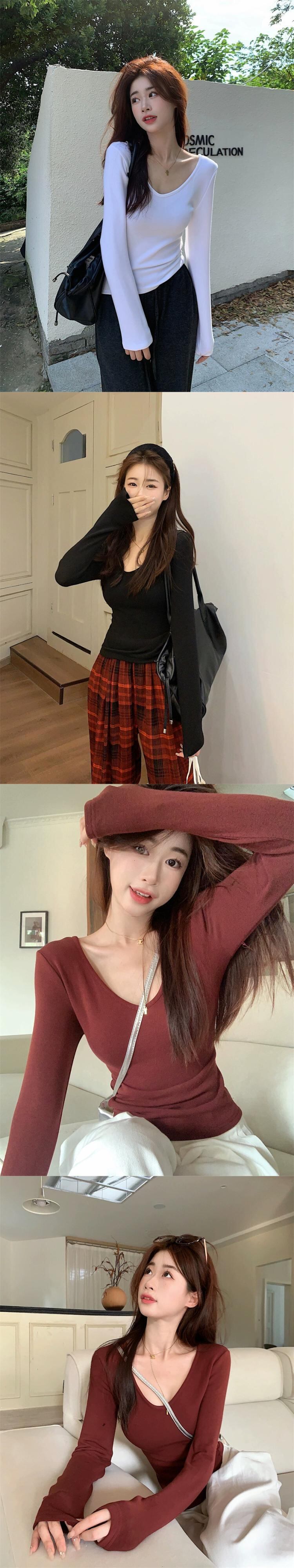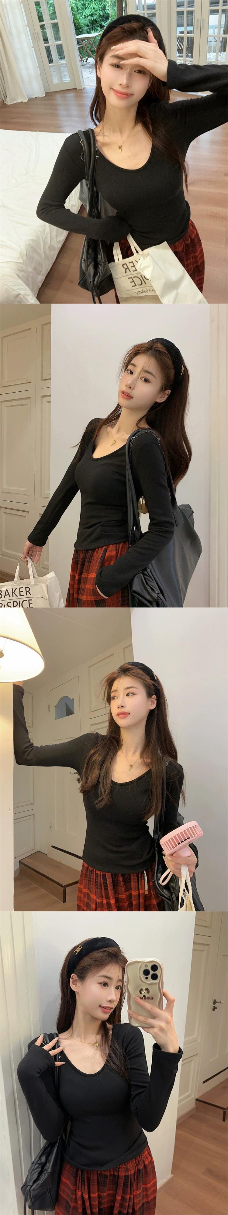 U ネック長袖ボトリングシャツ女性春バージョン 2024 新しい純粋な欲望スタイル痩身無地インナー Tシャツトップ ロング スプリング 春物 ピュア ソリッドカラー missk45038309955