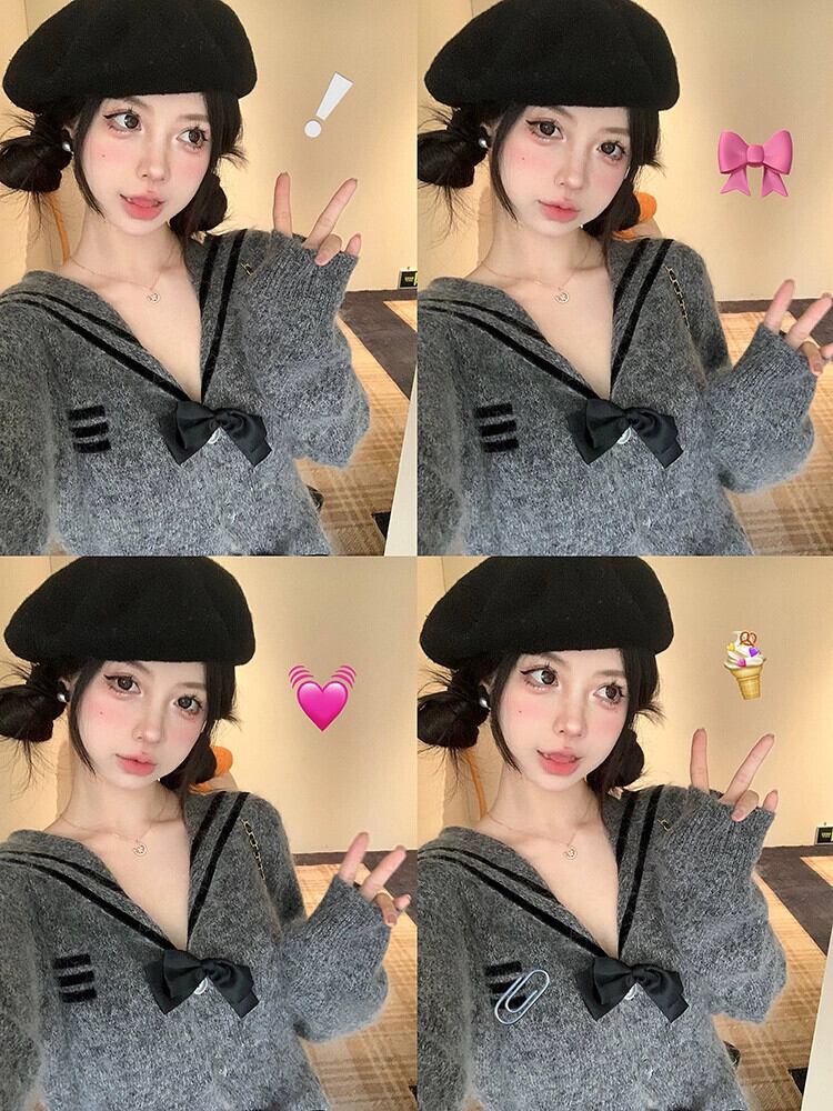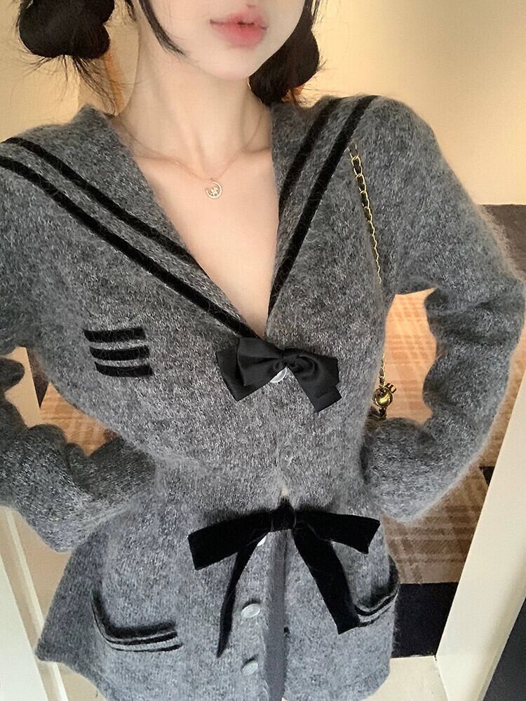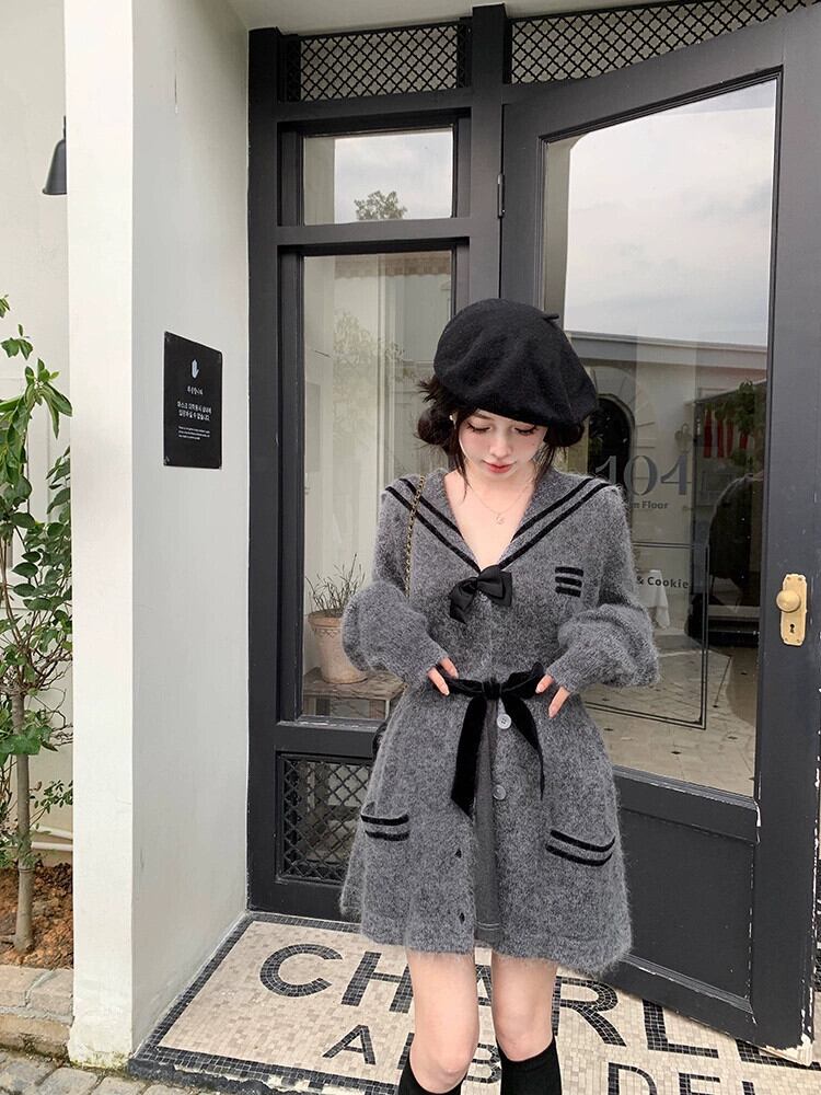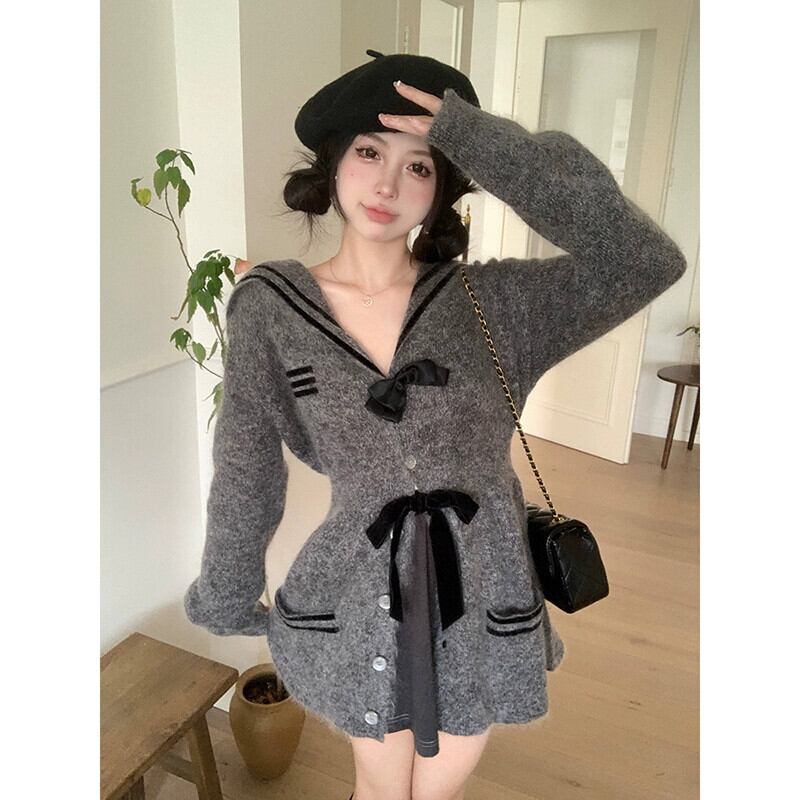プレッピースタイルモヘア長袖ニットジャケット女性春と秋 2024 弓コントラストカラーウエストスリムセーター ロング リボン スプリング 春物 オータム 秋物 missk58339528571