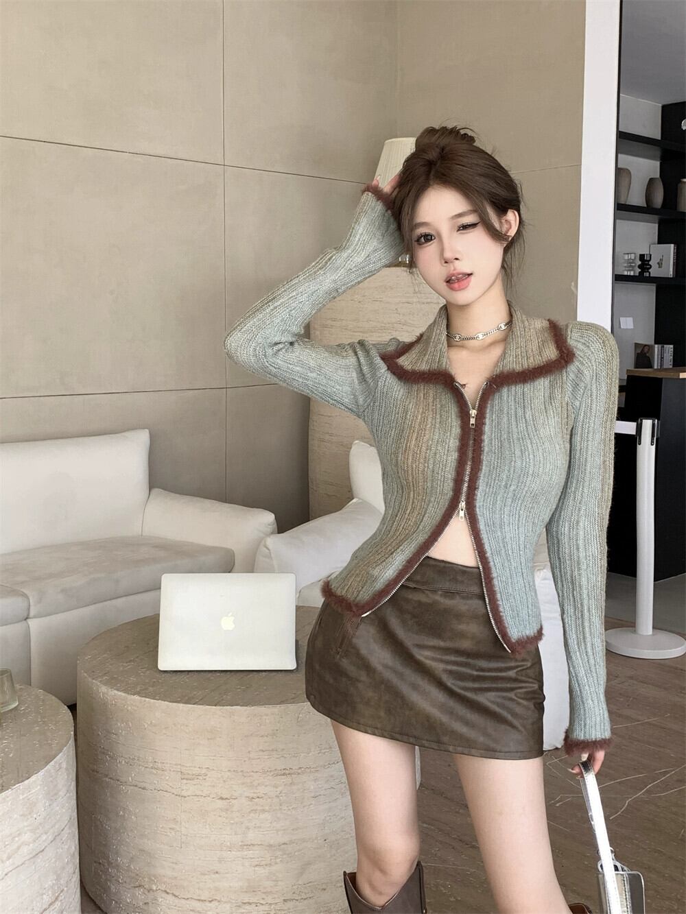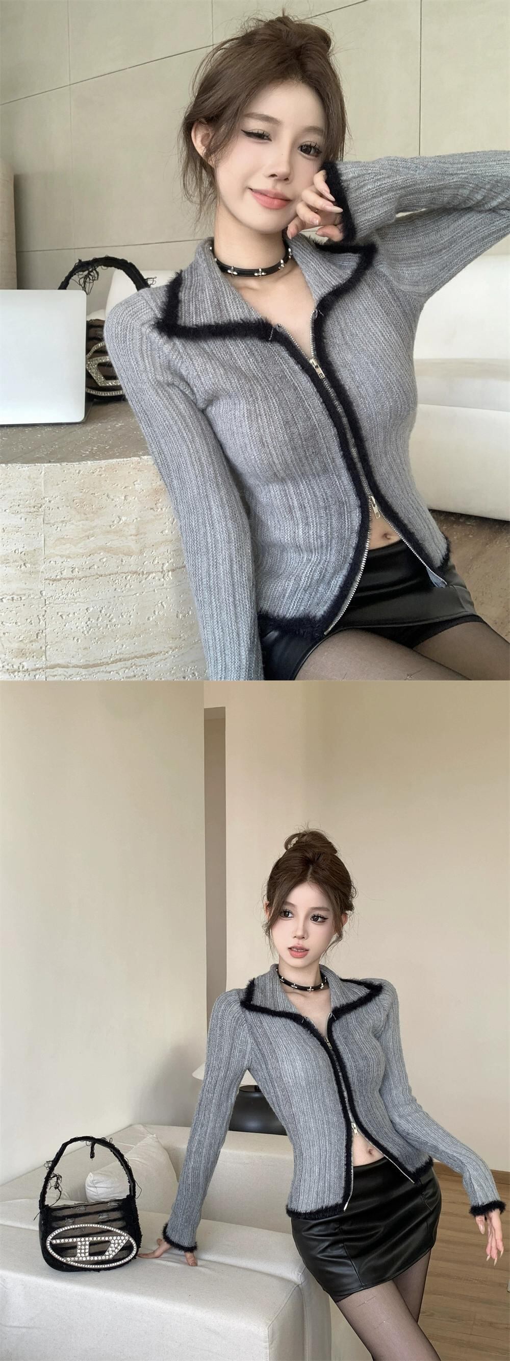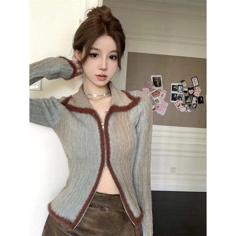 ダブルジッパーデザインラペルニットカーディガン女性の 2024 年春の新レトロコントラストカラールーズ長袖ジャケット ロング スプリング 春物 missk18055987902