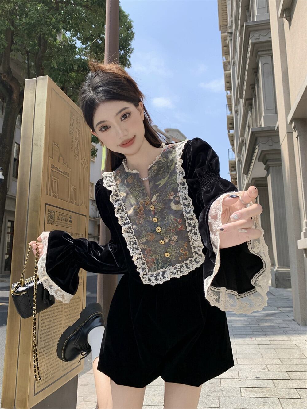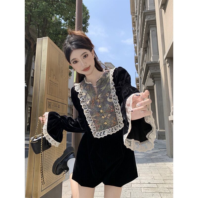 フランス宮殿スタイルレーススプライシングベルベット長袖トップスハイウエストショーツ女性春 2024 新しいファッションスーツ ロング スプリング 春物 ブルマー missk60113636089