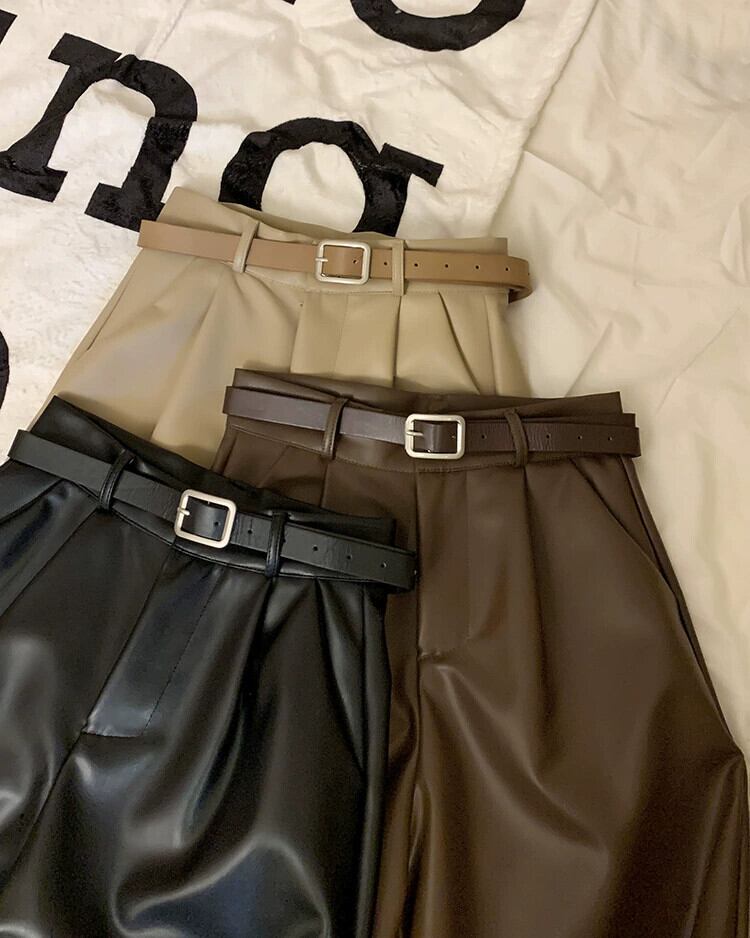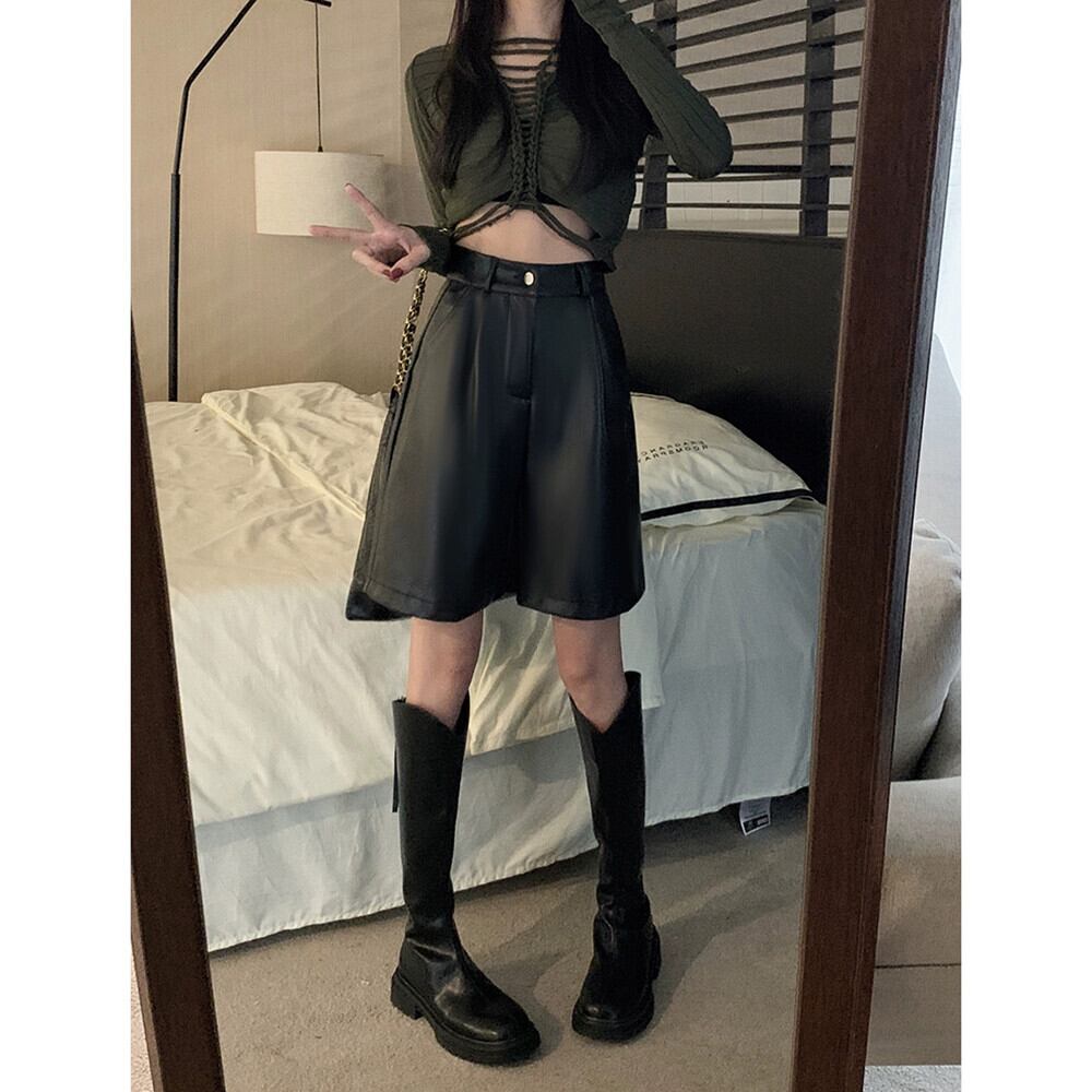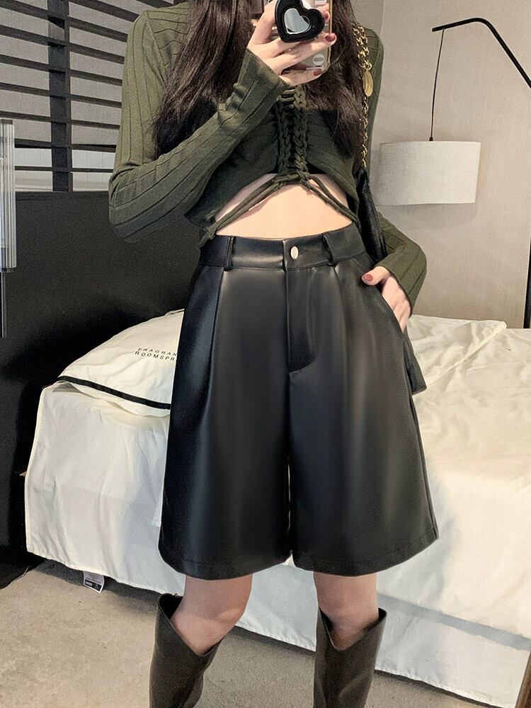 メイラード PU レザーワイドレッグショーツ女性春と秋 2024 新しいレトロハイウエストスリム多用途ブラウンカジュアルパンツ スプリング 春物 オータム 秋物 ブルマー missk81235655038