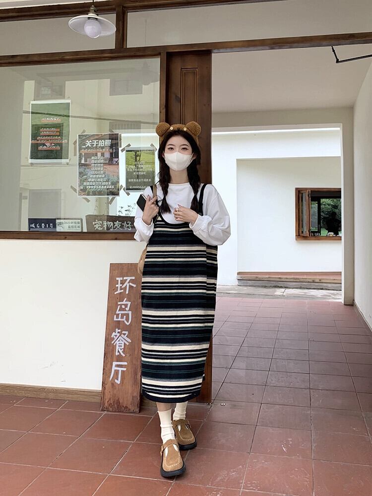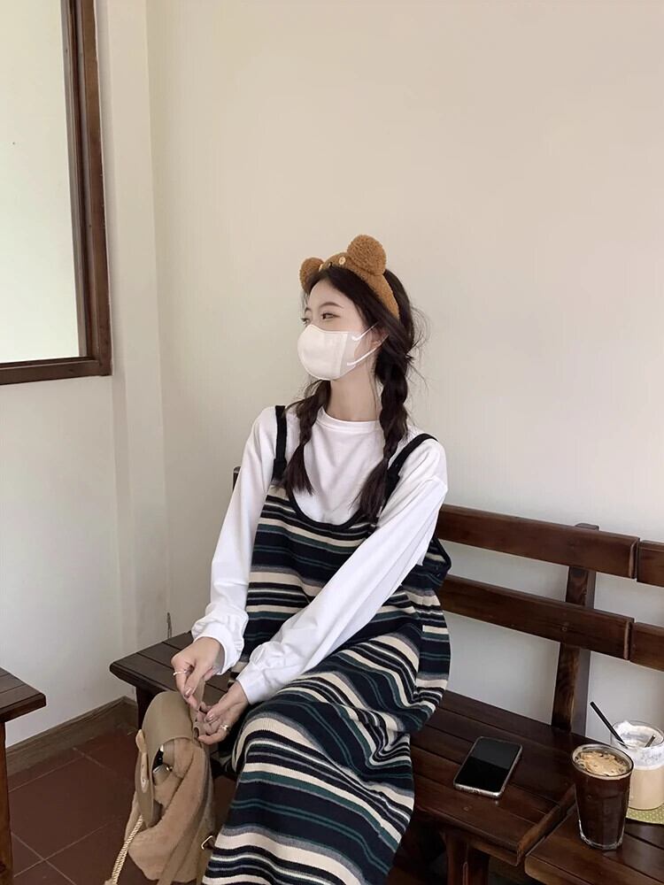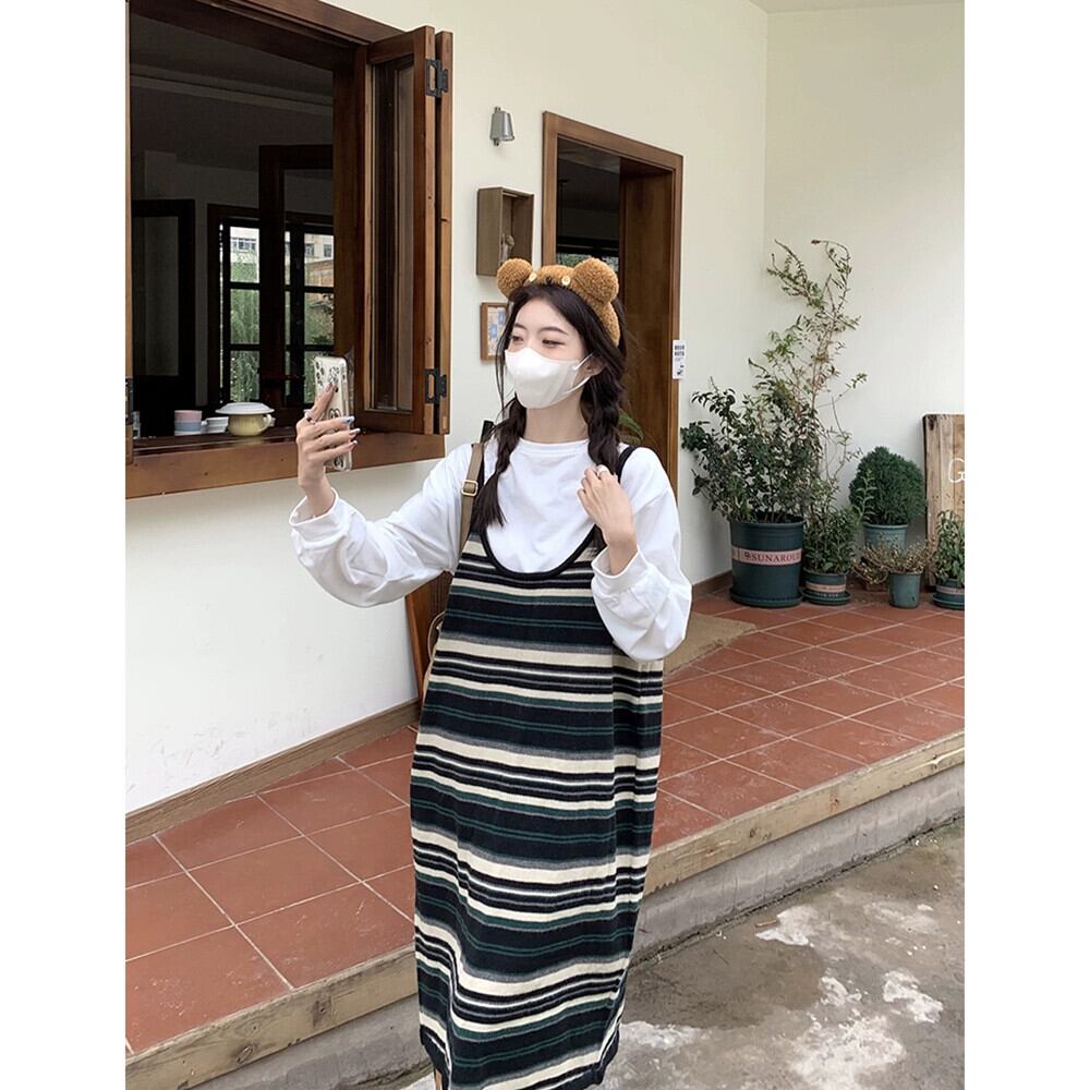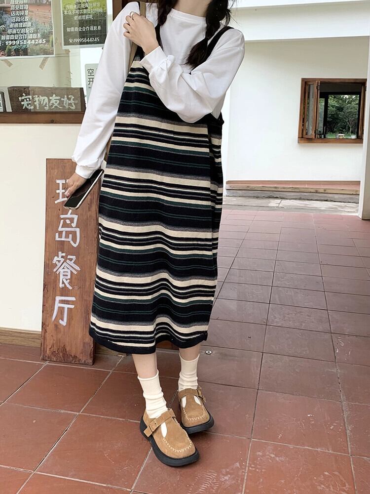 ストライプのコントラストカラーニットサスペンダードレス女性春と秋2024新しいスタイルの小さな新鮮なルーズミッドレングスストレートスカート スプリング 春物 オータム 秋物 missk94080796469