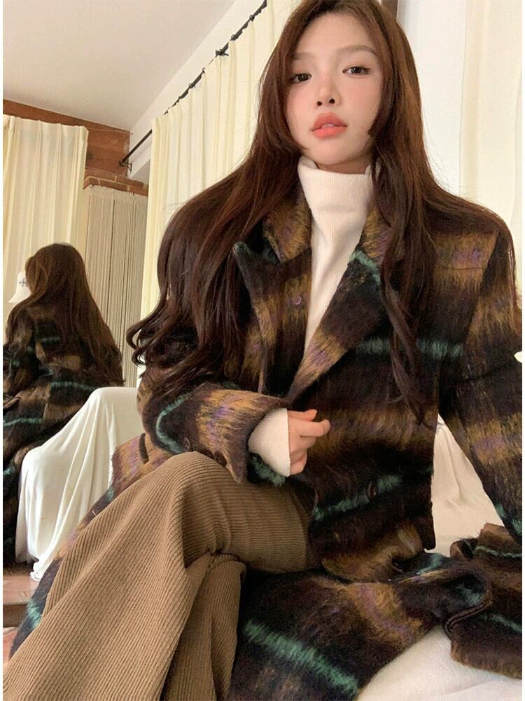 メイラードチェック柄長袖ウールコート女性の春と秋のレトロ 2024 新しいルーズ膝上肥厚ロングコート スプリング 春物 オータム 秋物 missk1572686160