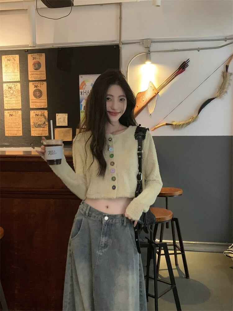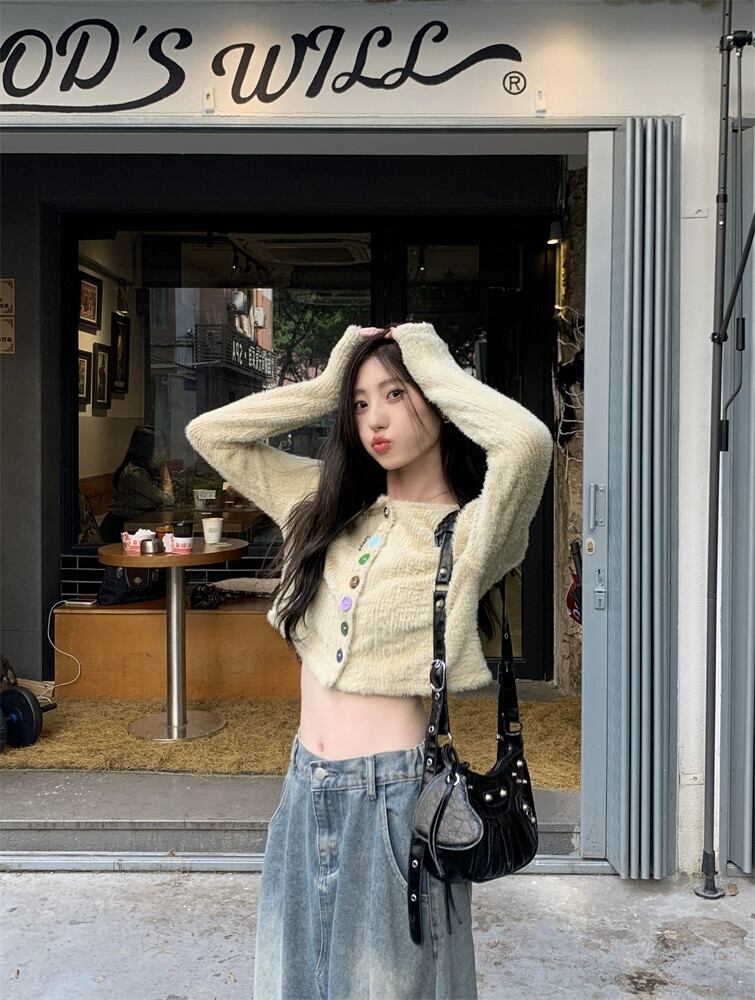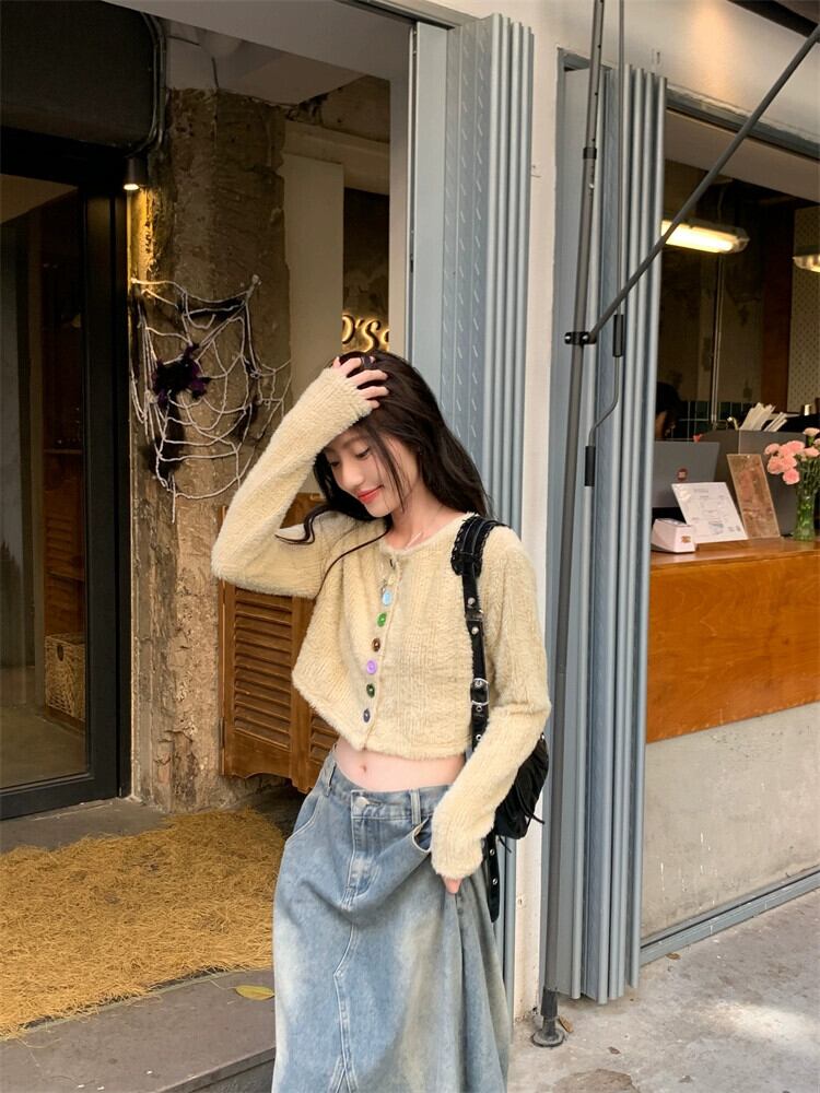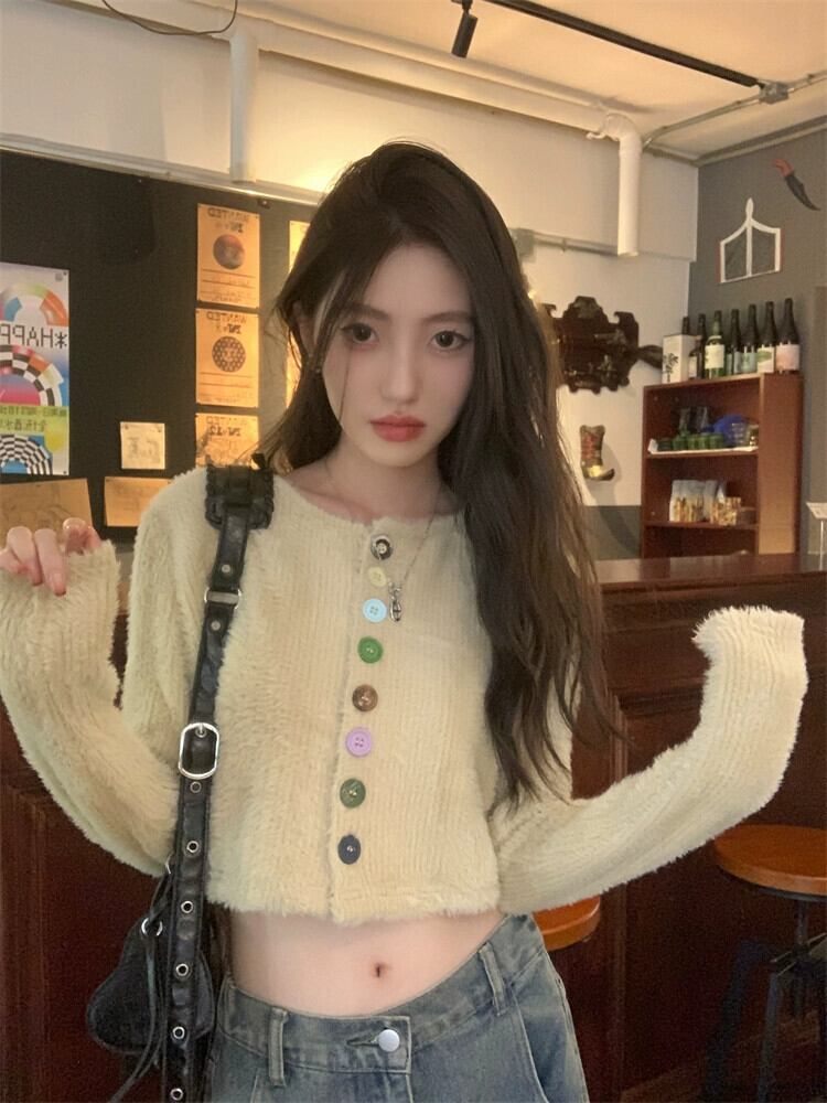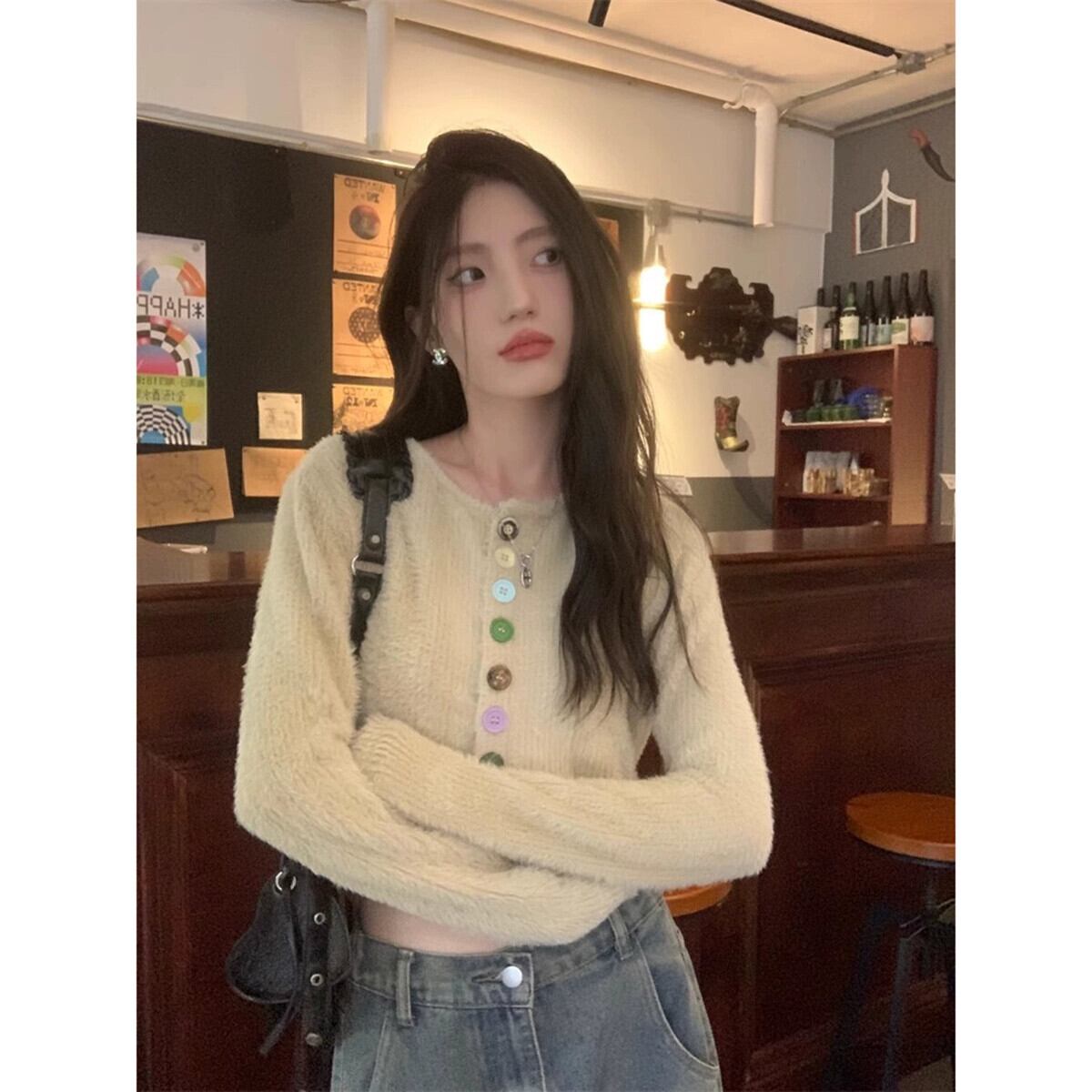 春と秋バージョン 2024 新作ゆったり、ファッショナブルで多用途なショートスタイルのカラフルなボタンデザイン長袖セーター女性 ロング スプリング 春物 オータム 秋物 missk7650037297