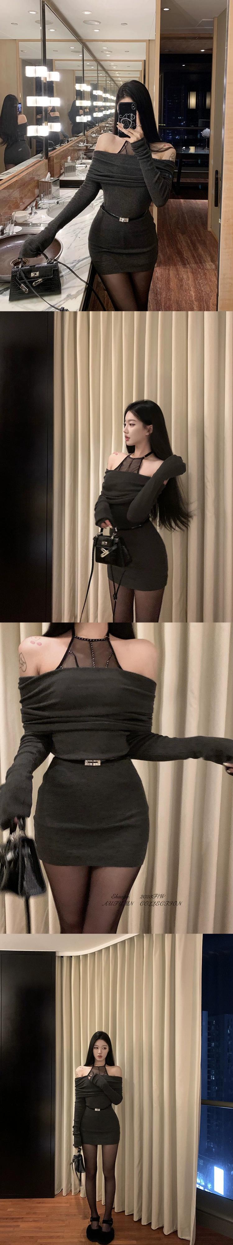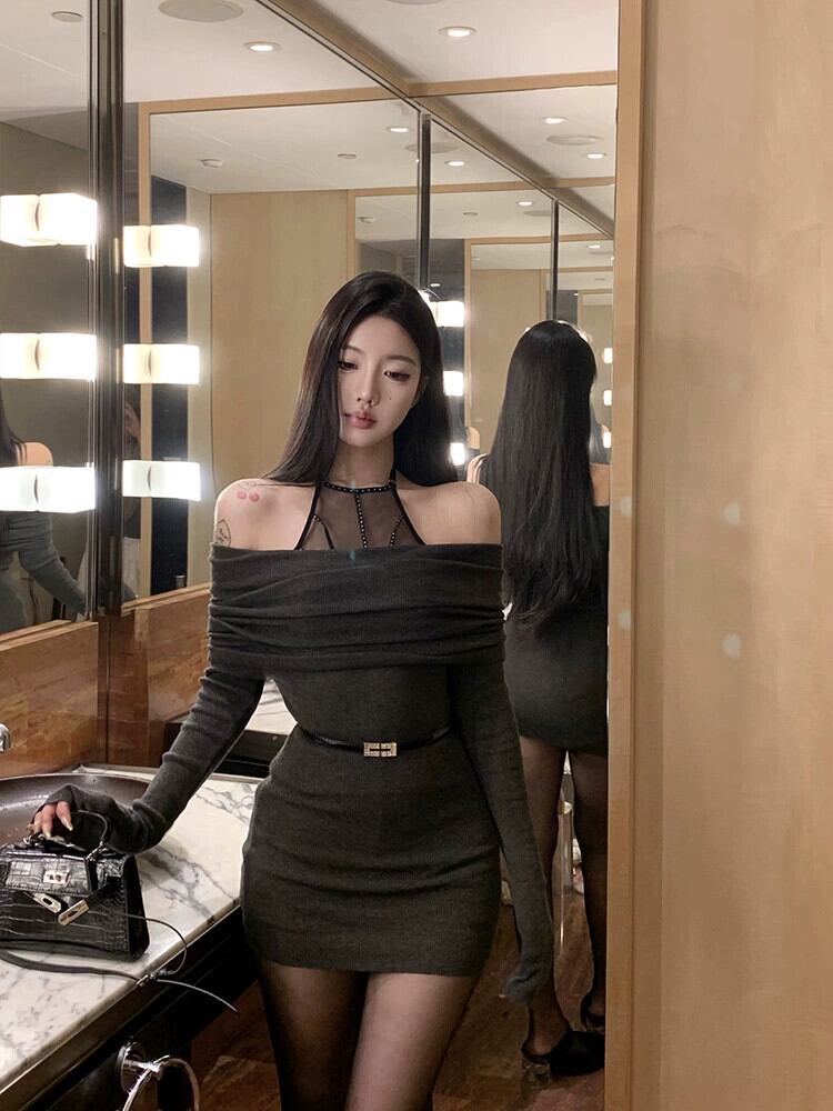 ワンショルダーニットドレス女性春と秋 2024 新しいレトロ香港スタイルスリムスリム長袖ヒップカバーショートスカート ロング スプリング 春物 オータム 秋物 missk71379113698