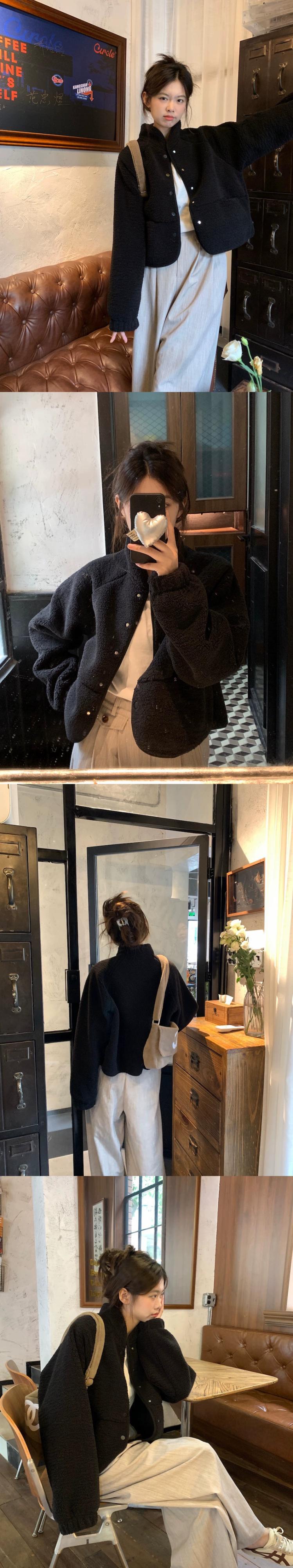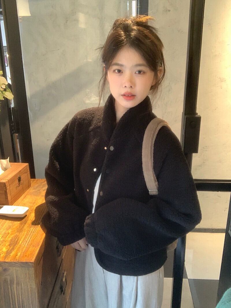 メイラード模造ラムウールコートの女性の春バージョン 2024 新しい厚く暖かいスタンドアップカラールーズ長袖トップ ロング スプリング 春物 missk2388926871
