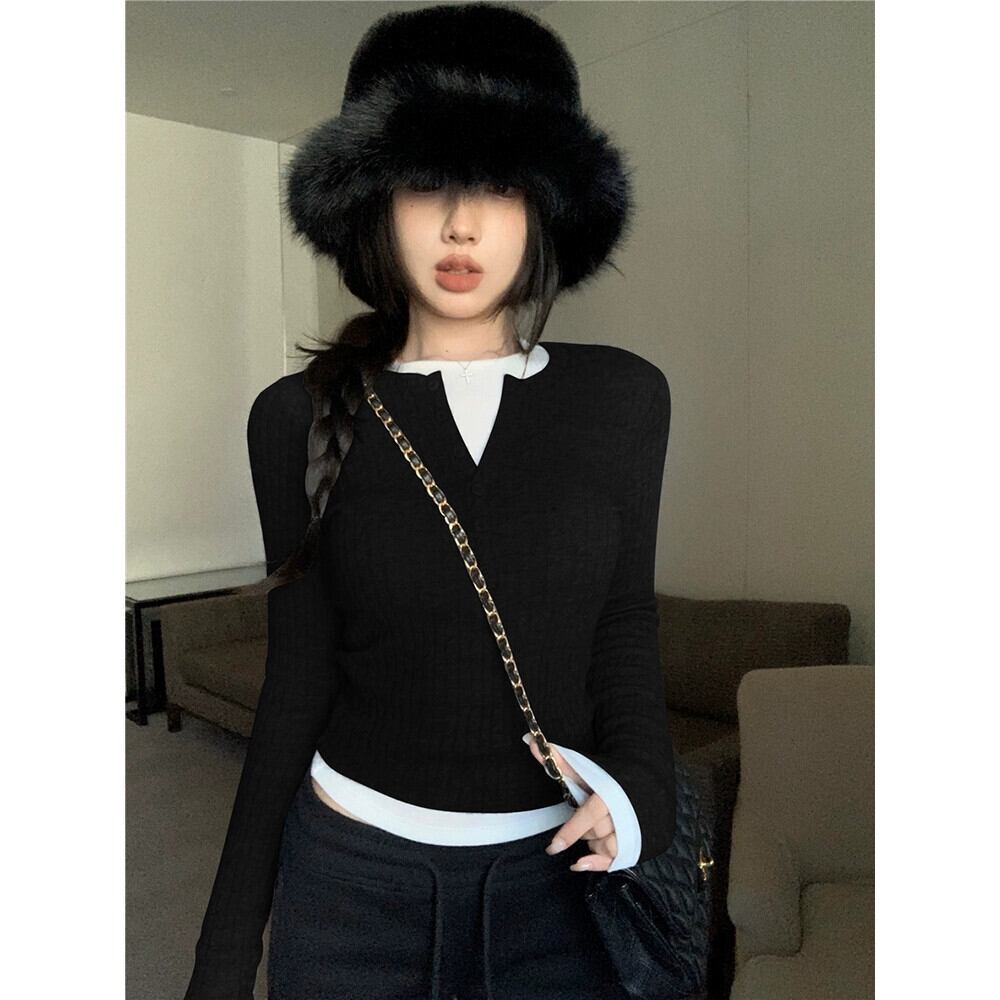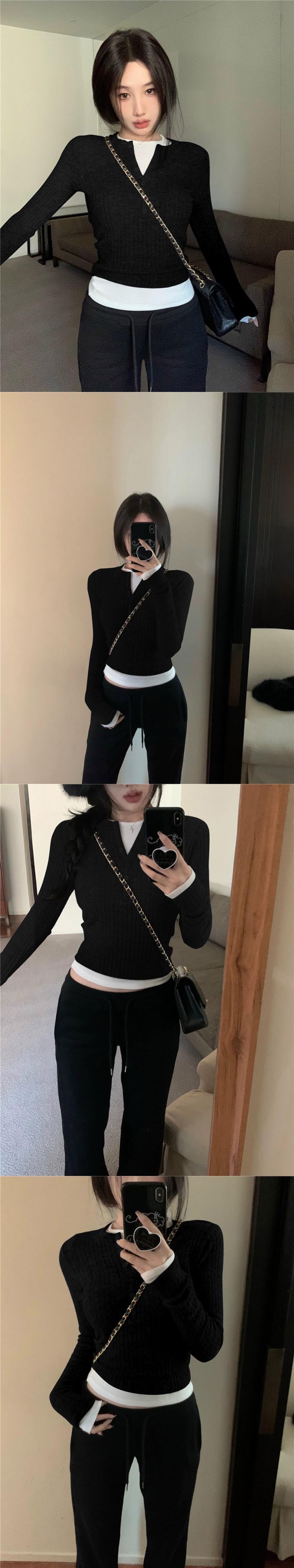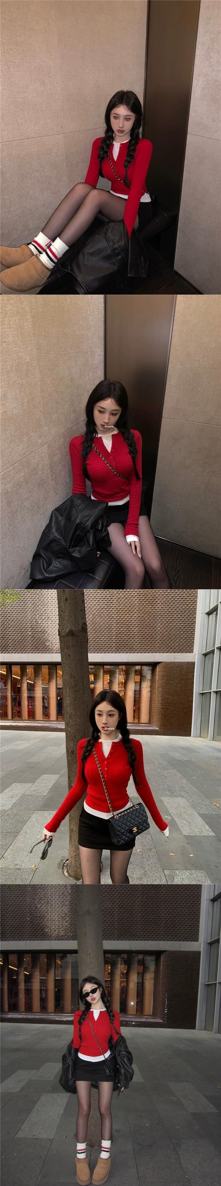 甘い層状 V ネックショートスリム長袖 Tシャツ底セーター女性春と秋 2024 新しいファッションスーツ ロング レッド 大人ガーリー スウィート キュート カジュアル スプリング 春物 オータム 秋物 Vネック missk31901935108