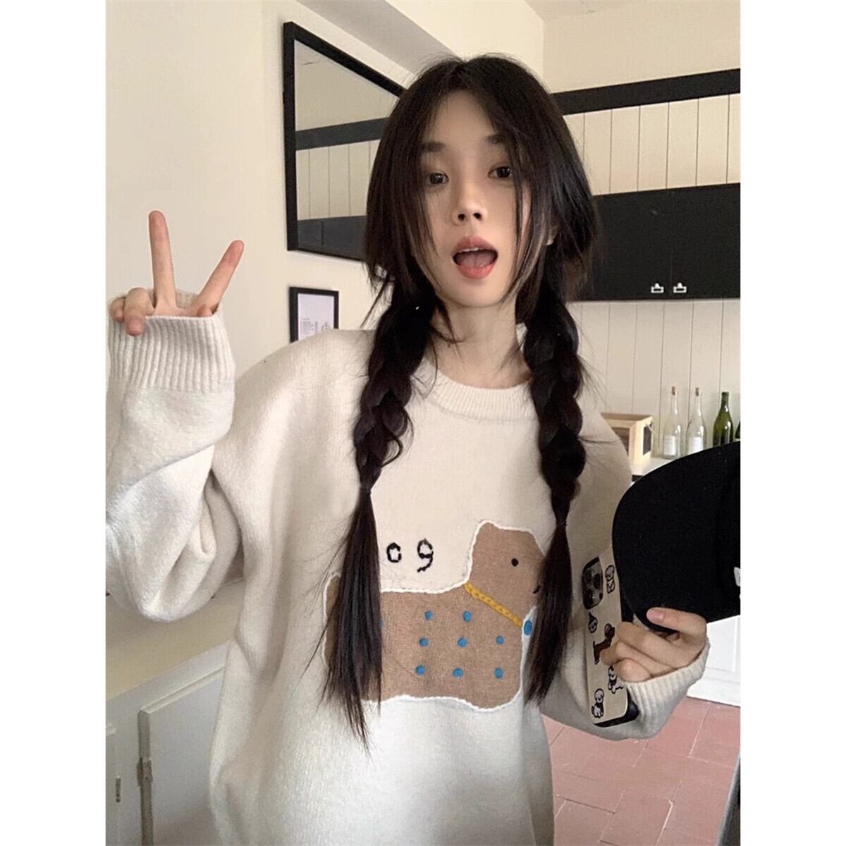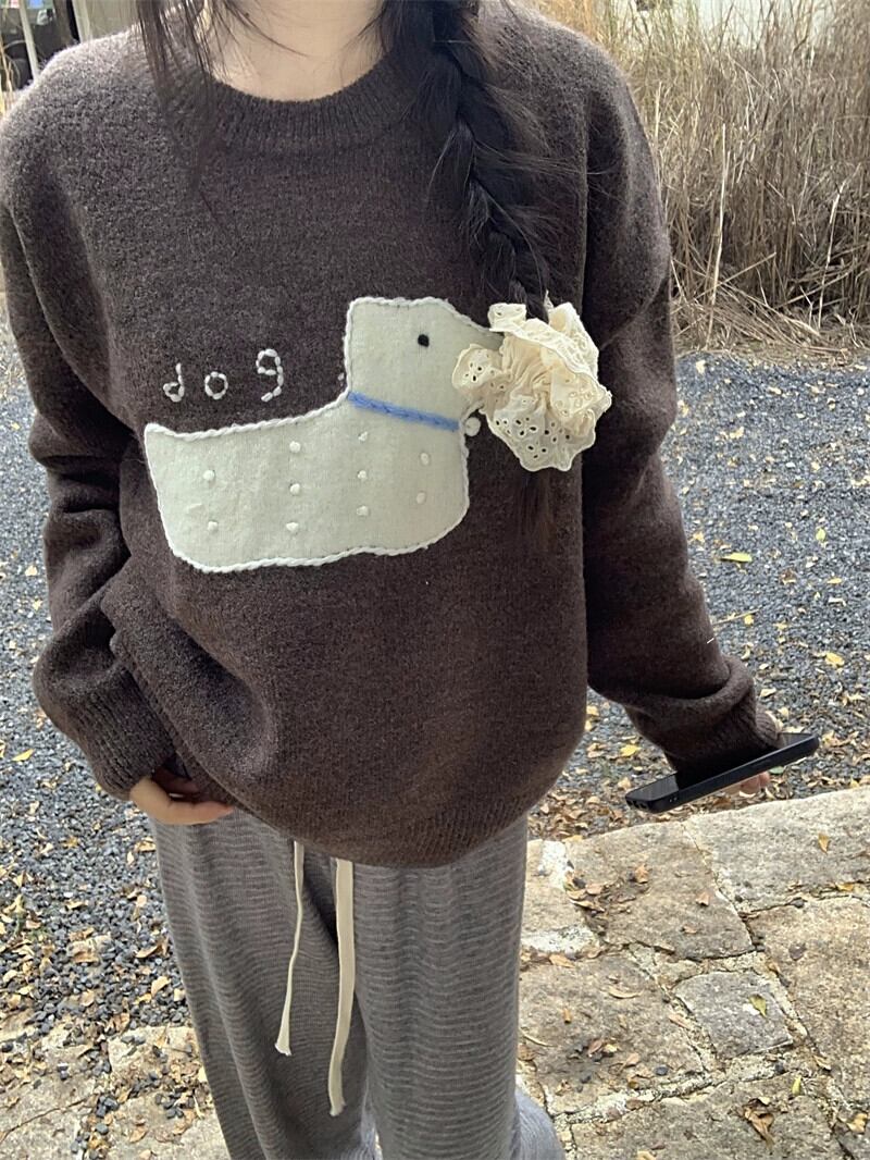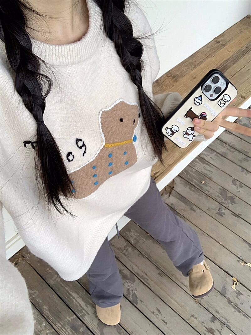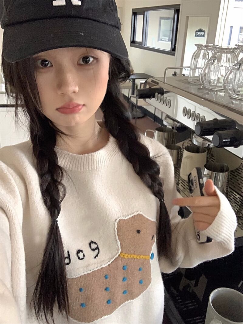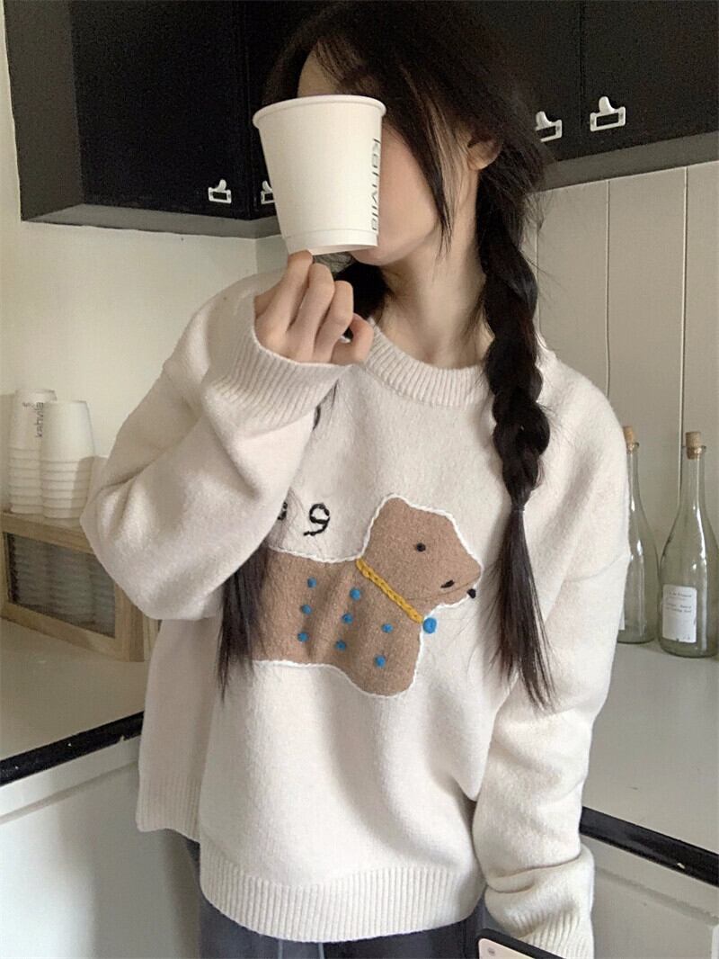 甘い犬刺繍セーター女性春と秋 2024 新しいソフトとワックスのようなルーズデザイン多目的長袖ニットトップ ロング レッド 大人ガーリー スウィート キュート カジュアル スプリング 春物 オータム 秋物 missk46479437795