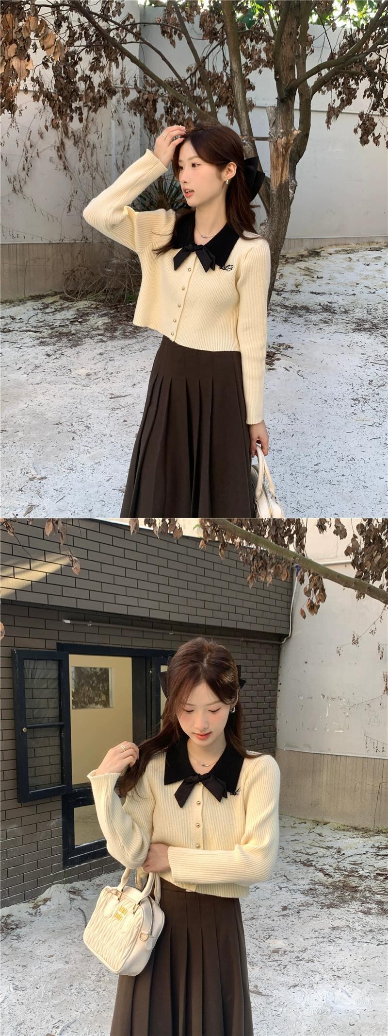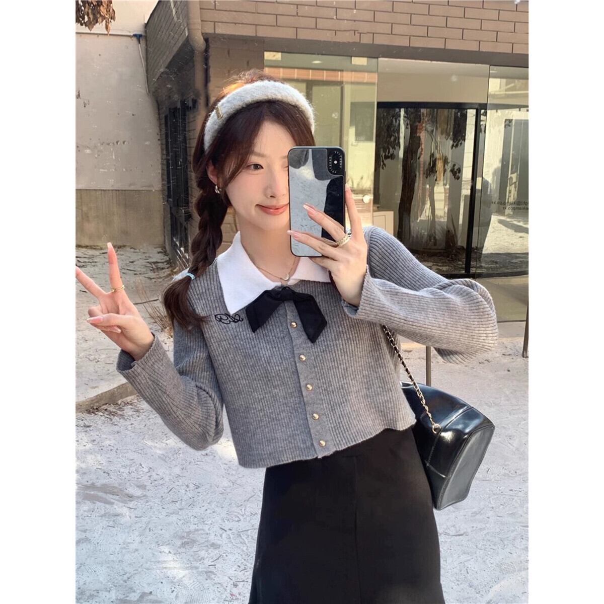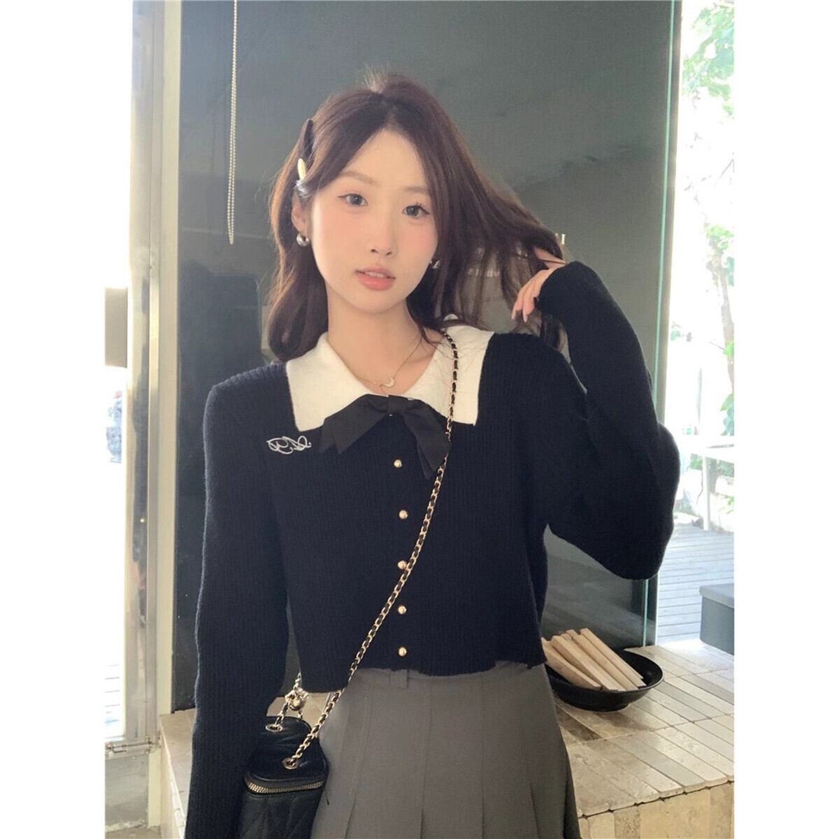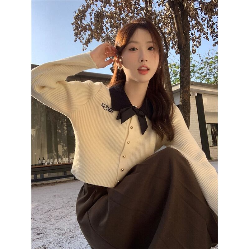 Xiaoxiangfeng リボンニットカーディガン女性の春と秋 2024 コントラストカラーラペルショートルーズ長袖セーター ロング スプリング 春物 オータム 秋物 missk33012094662