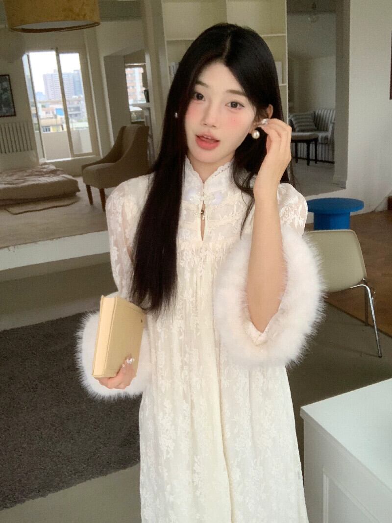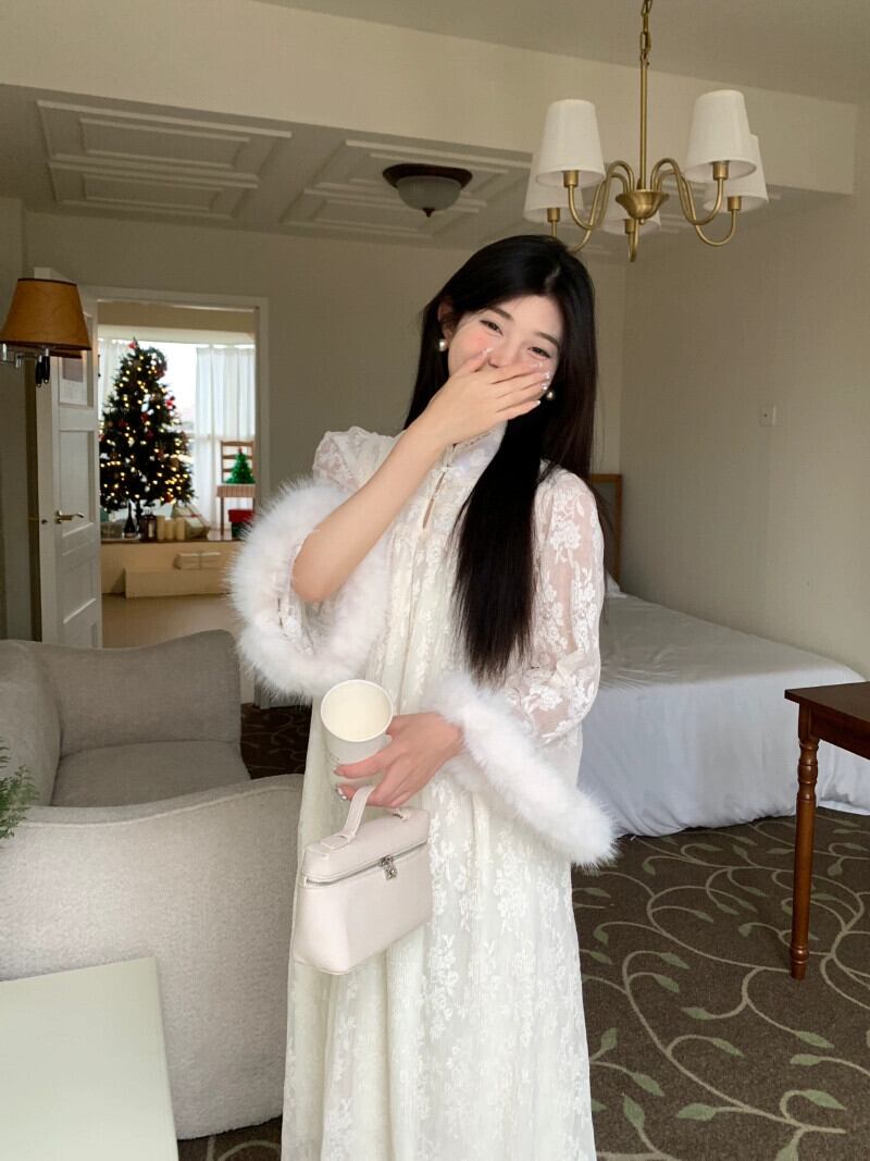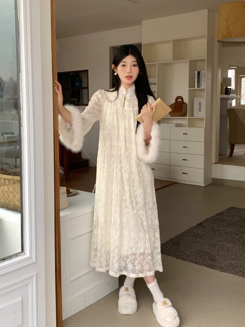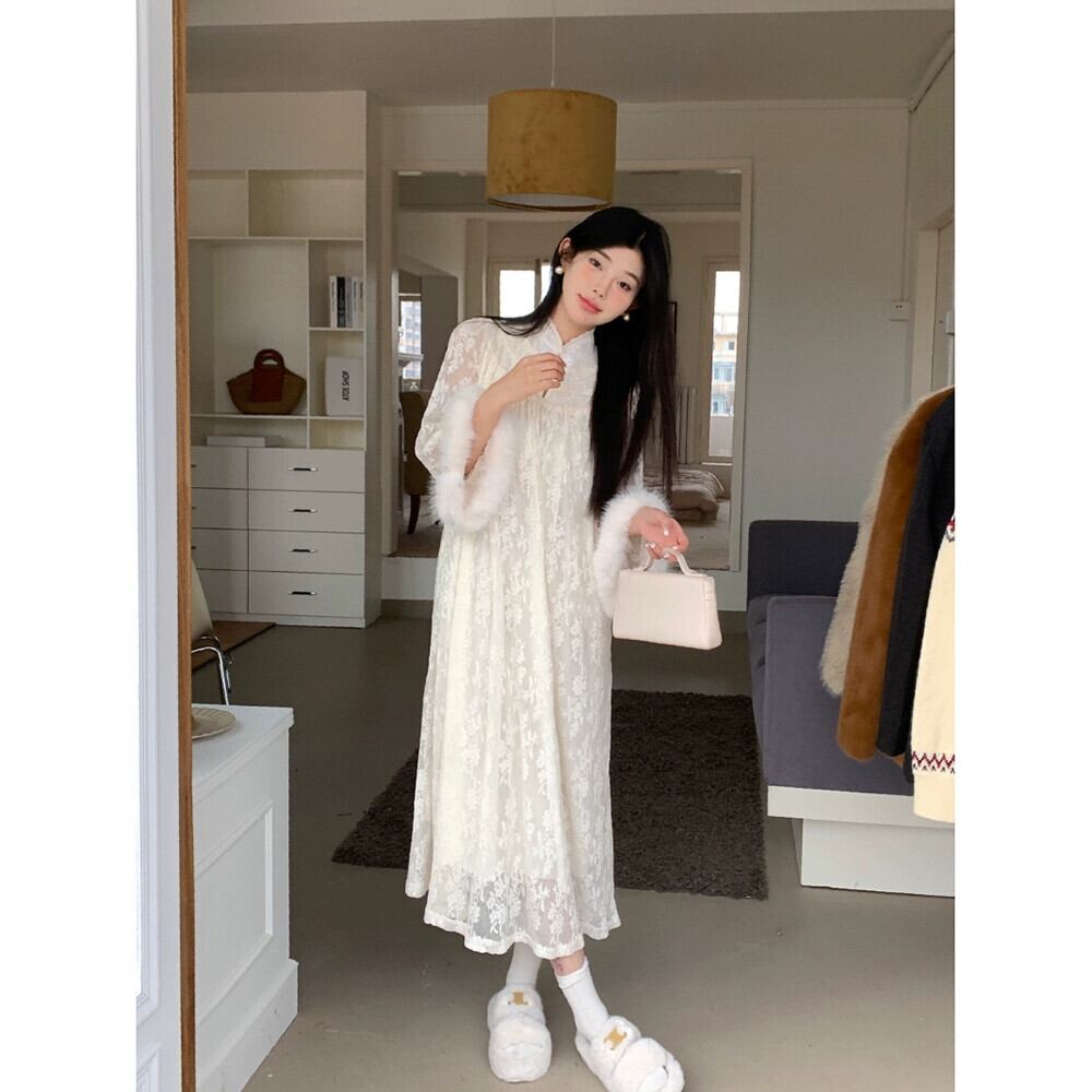 中国風のレースのドレスの女性の春と秋のスカート 2024 新しいスタイル優しいスタイルぬいぐるみベルベットステッチ長袖底スカート ロング スプリング 春物 オータム 秋物 missk39752951022