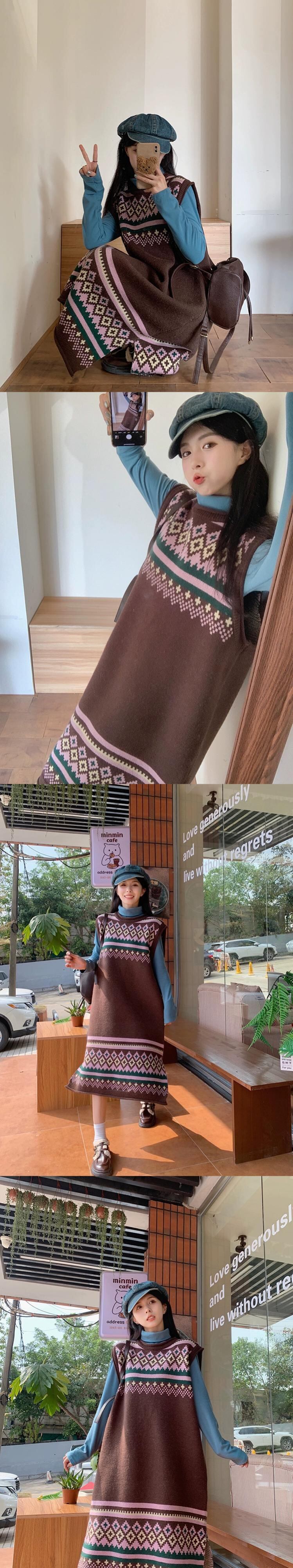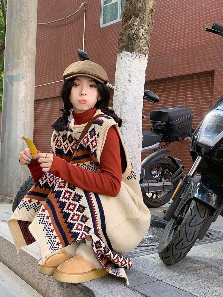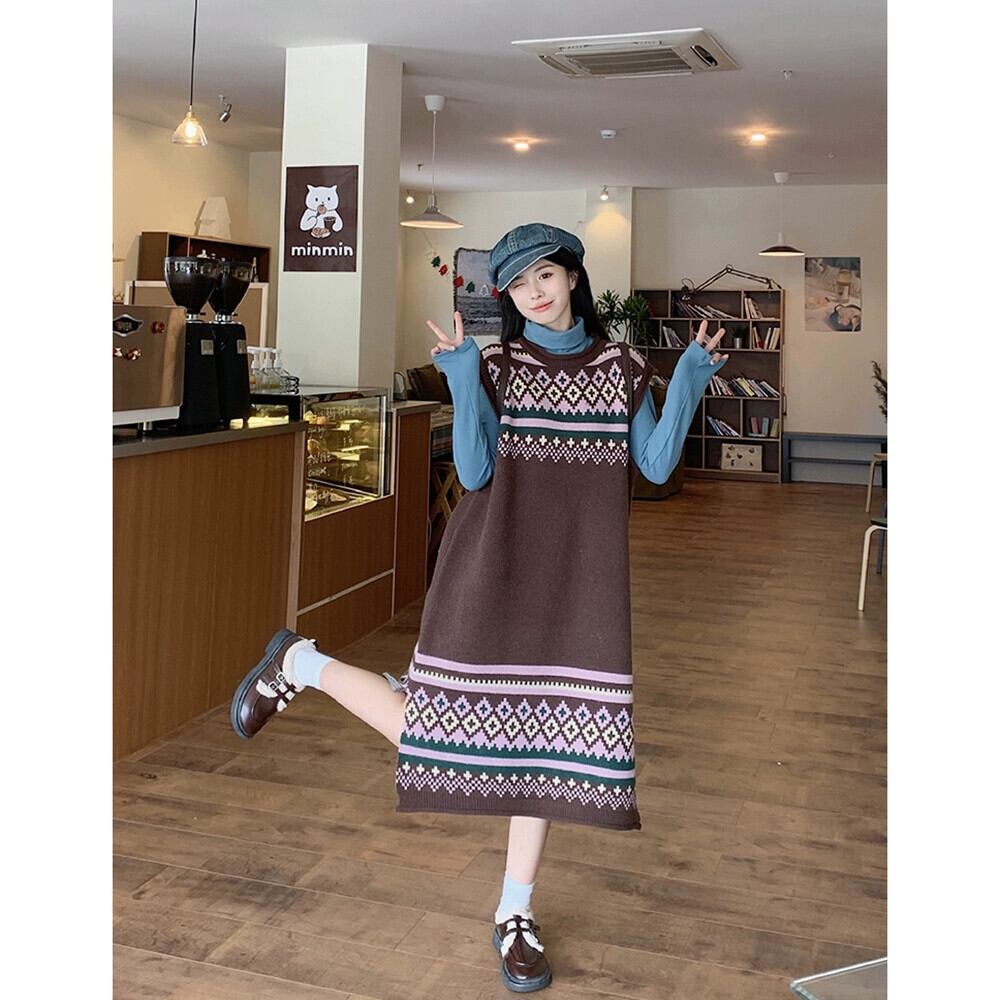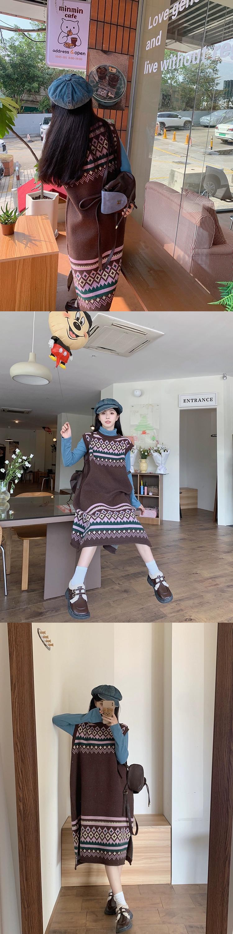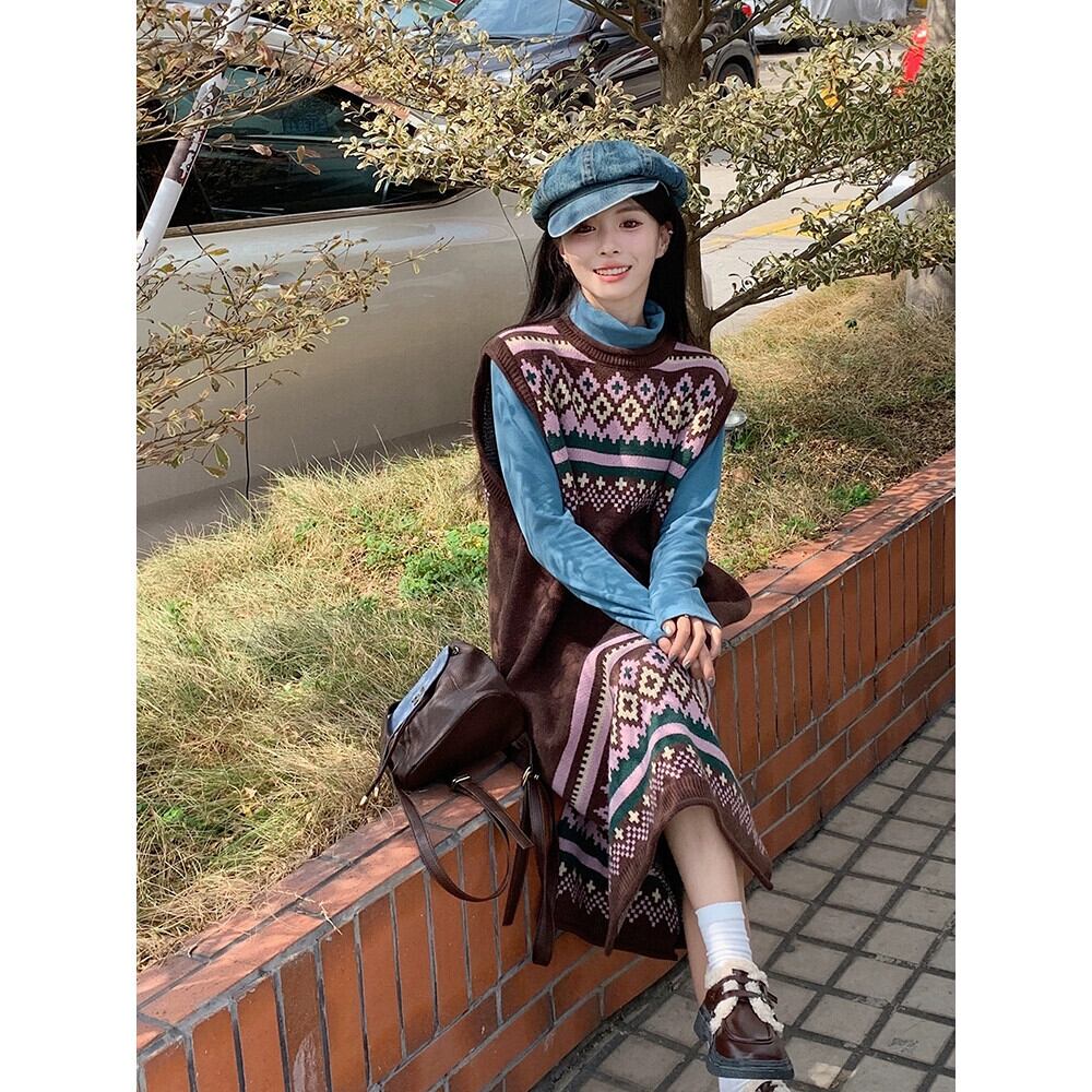 レトロ菱形ジャカードニットドレス女性春と秋 2024 新しい層状ミッドレングス肥厚セーターベストドレス レッド スプリング 春物 オータム 秋物 missk57766529602
