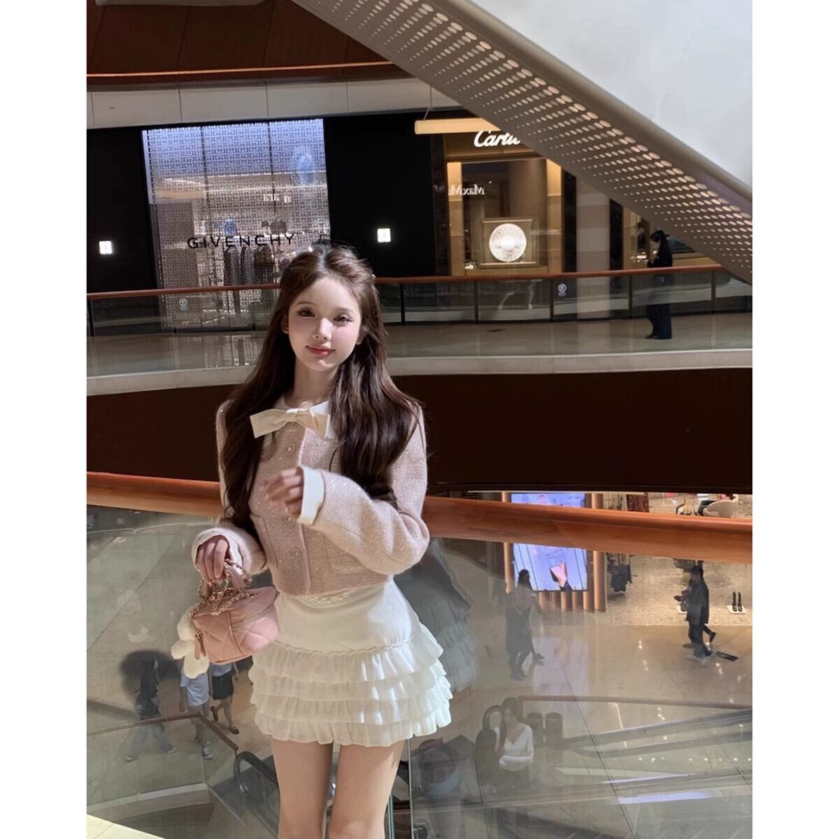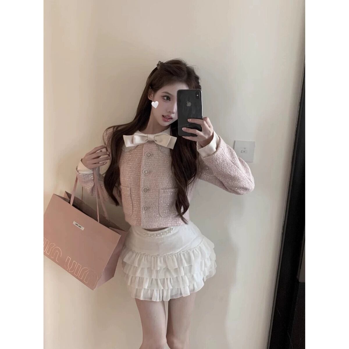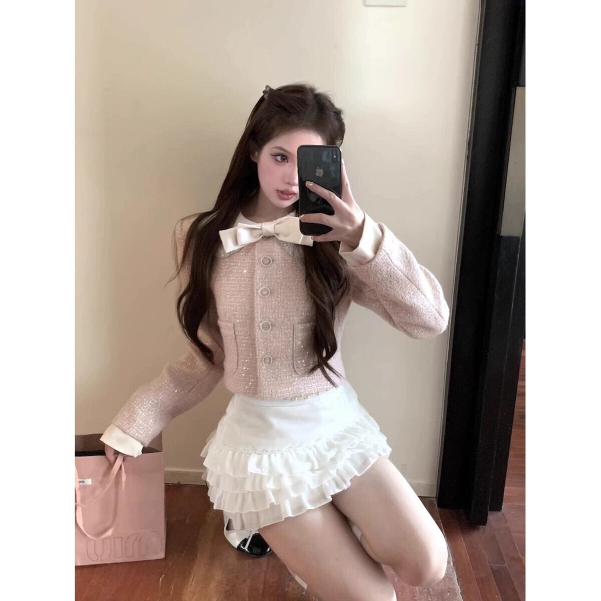 小さな香りの弓と年齢を軽減する美しいショートコートふわふわケーキ女性春と秋の 2024 新しいファッション 2 点セット リボン スプリング 春物 オータム 秋物 missk69195640089