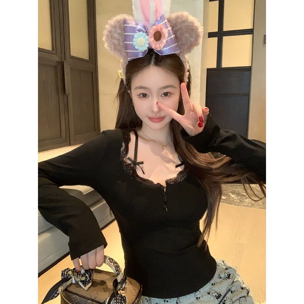 純粋な欲望スタイルの長袖シックな Tシャツの女性の春と秋のファッションスリムレーススプライシングショートインナーレイヤリングトップ ロング スプリング 春物 オータム 秋物 missk16380824374