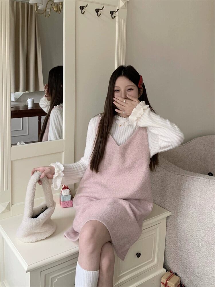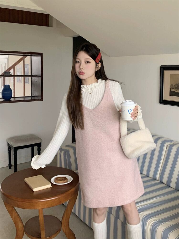 色:ピンクのサスペンダードレス,アプリコットボトムスシャツ