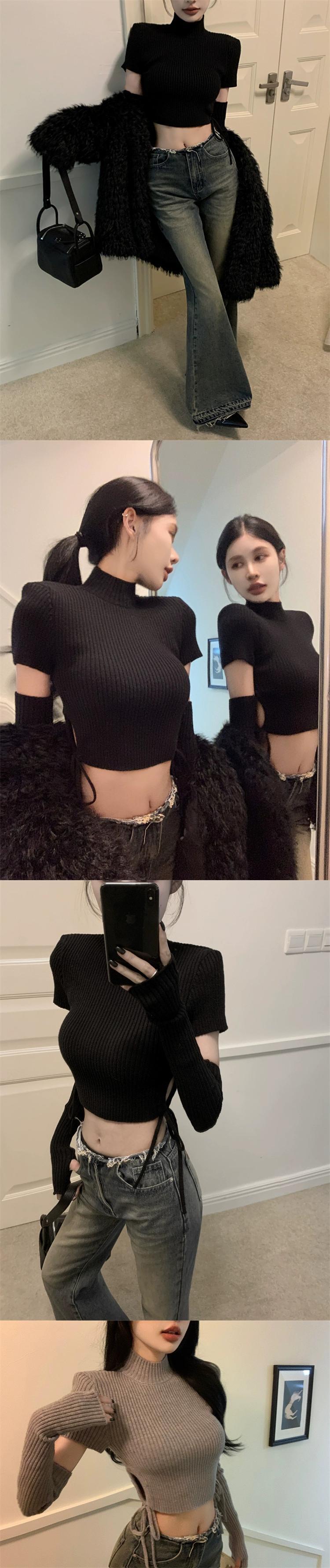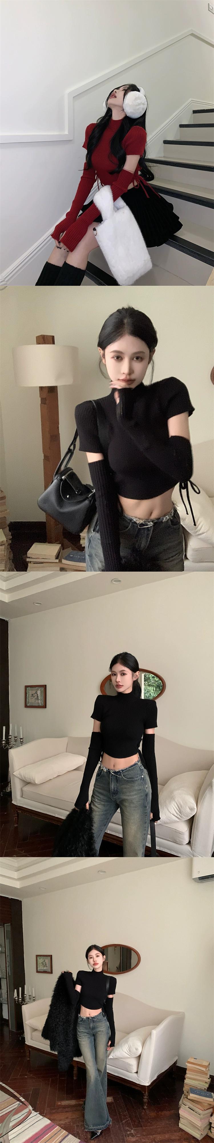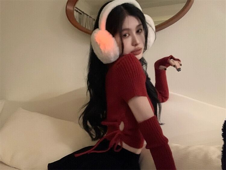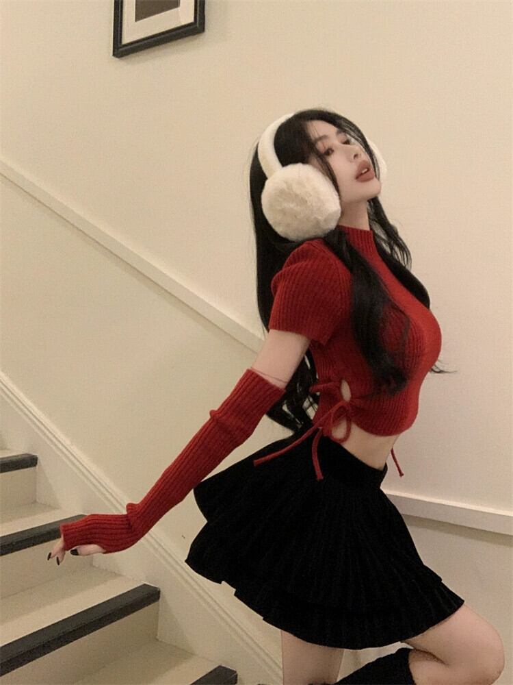 純粋な欲望の赤い長袖セータートップ女性の春の新デザイン巾着スリーブショートセーター ロング レッド スプリング 春物 missk17841362094