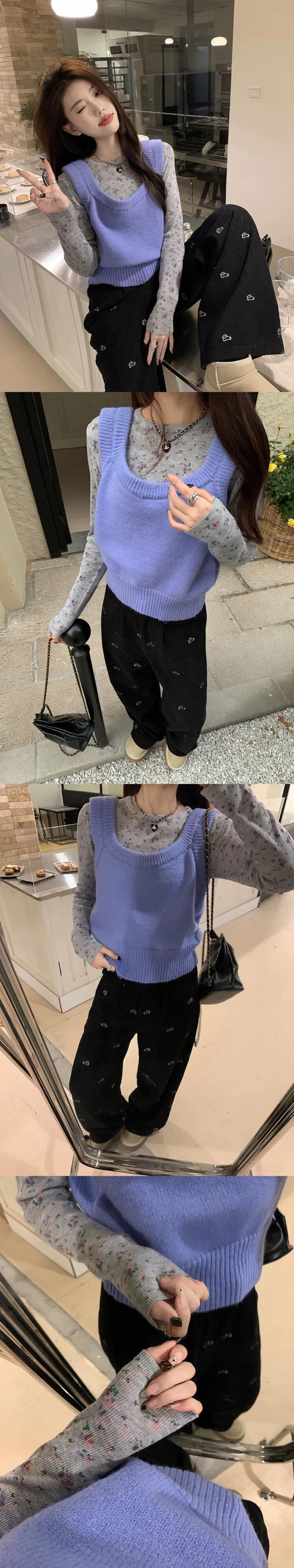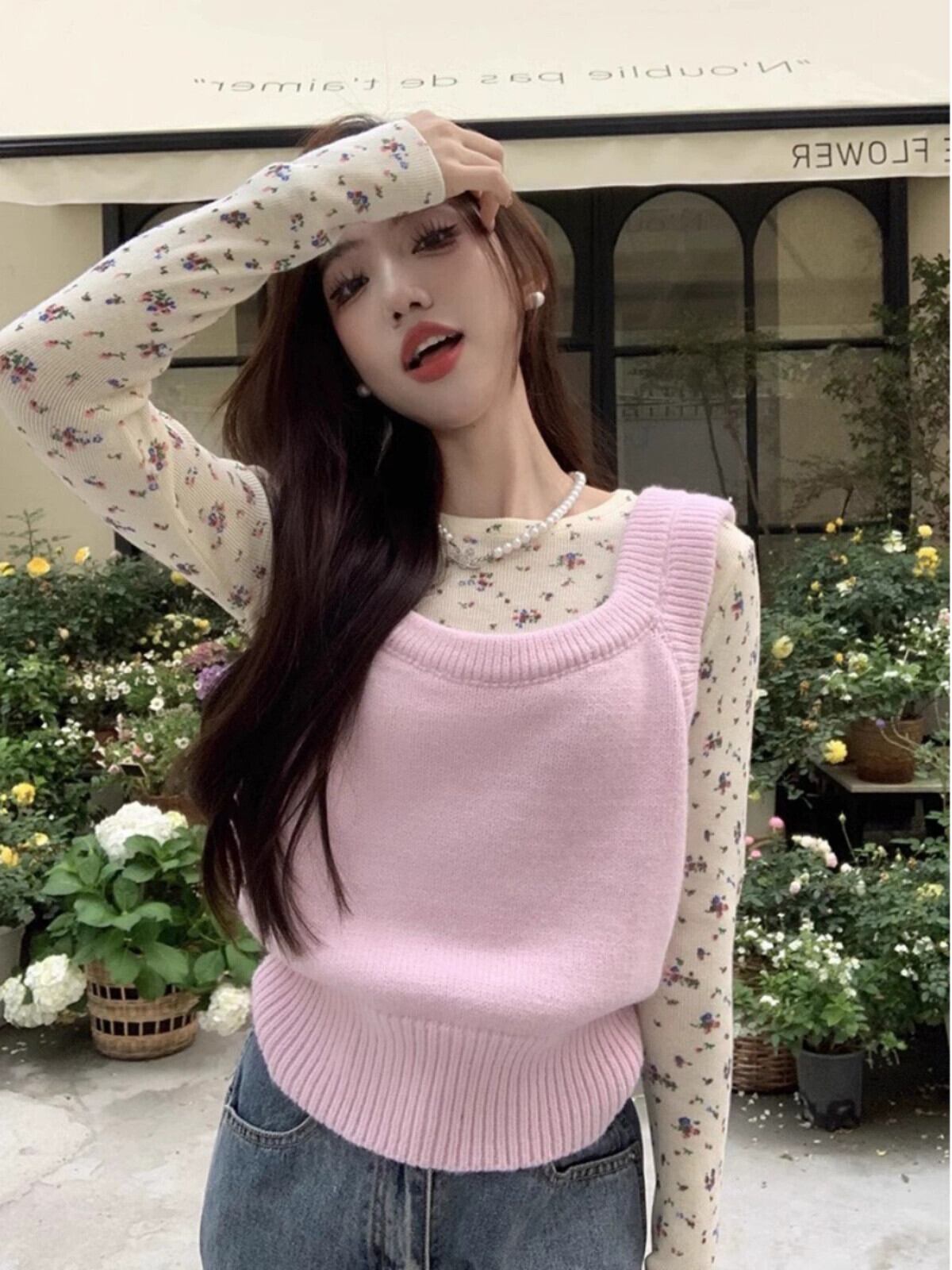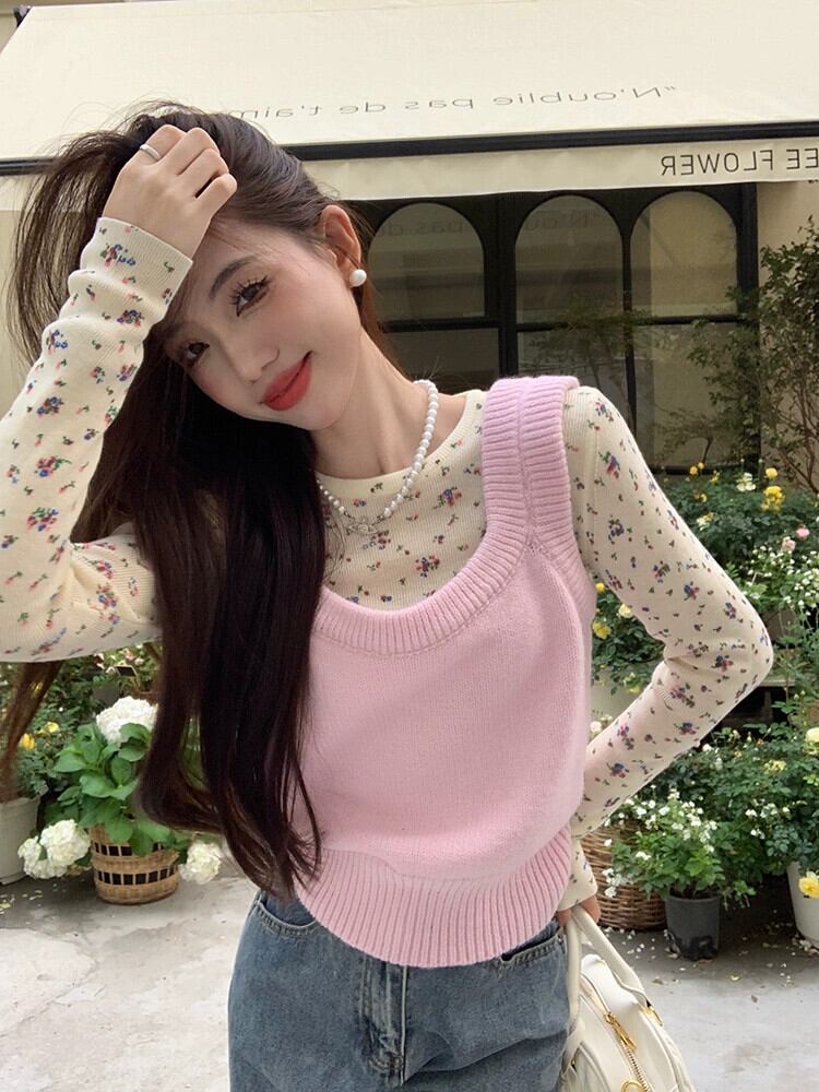 甘いスタイルのスーツの女性春ピンクのニット セーター ベストと花柄の底 T シャツ 2 点セット小人を積み重ね 大人ガーリー スウィート キュート カジュアル スプリング 春物 Tシャツ missk15920559787