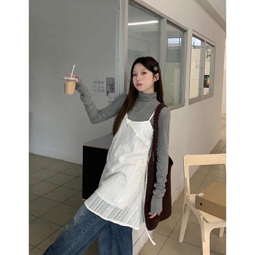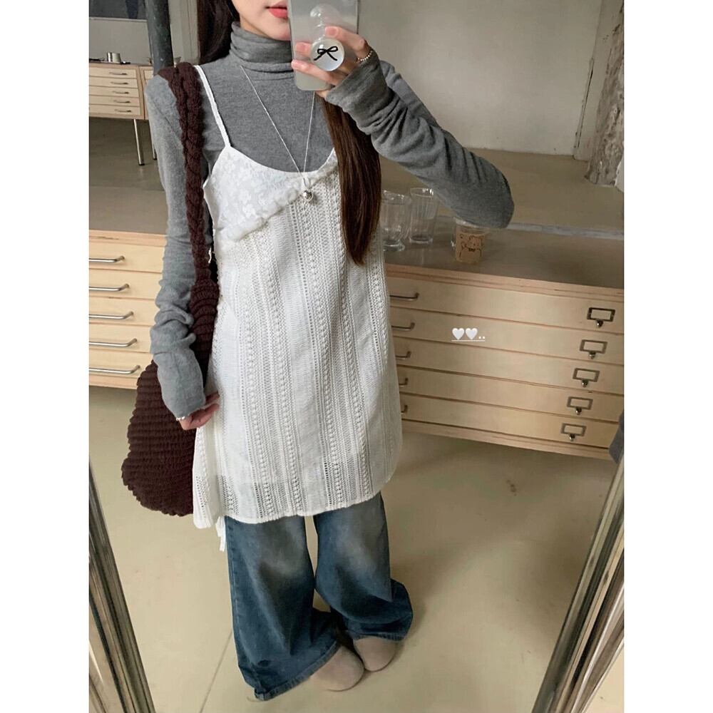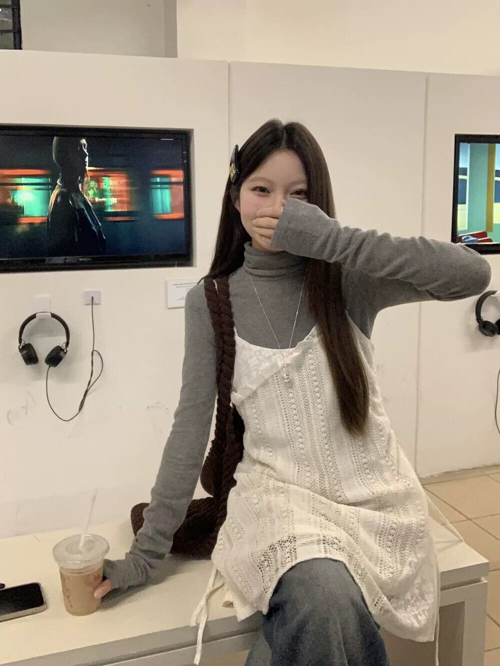 色:グレーのタートルネックT,白いレースのサスペンダースカート