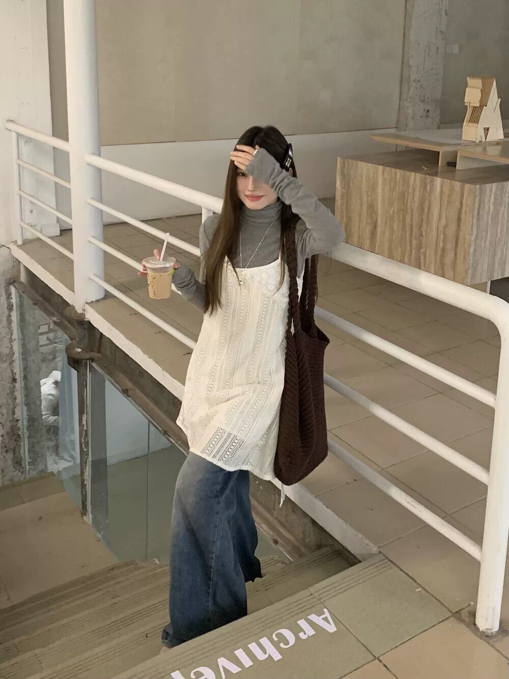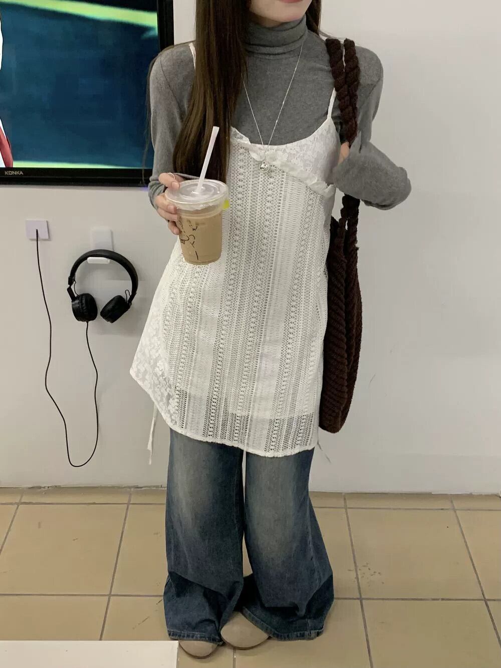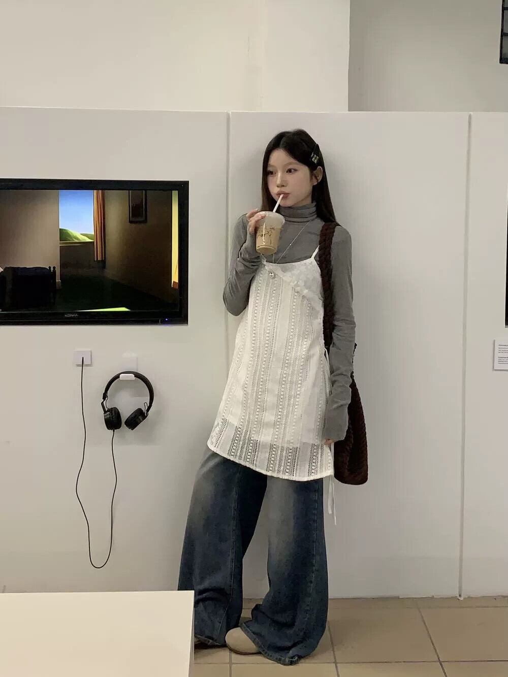 色:グレーのタートルネックT,白いレースのサスペンダースカート