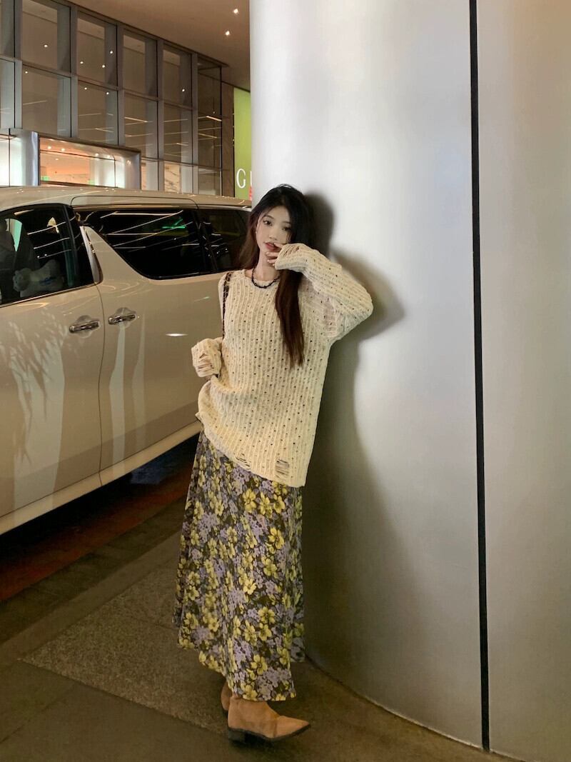 色:アプリコットセーター,花柄ドレス