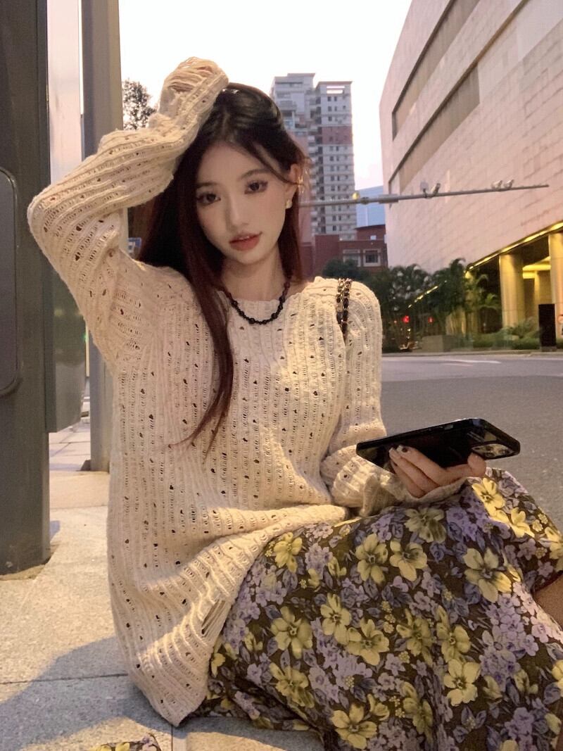 フレンチレトロ花柄サスペンダードレス + 中空長袖セーター女性 2024 春の新しいファッション 2 点セット ロング スプリング 春物 missk78207861856