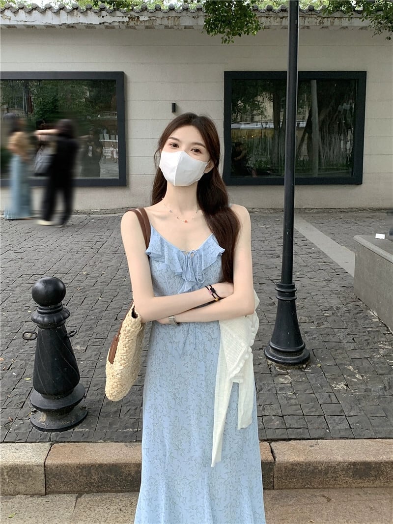 色:ブルーフローラルサスペンダースカート,白いカーディガン