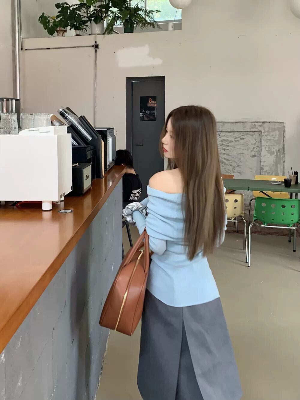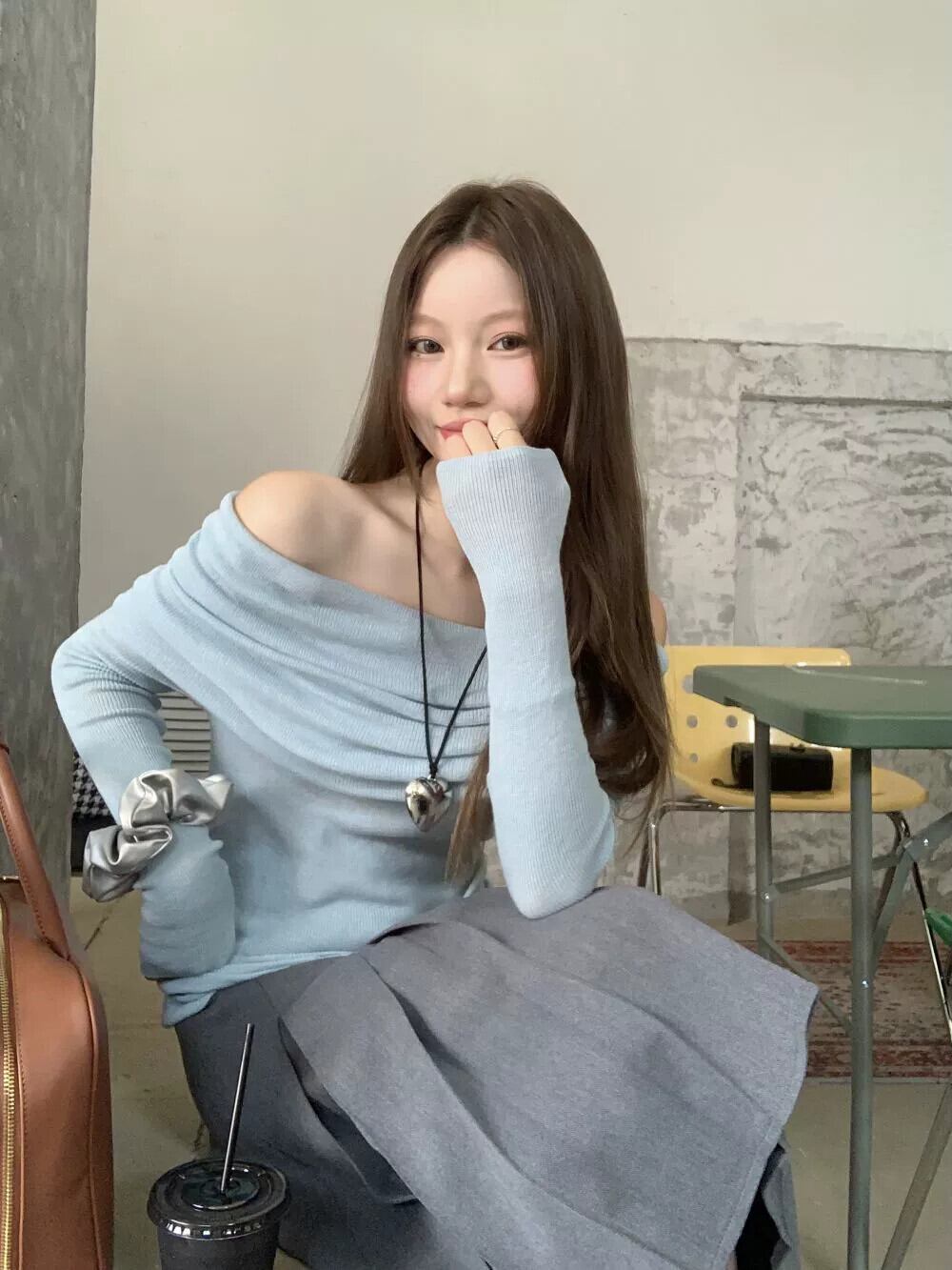 ピュアラストスタイルワンショルダー長袖セーターレディース春デザイン優しいブルーセータースリムオフショルダートップ ロング スプリング 春物 missk63688499055