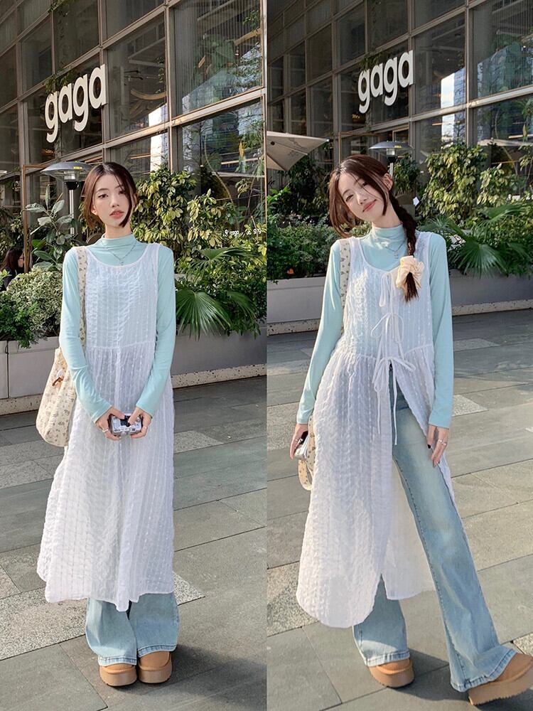 色:白いベストスカート,ミントグリーンのボトムスシャツ